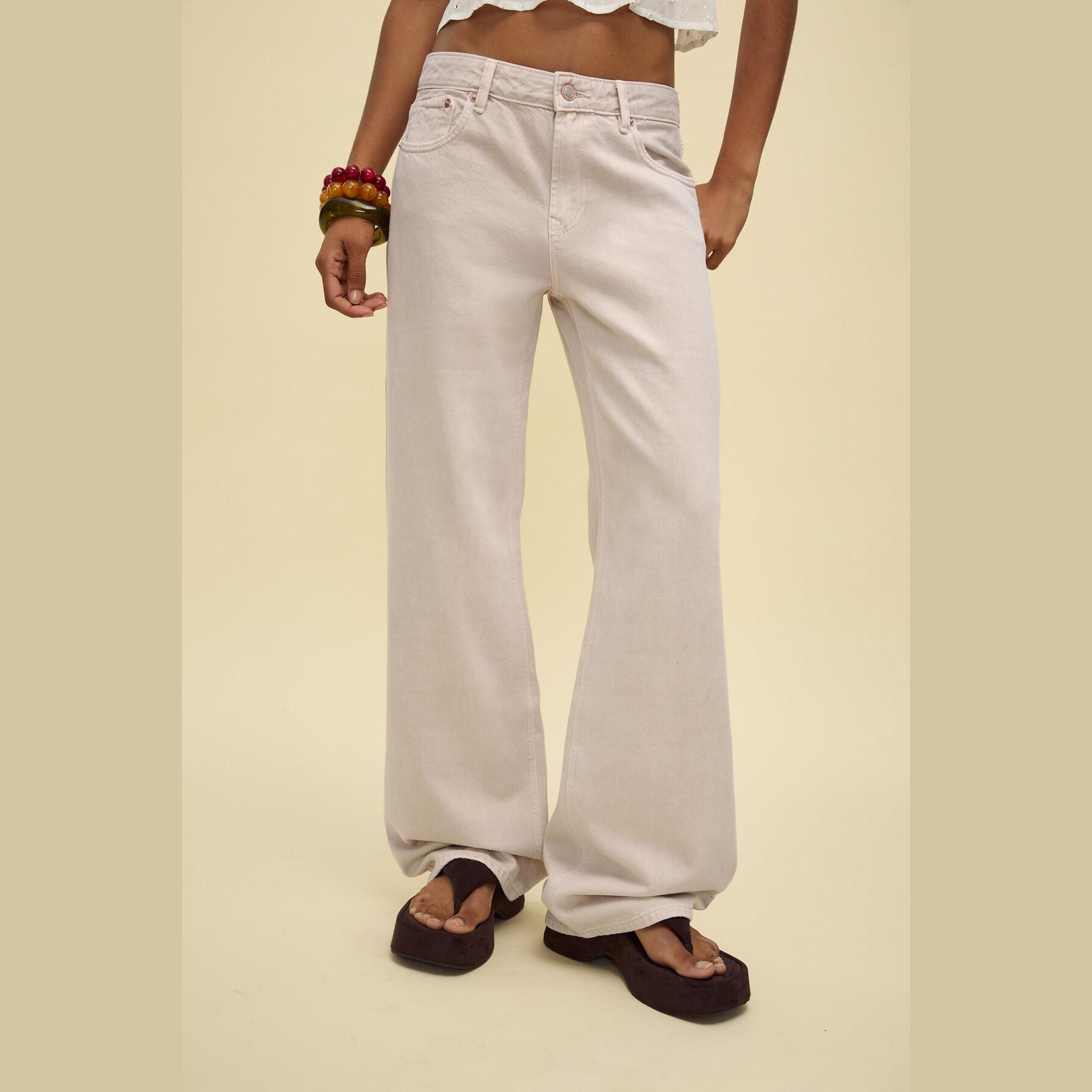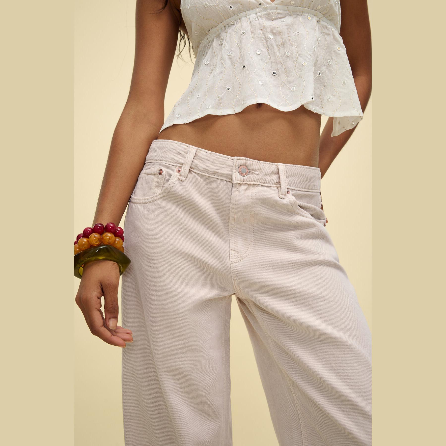 بنطال جينز D91 بقصة مستقيمة واسعة وخصر منخفض – كريمي مضلع من Stradivarius