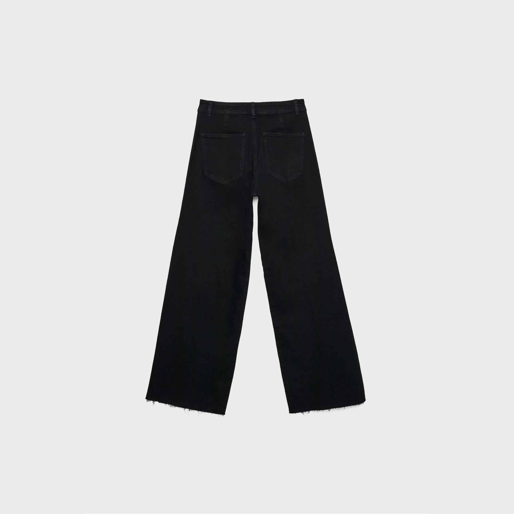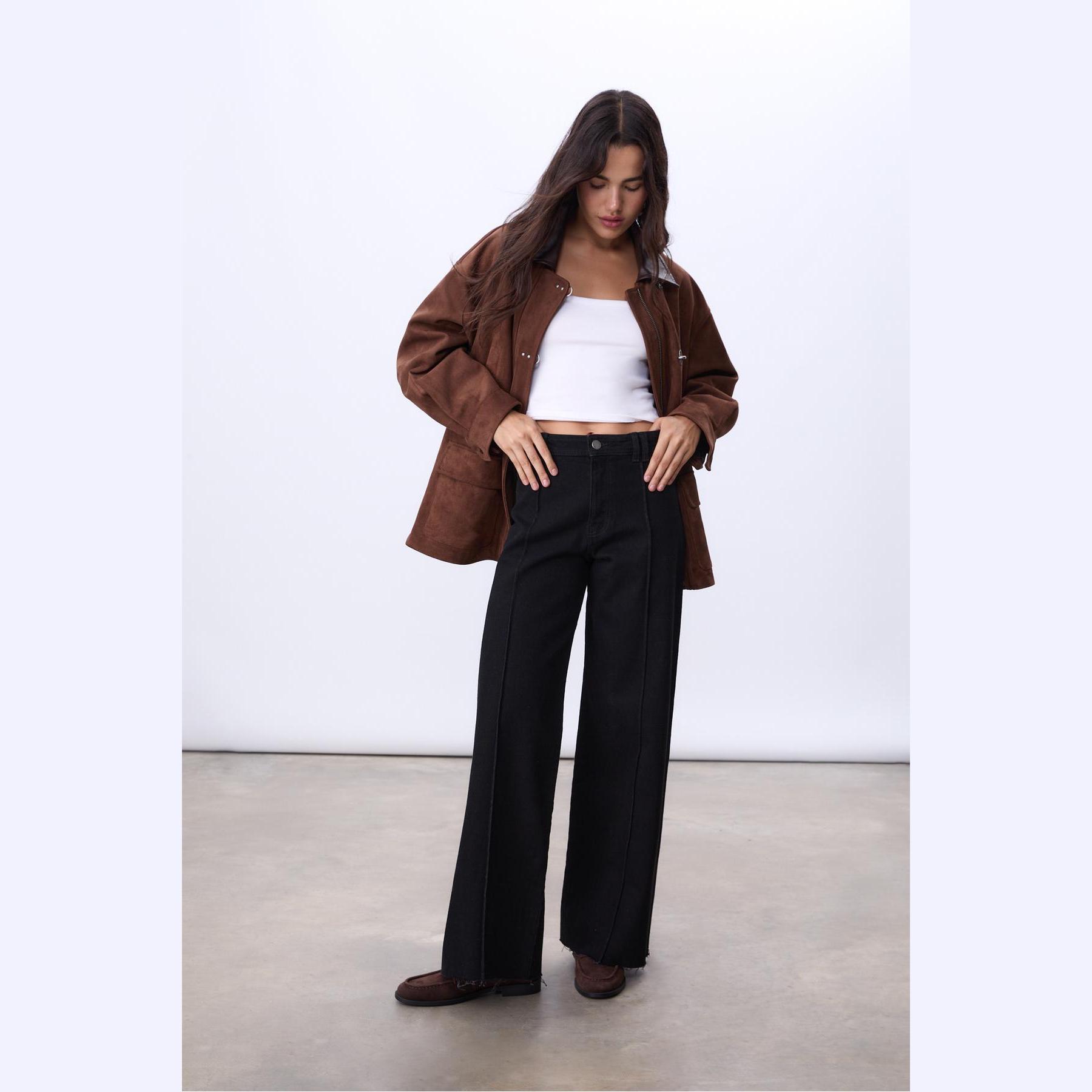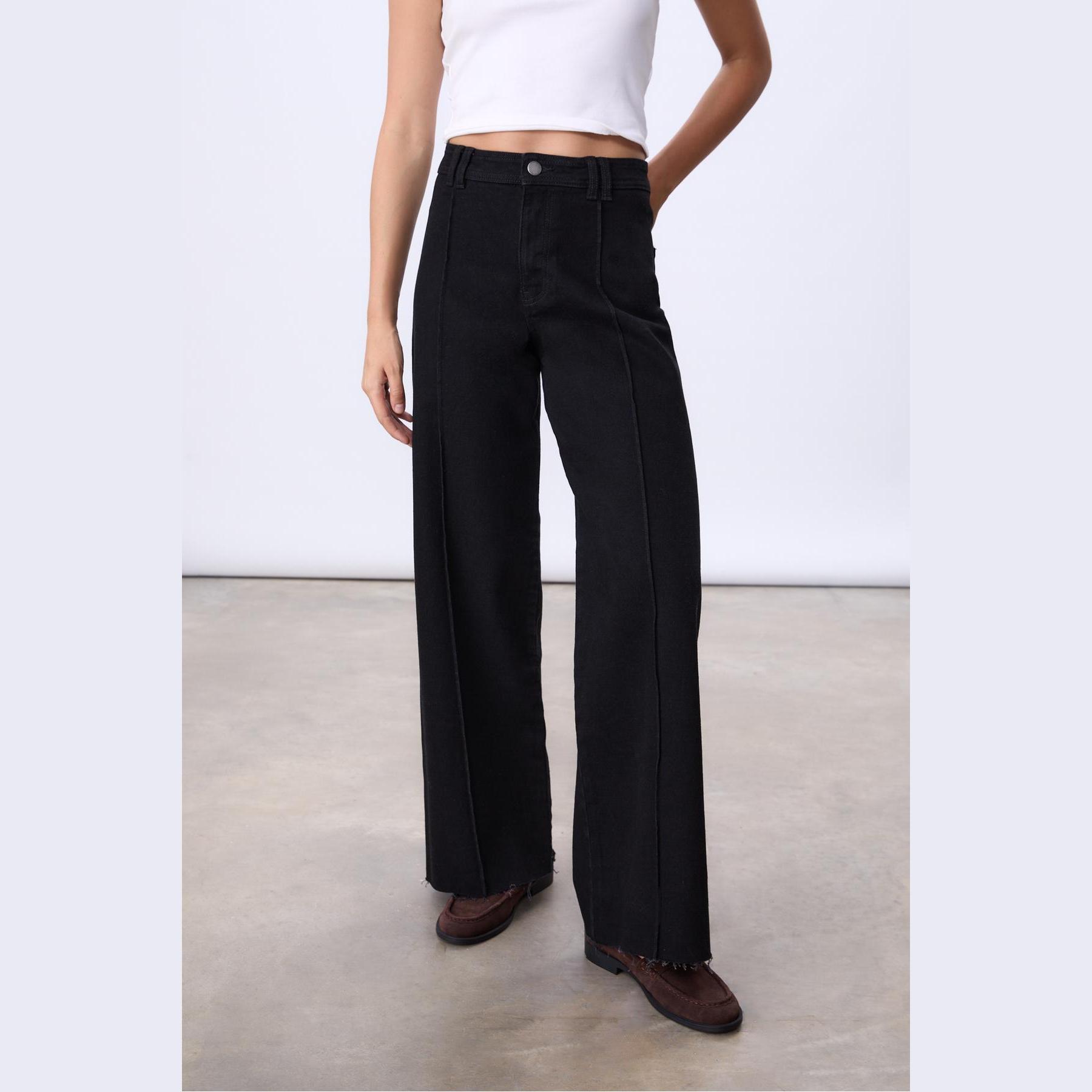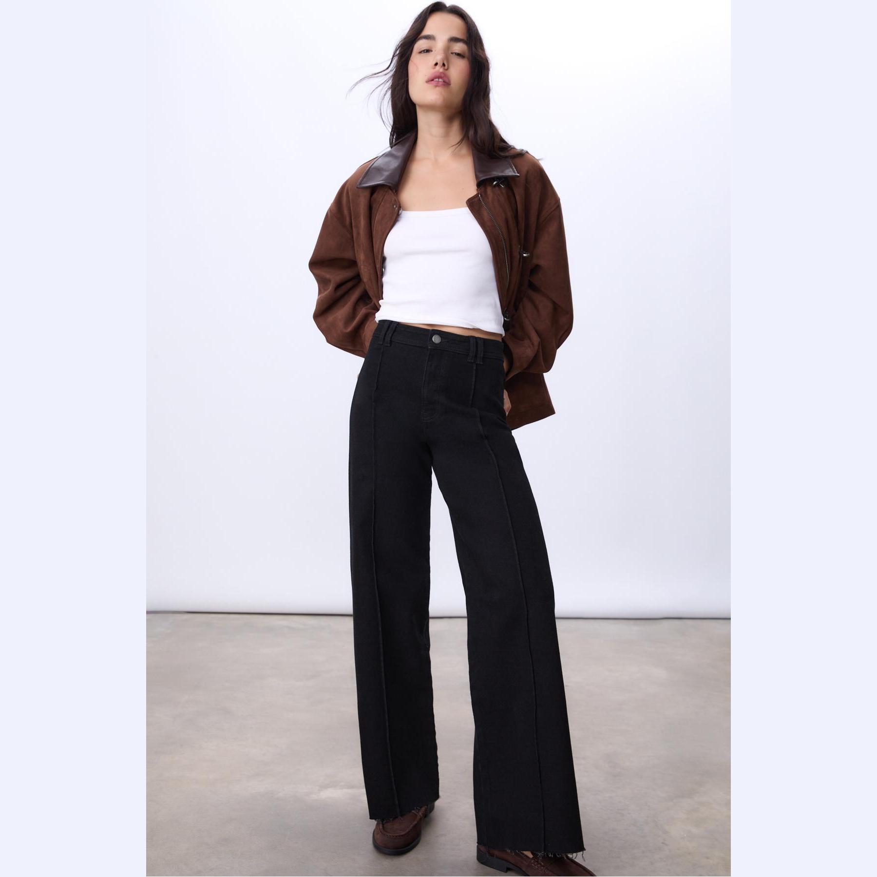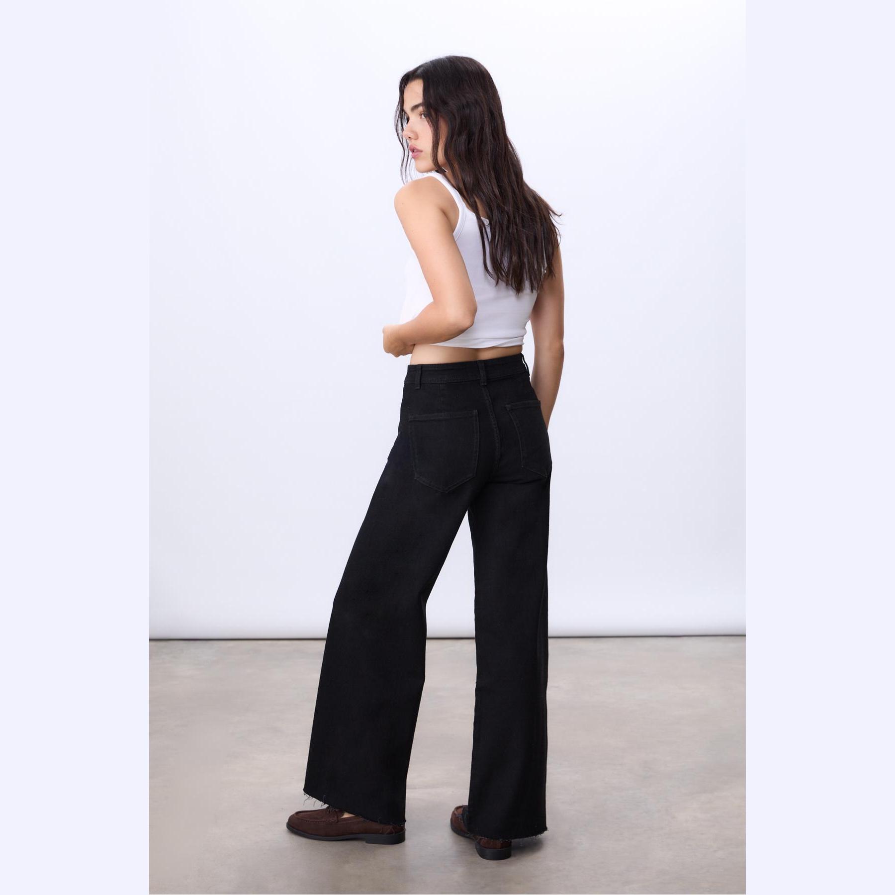 بنطال جينز أنيق من Stradivarius بلون اسود، مصنوع من خامة قطنية بنسبة 99% مع 1% إيلاستان لمرونة خفيفة، يتميز بقصة واسعة الساق (Wide Leg) وخصر عادي، مزود بإغلاق أمامي بسحاب وزر معدني، تصميم بخمسة جيوب عملية، حلقات حزام، ودُرز طولي أمامي يضفي لمسة تصميمية مميزة، مع أطراف سفلية غير مطوية بتشطيب خفيف، مثالي للتنسيق مع توبات قصيرة أو جاكيتات لإطلالة كاجوال مريحة وعصرية.