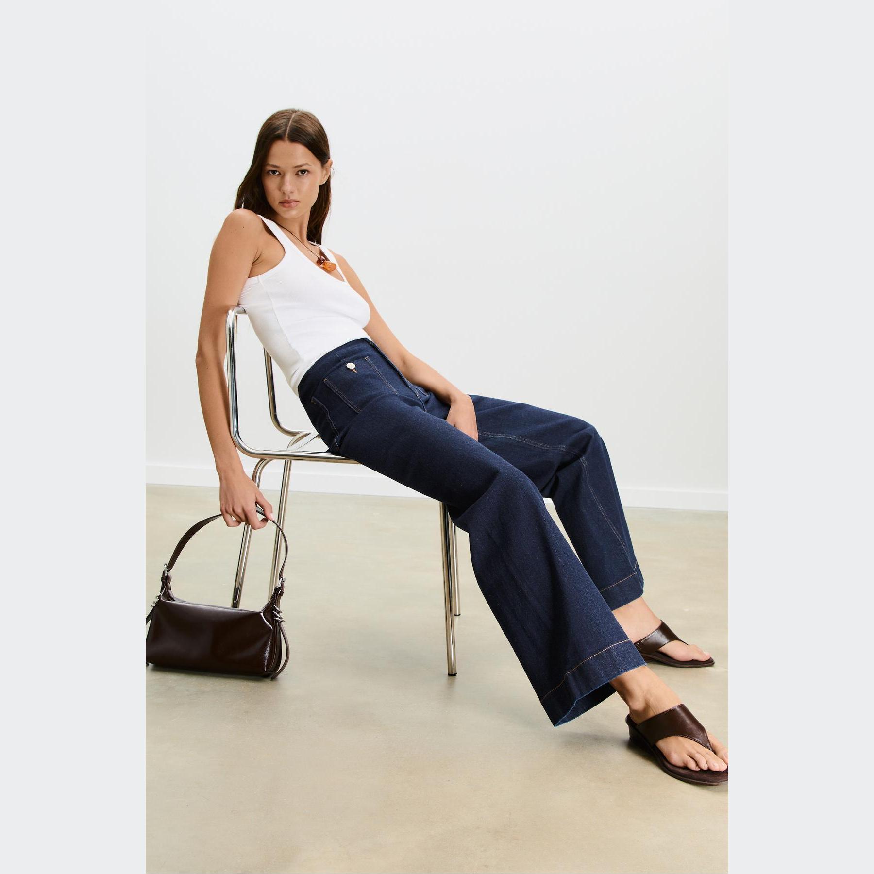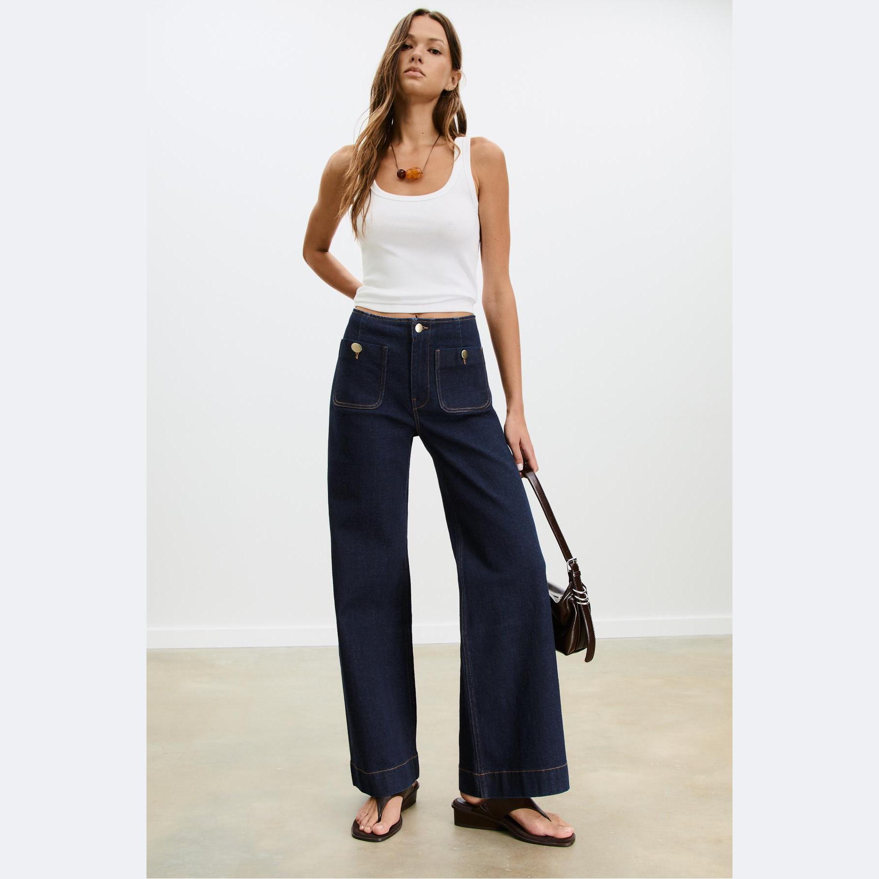 بنطال جينز أنيق من Stradivarius بلون كحلي مغسول، مصنوع من خامة قطنية بنسبة 99% مع 1% إيلاستان لمرونة خفيفة، يتميز بقصة واسعة Minimal (Wide Leg) وخصر عالي يغطي منطقة السرة، مزود بإغلاق أمامي بسحاب وزر ذهبي، تصميم بخمسة جيوب عملية تشمل جيوب أمامية بارزة وجيوب خلفية، وأطراف بطول قياسي، مثالي للتنسيق مع توبات قصيرة أو جاكيتات لإطلالة كاجوال مريحة وعصرية.