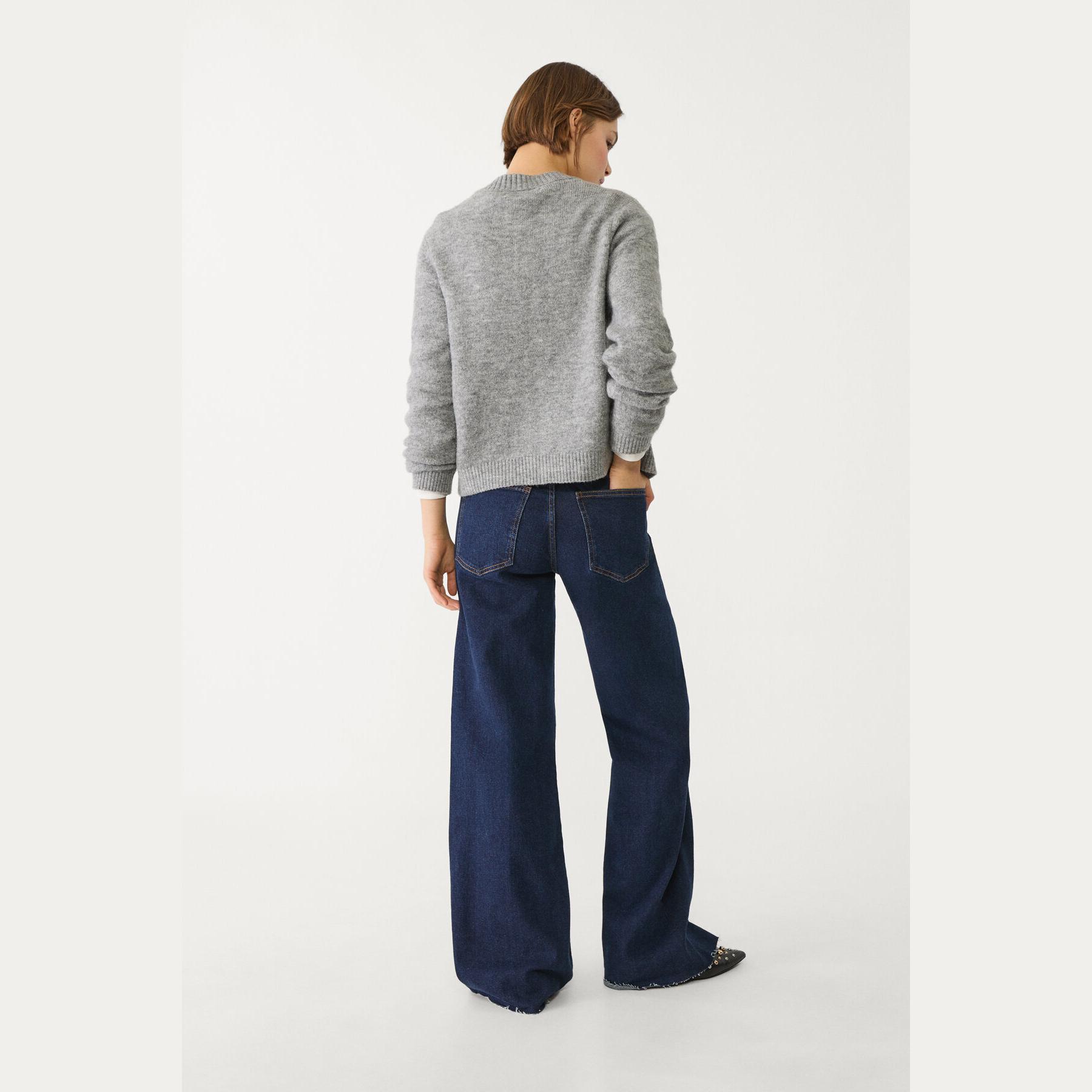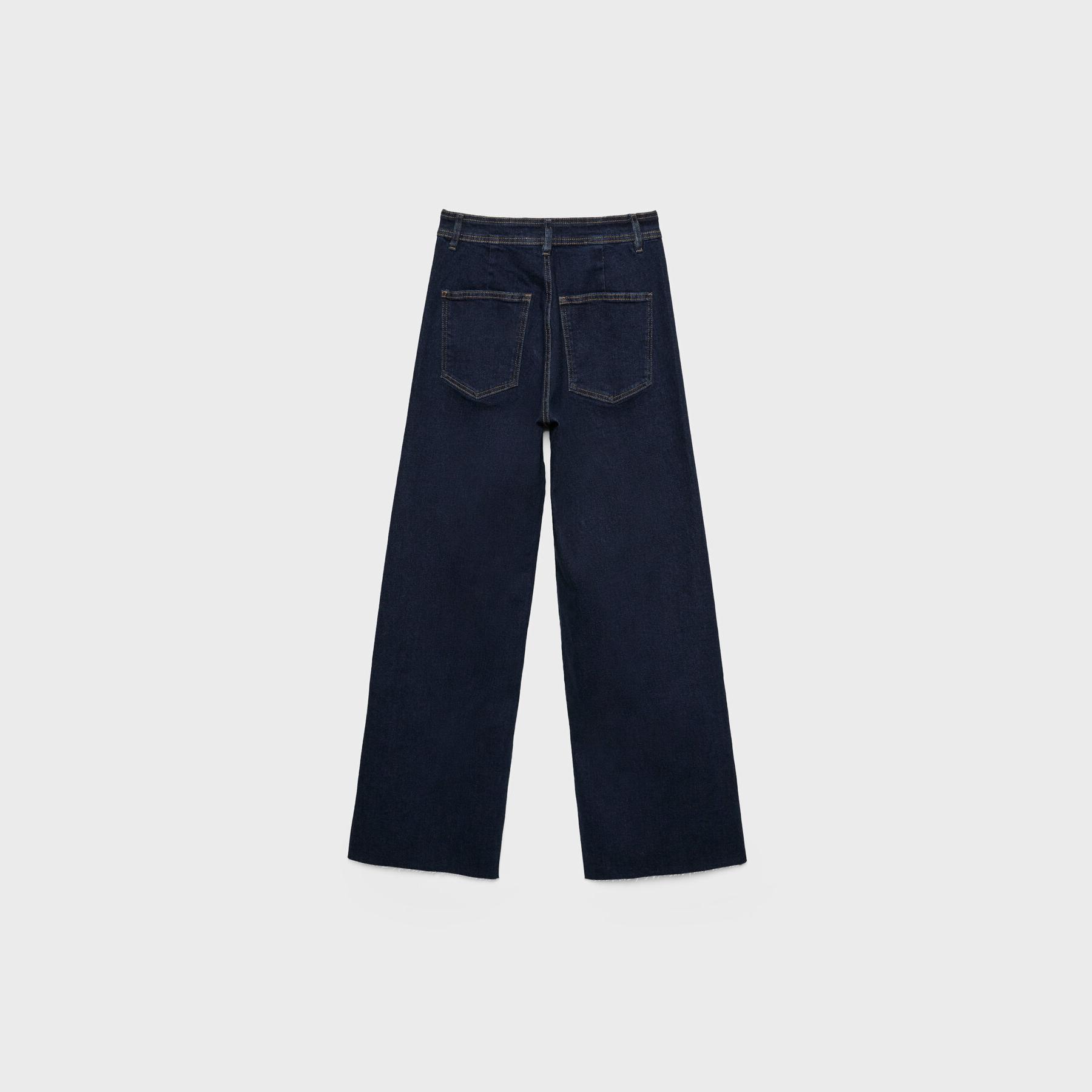 بنطال جينز أنيق من Stradivarius بلون أزرق دنيم مغسول، مصنوع من خامة قطنية بنسبة 99% مع 1% إيلاستان لمرونة خفيفة، يتميز بقصة مستقيمة واسعة (Straight Minimal Fit) وخصر عالي يغطي منطقة السرة، مزود بإغلاق أمامي بسحاب وزر معدني، تصميم بخمسة جيوب عملية، حلقات حزام، ودُرز طولي أمامي يضفي لمسة تصميمية مميزة، مع أطراف سفلية مشطوبة (Frayed Hem)، مثالي للتنسيق مع توبات قصيرة أو جاكيتات لإطلالة كاجوال مريحة وعصرية.