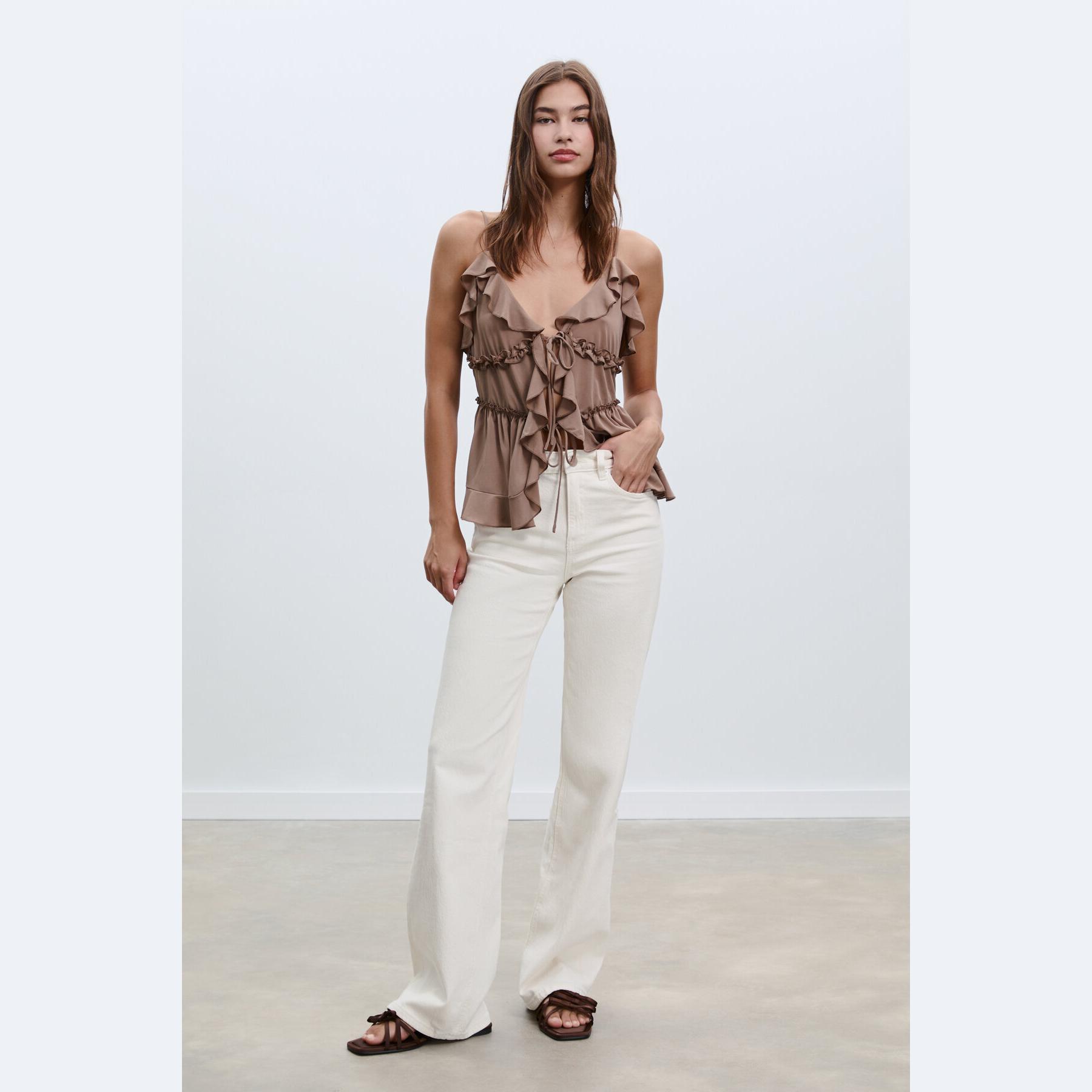 بنطال جينز أنيق من Stradivarius بلون إكرُو (كريمي فاتح)، مصنوع من خامة قطنية بنسبة 99% مع 1% إيلاستان لمرونة خفيفة، يتميز بقصة مستقيمة مريحة (Straight Comfort Fit) وخصر عادي يغطي منطقة السرة، مزود بإغلاق أمامي بسحاب وزر معدني، تصميم بخمسة جيوب عملية (أمامية وخلفية)، وحلقات حزام، ويأتي مع حزام بنفس اللون، مثالي للتنسيق مع توبات قصيرة أو قمصان مطبعة لإطلالة كاجوال مريحة وعصرية.