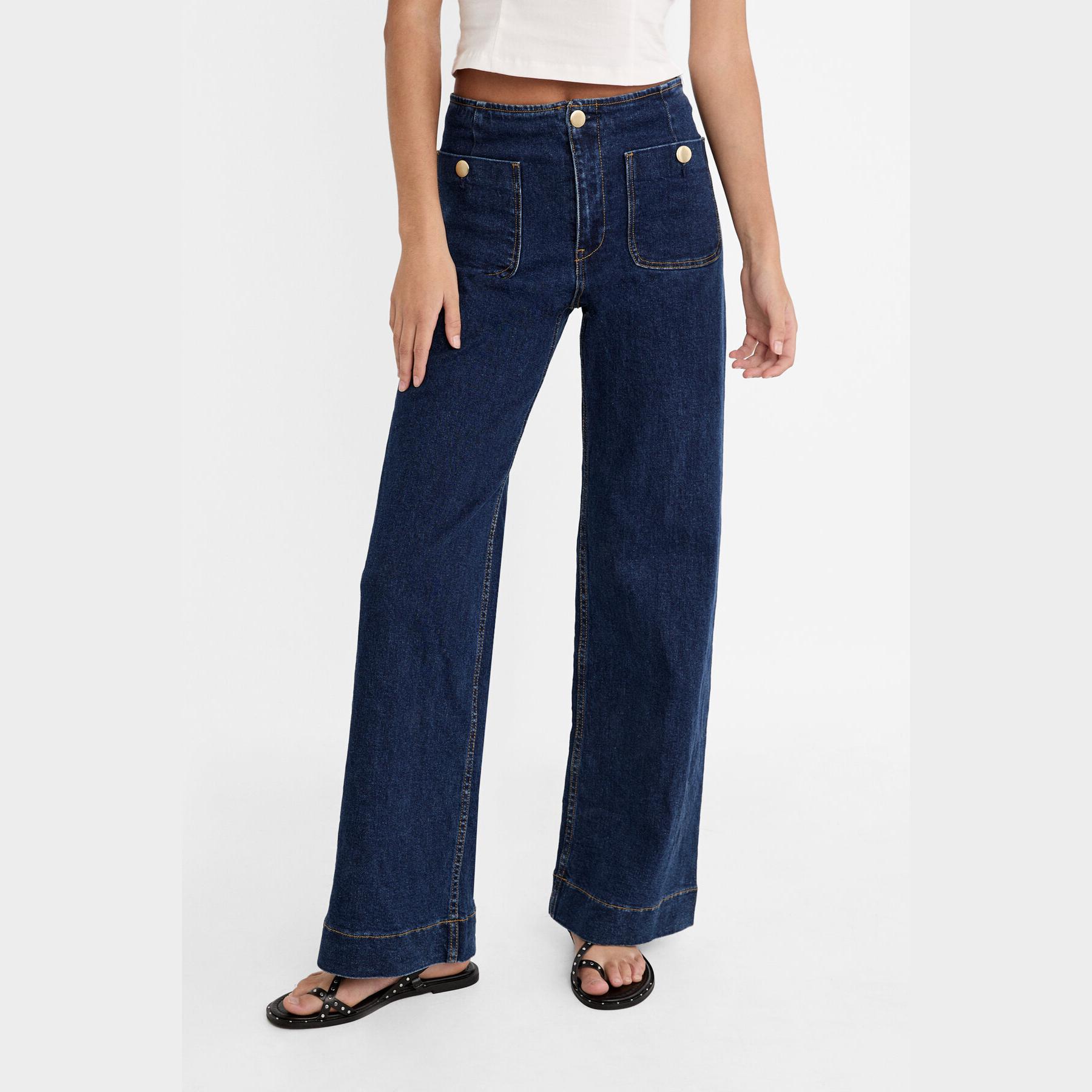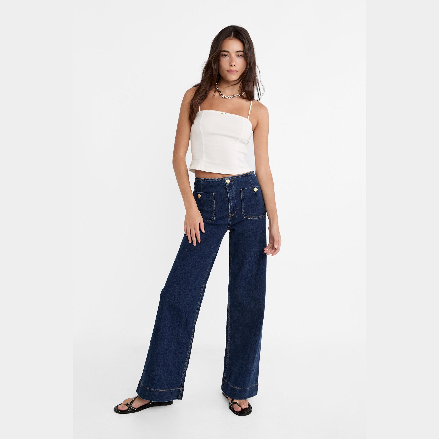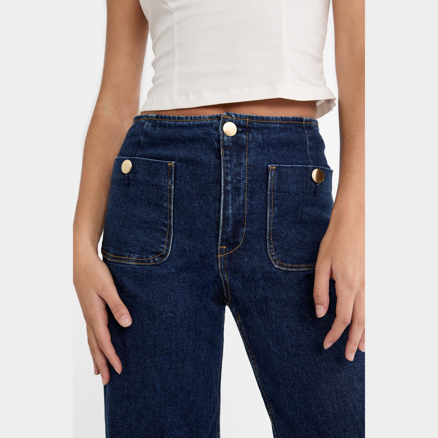 بنطال جينز أنيق من Stradivarius بلون أزرق دنيم مغسول، مصنوع من خامة قطنية بنسبة 99% مع 1% إيلاستان لمرونة خفيفة، يتميز بقصة Flare تبدأ ضيقة من الفخذ وتتسع تدريجيًا من الركبة، مع خصر عالي يغطي منطقة السرة، مزود بإغلاق أمامي بسحاب وزر معدني، تصميم بخمسة جيوب عملية تشمل جيوب أمامية بارزة وخلفية، بدون حزام، وأطراف بطول قياسي، مثالي للتنسيق مع توبات قصيرة أو جاكيتات لإطلالة كاجوال أنيقة وعصرية.