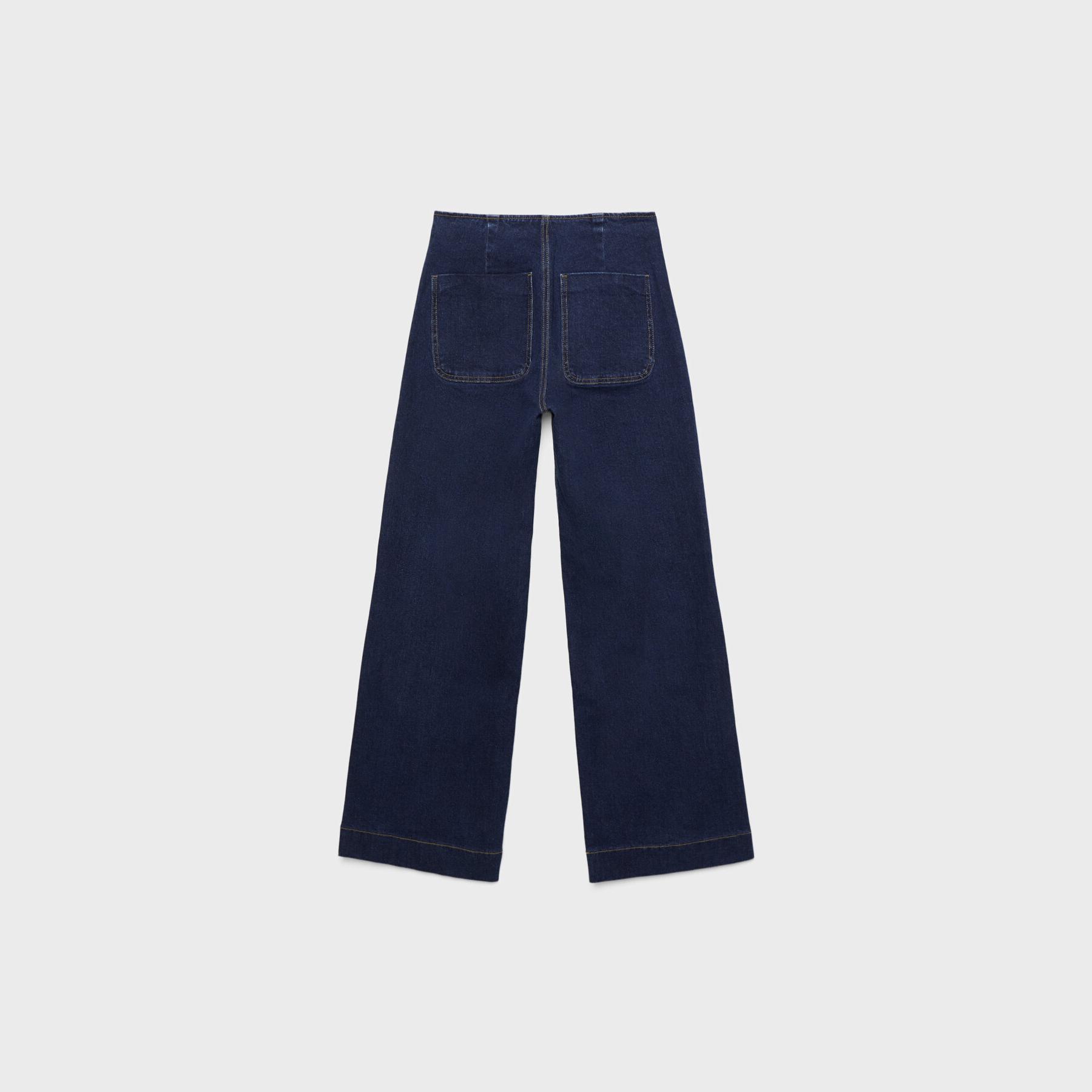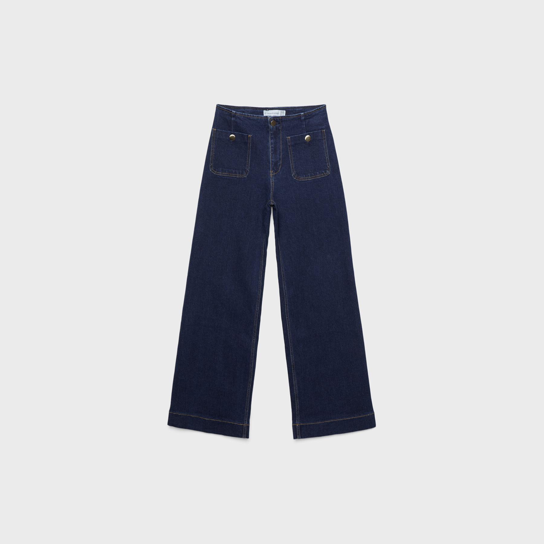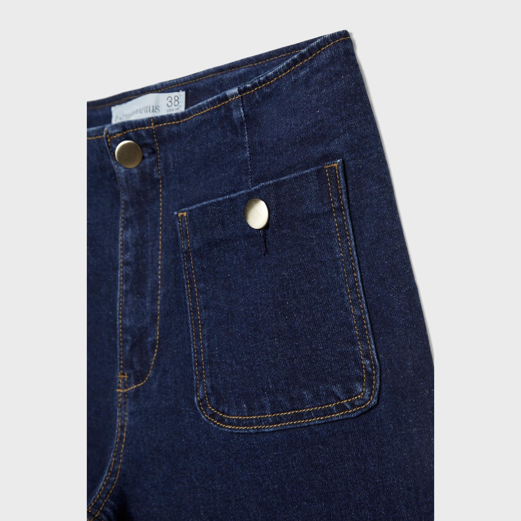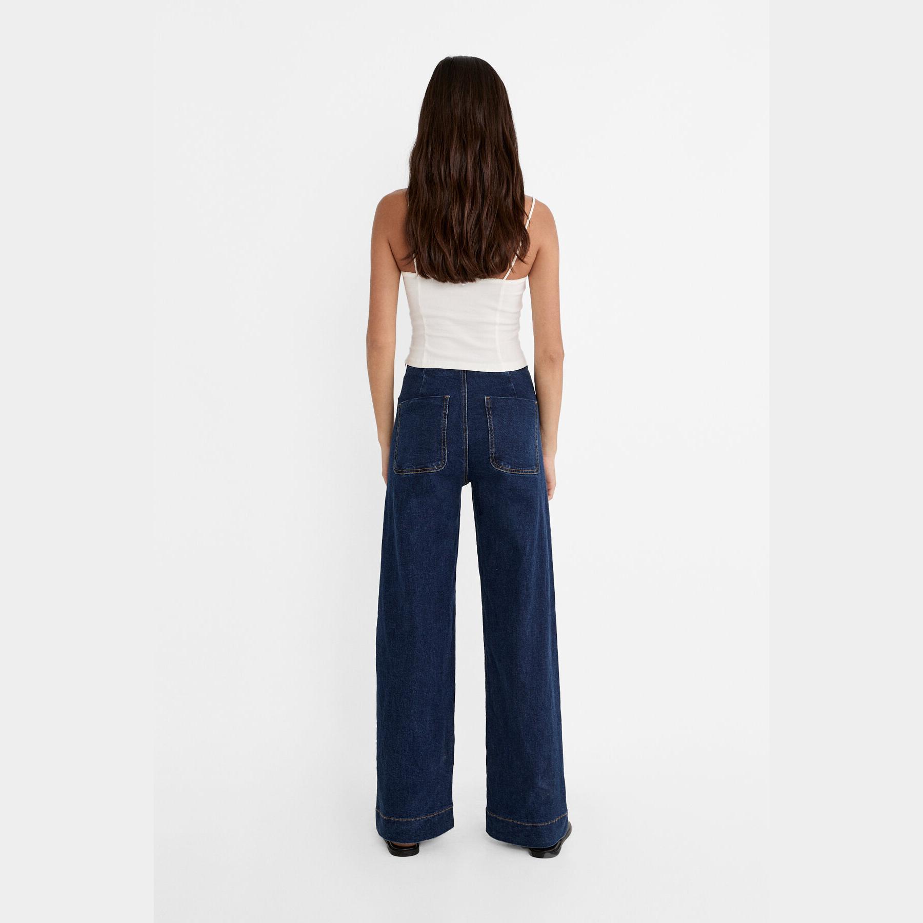 بنطال جينز أنيق من Stradivarius بلون أزرق دنيم مغسول، مصنوع من خامة قطنية بنسبة 99% مع 1% إيلاستان لمرونة خفيفة، يتميز بقصة Flare تبدأ ضيقة من الفخذ وتتسع تدريجيًا من الركبة، مع خصر عالي يغطي منطقة السرة، مزود بإغلاق أمامي بسحاب وزر معدني، تصميم بخمسة جيوب عملية تشمل جيوب أمامية بارزة وخلفية، بدون حزام، وأطراف بطول قياسي، مثالي للتنسيق مع توبات قصيرة أو جاكيتات لإطلالة كاجوال أنيقة وعصرية.