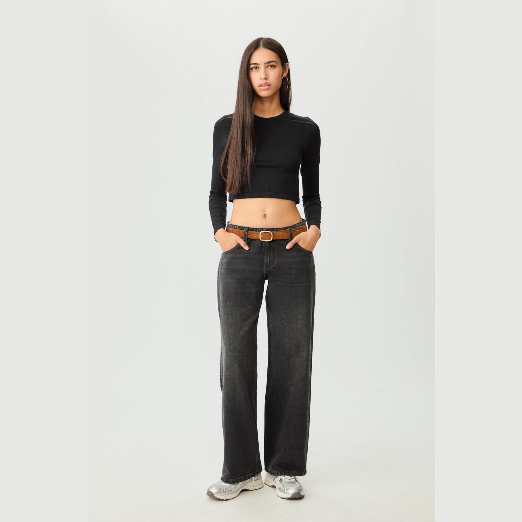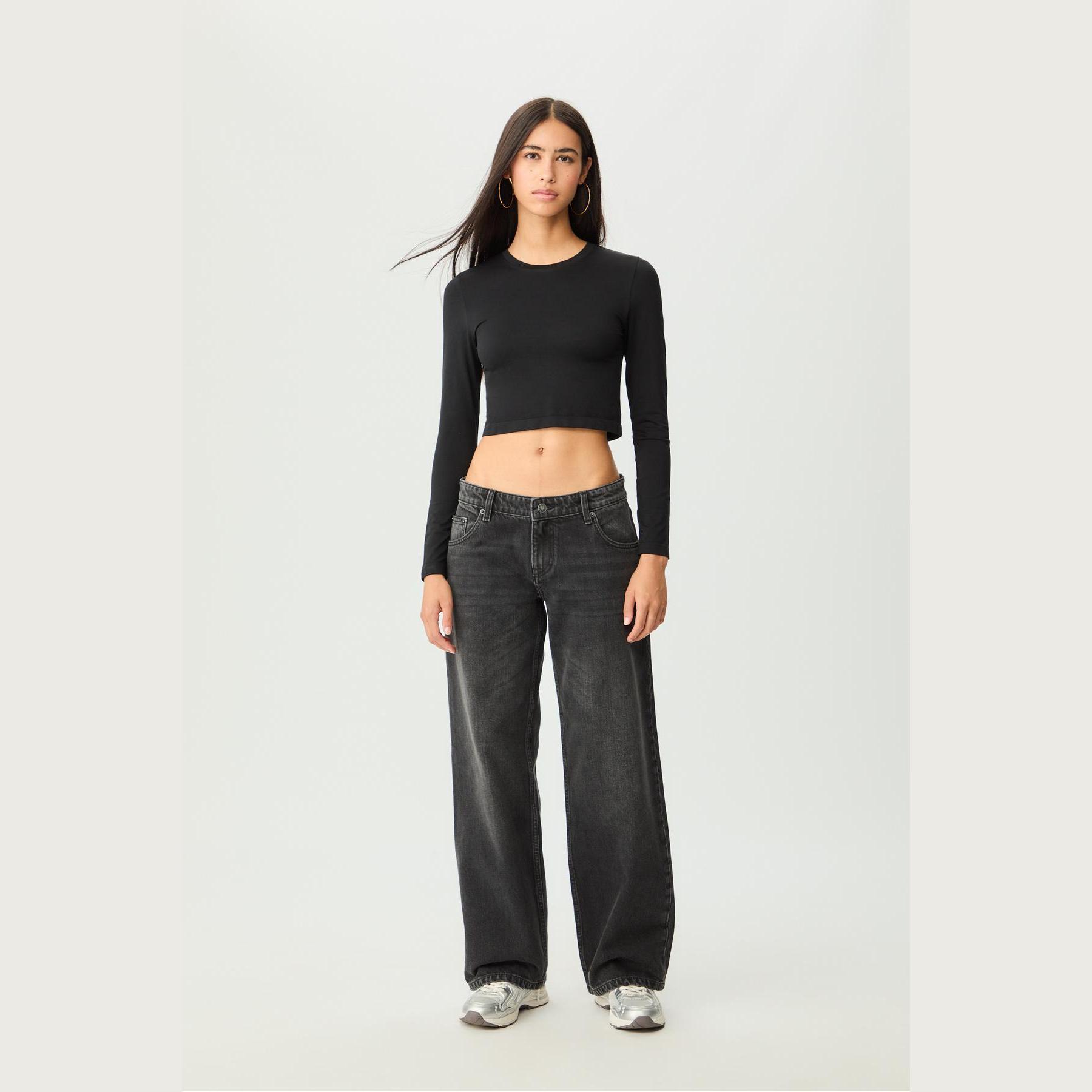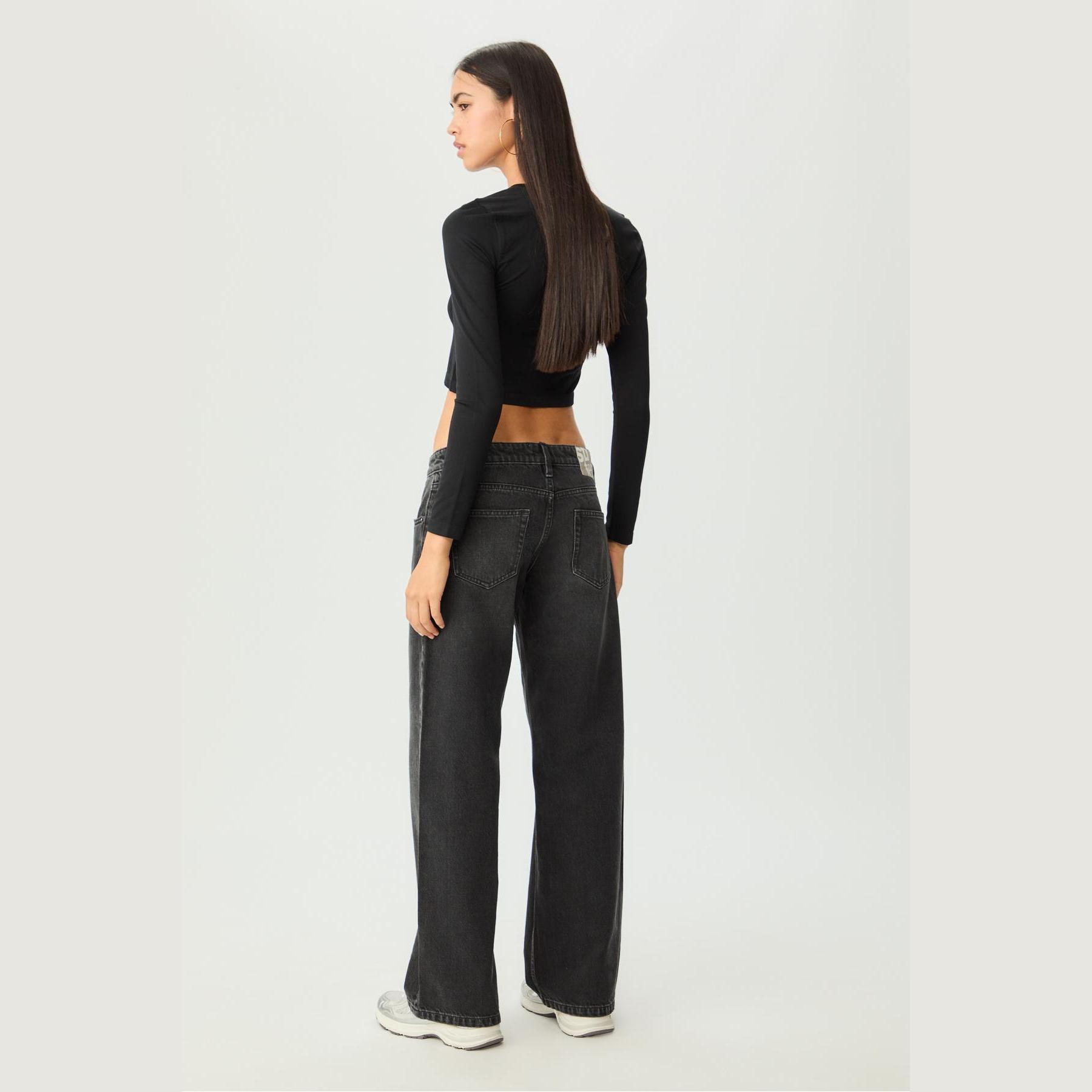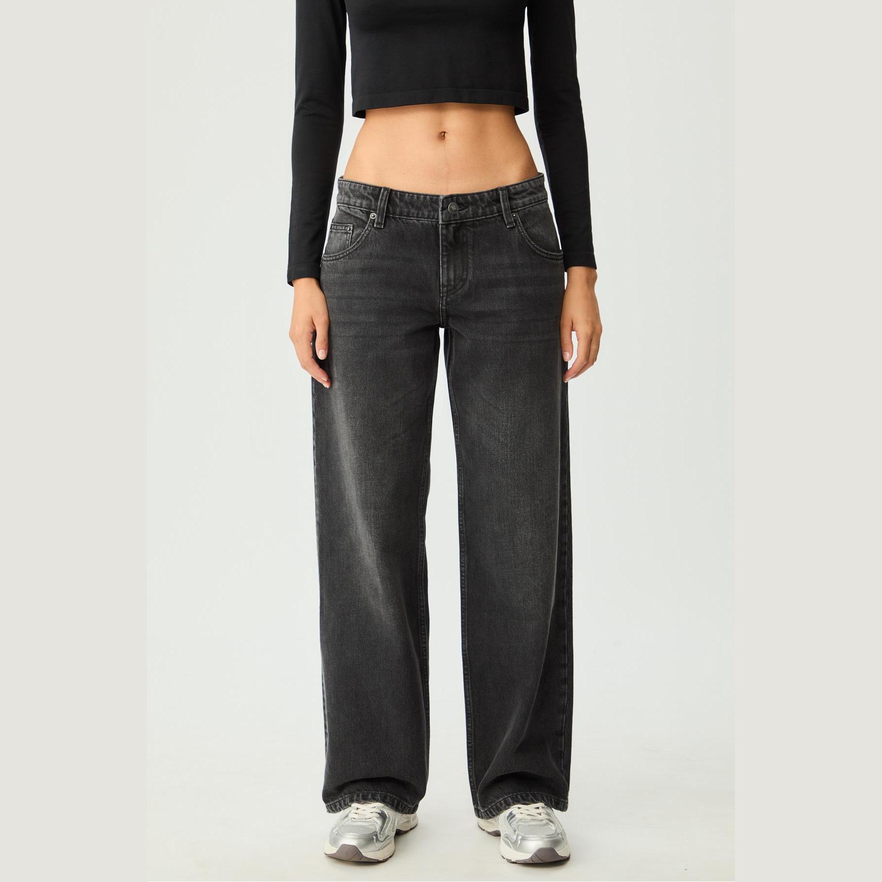 بنطال جينز أنيق من Stradivarius بلون أسود باهت بتأثير مغسول، مصنوع من خامة قطنية 100% بدون مطاط، يتميز بقصة Baggy فضفاضة وخصر متوسط، مزود بإغلاق أمامي بسحاب وزر معدني، تصميم بخمسة جيوب عملية (أمامية وخلفية)، حلقات حزام، وأطراف مستقيمة بطول قياسي، مثالي للتنسيق مع توبات قصيرة أو جاكيتات لإطلالة كاجوال مريحة وعصرية.