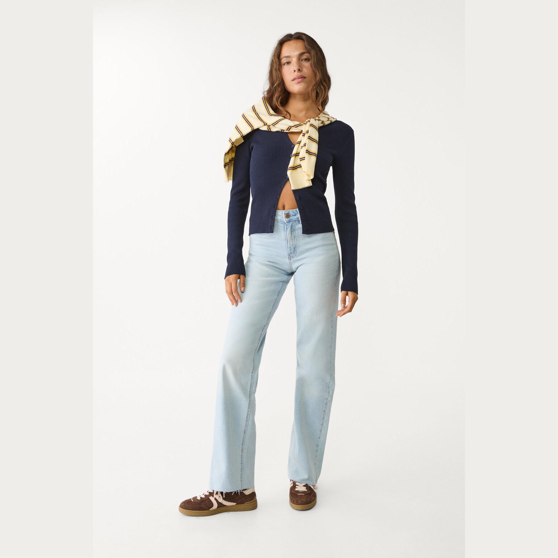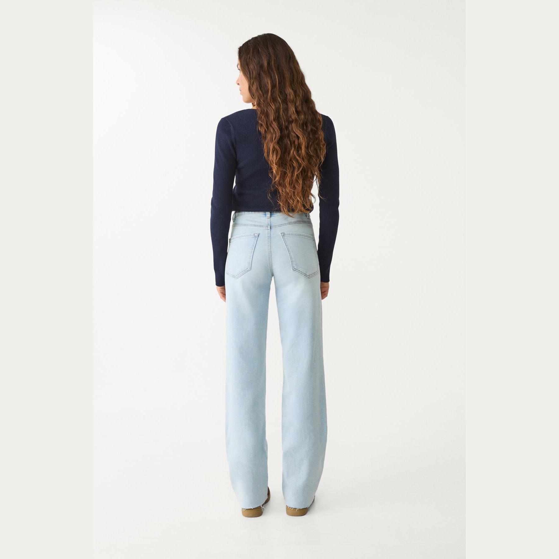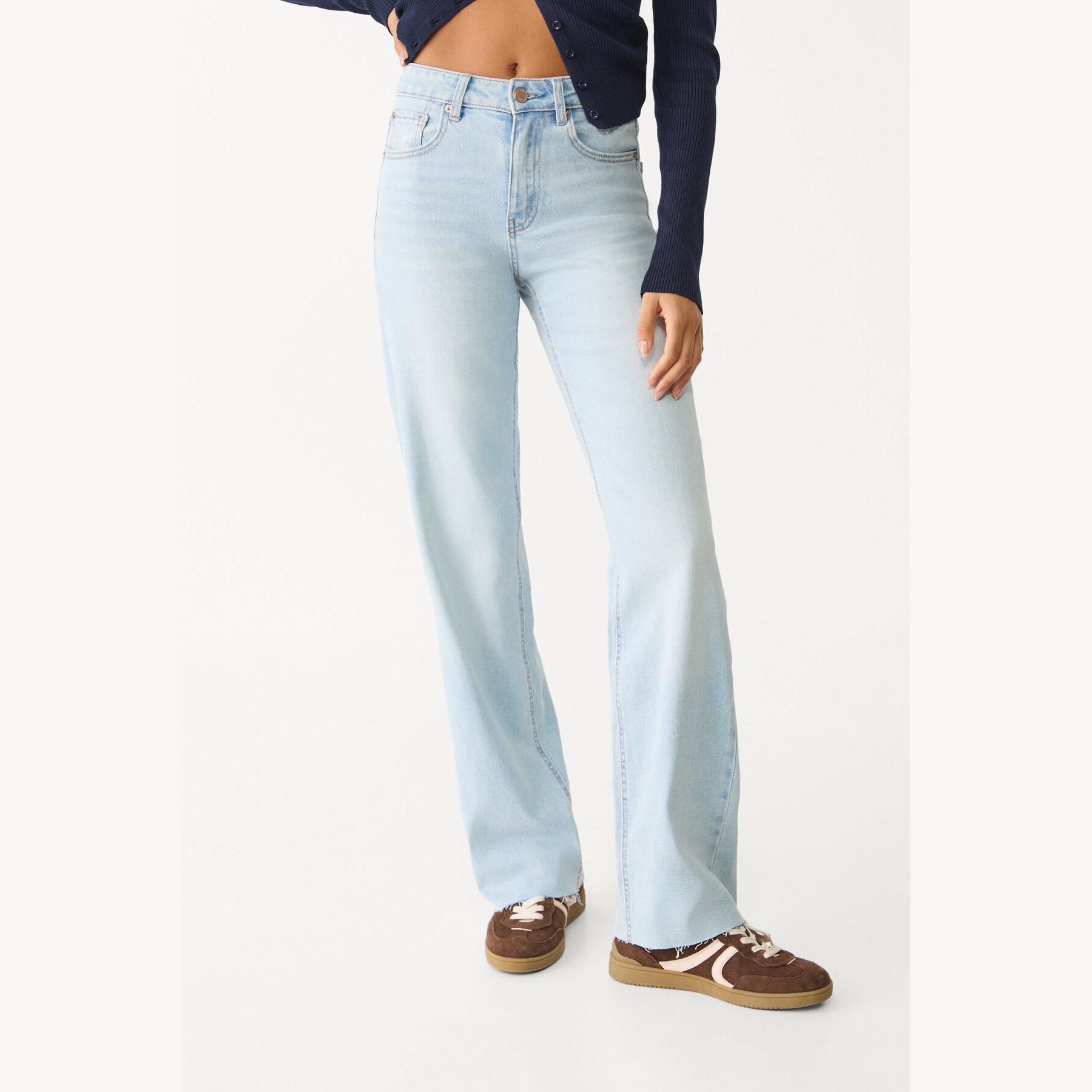 بنطال جينز أنيق من Stradivarius بلون أزرق فاتح دنيم، مصنوع من خامة قطنية بنسبة 99% مع 1% إيلاستان لمرونة خفيفة، يتميز بقصة مستقيمة مريحة (Straight Comfort Fit) وخصر عادي يغطي منطقة السرة، مزود بإغلاق أمامي بسحاب وزر معدني، تصميم بخمسة جيوب عملية (أمامية وخلفية)، حلقات حزام، ويأتي مع حزام بنفس اللون، وأطراف بطول قياسي، مثالي للتنسيق مع توبات قصيرة أو قمصان مطبعة لإطلالة كاجوال مريحة وعصرية.
