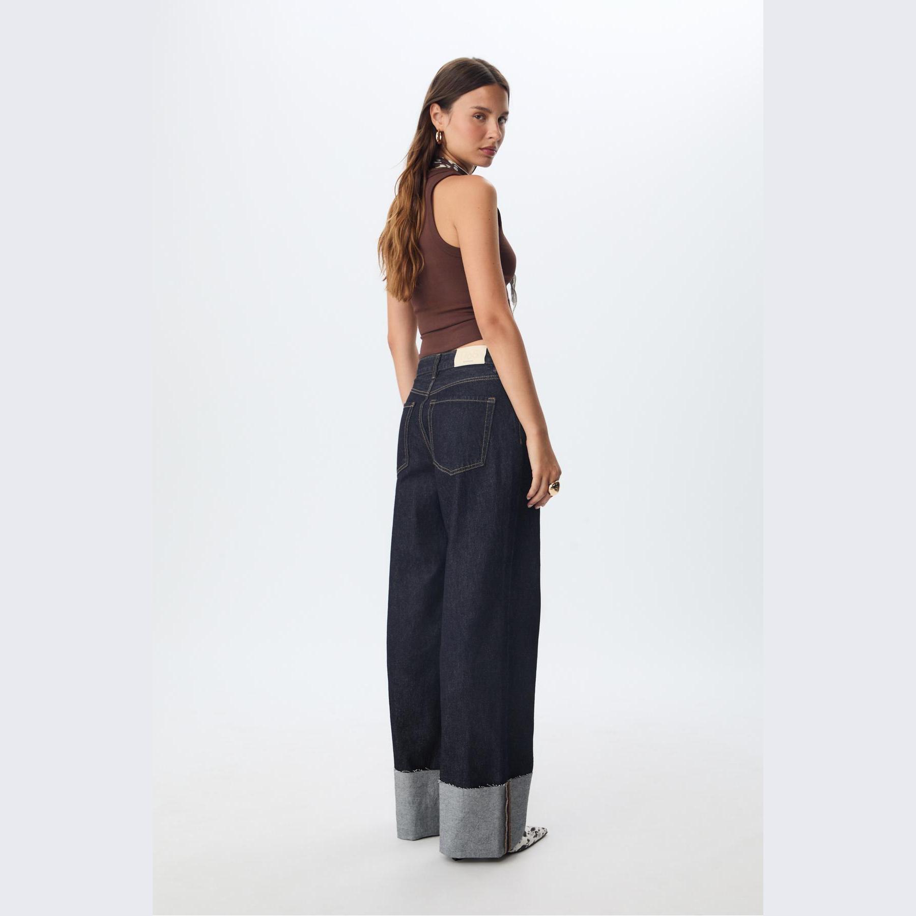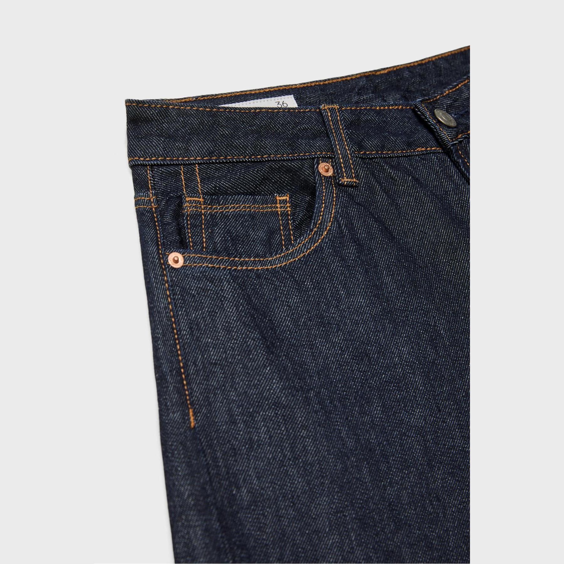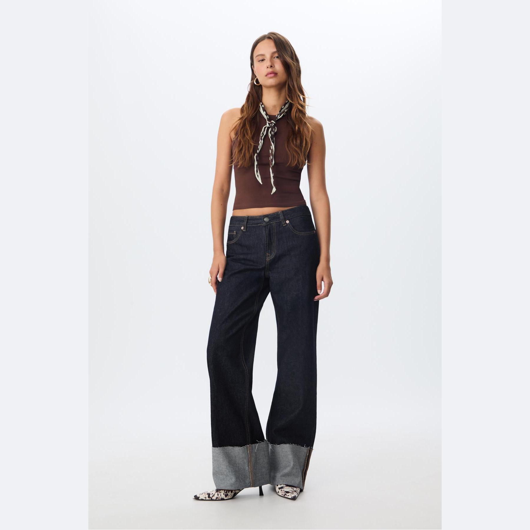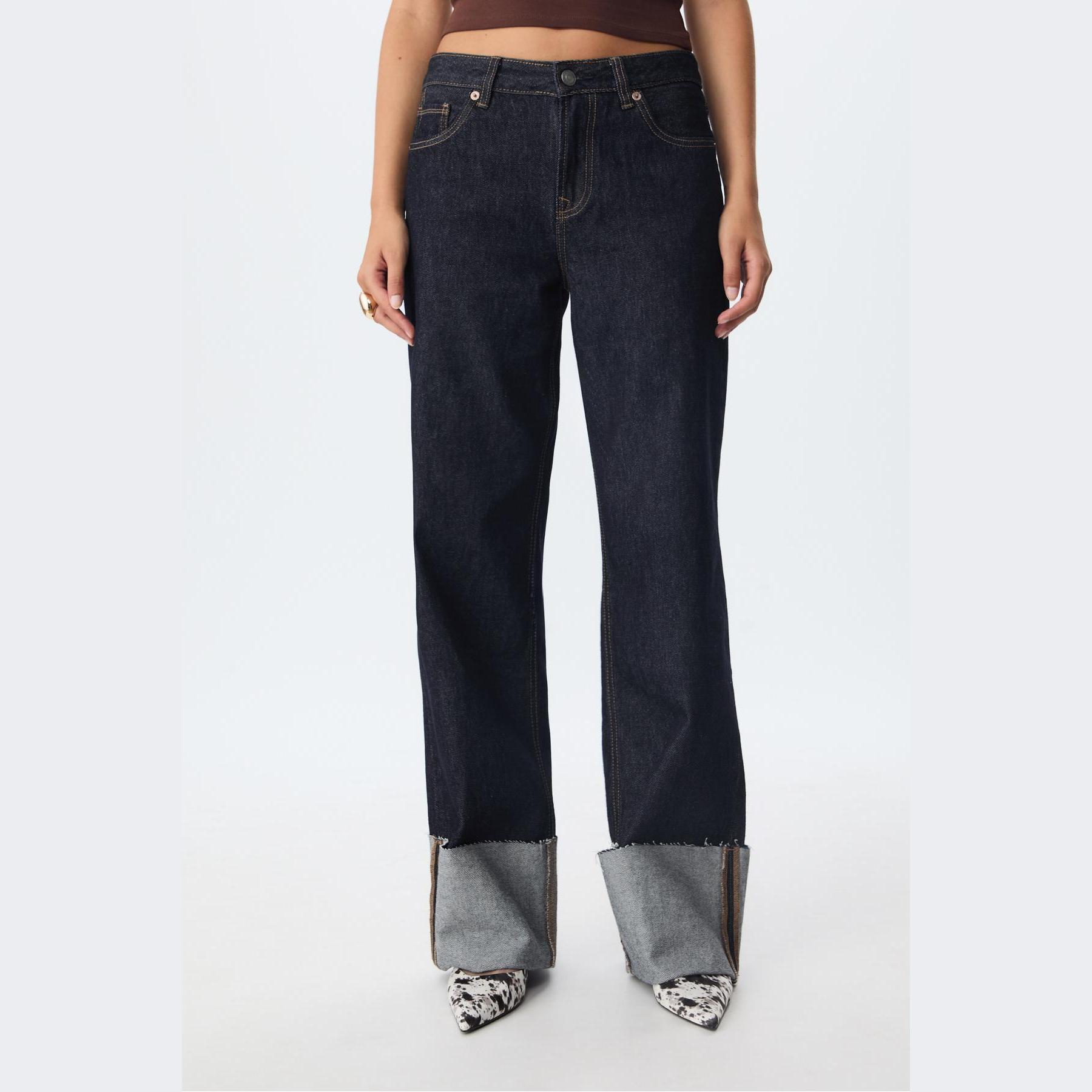 بنطال جينز أنيق من Stradivarius بلون كحلي داكن، مصنوع من خامة قطنية 100% بدون مطاط، يتميز بقصة مستقيمة (Straight Fit) وخصر عادي، مزود بإغلاق أمامي بسحاب وزر معدني، تصميم بخمسة جيوب عملية (أمامية + خلفية)، حلقات حزام، وأطراف سفلية مطوية (كفّة) بتشطيب خفيف غير متماثل، تمنحك لمسة تصميمية عصرية، مثالي للتنسيق مع توبات قصيرة أو جاكيتات لإطلالة كاجوال مريحة.