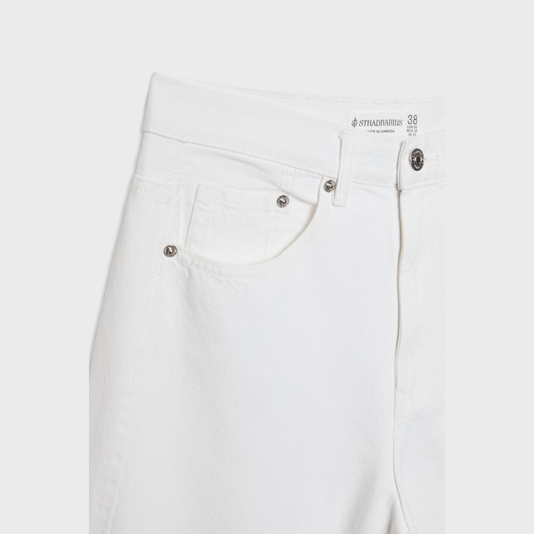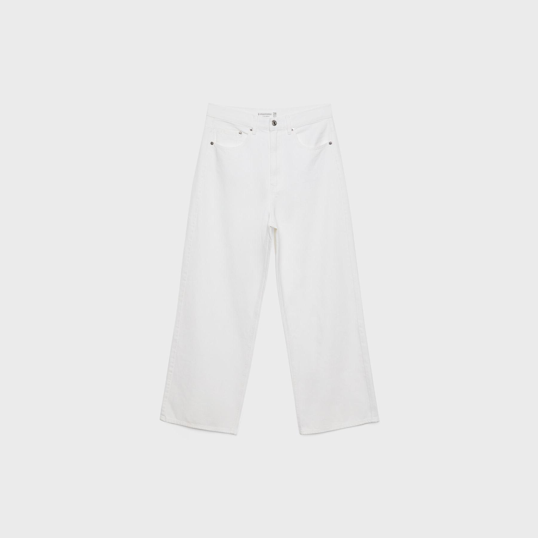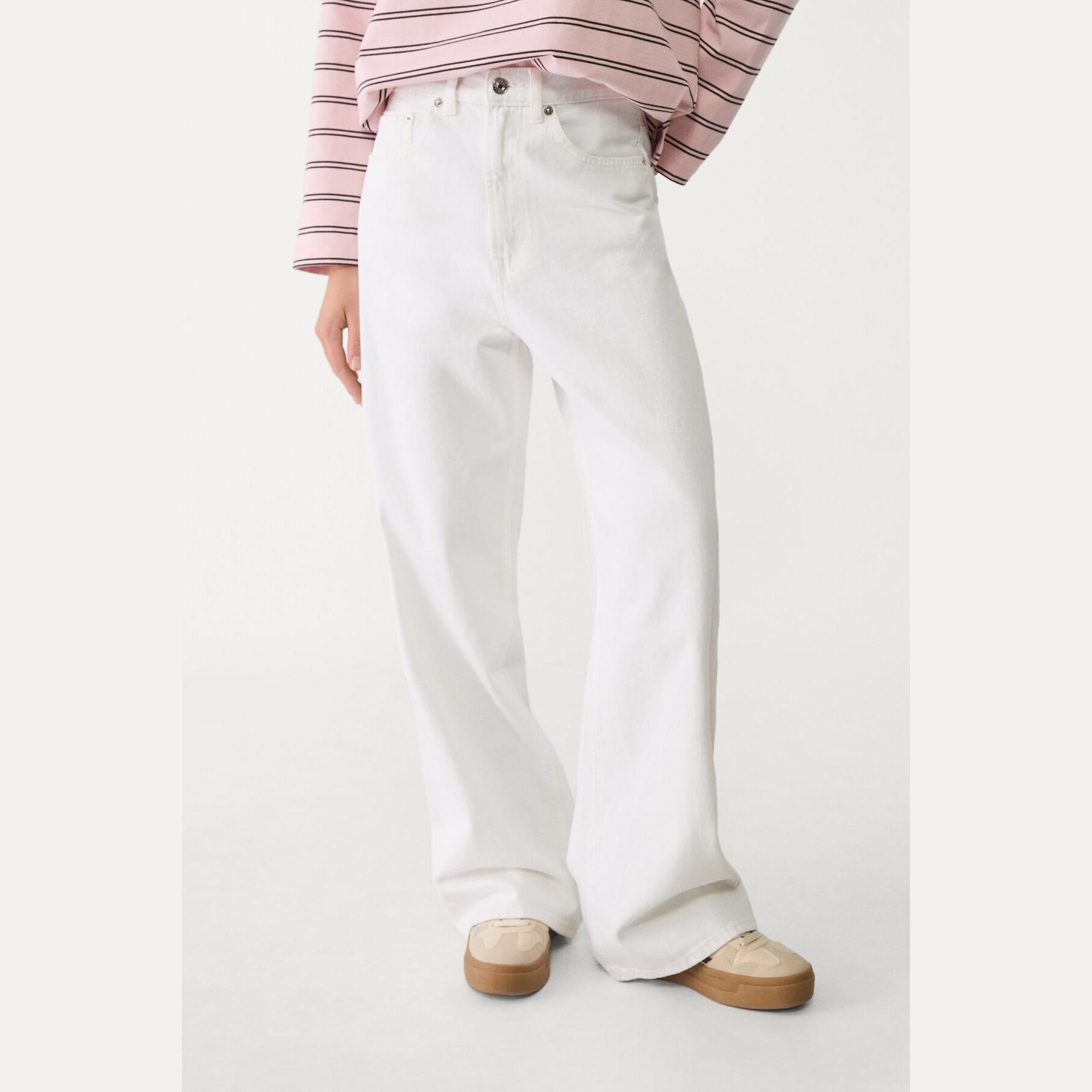 بنطال جينز أنيق من Stradivarius بلون إكرُو (كريمي فاتح)، مصنوع من خامة قطنية 100% بدون مطاط، يتميز بقصة مستقيمة واسعة (Straight Fit – Wide Leg) وخصر عادي يغطي منطقة السرة، مزود بإغلاق أمامي بسحاب وزر معدني، تصميم بخمسة جيوب عملية (أمامية + خلفية)، حلقات حزام، ويأتي مع حزام بنفس اللون، وأطراف بطول قياسي، مثالي للتنسيق مع توبات قصيرة أو قمصان مطبعة لإطلالة كاجوال مريحة وعصرية.