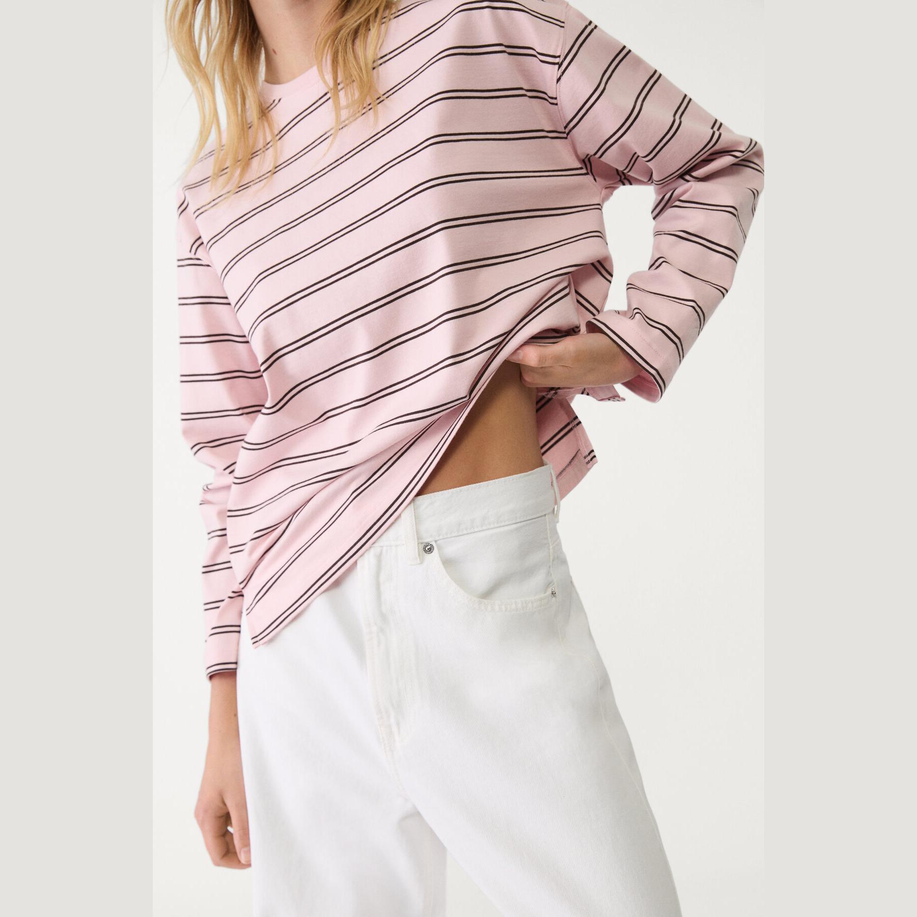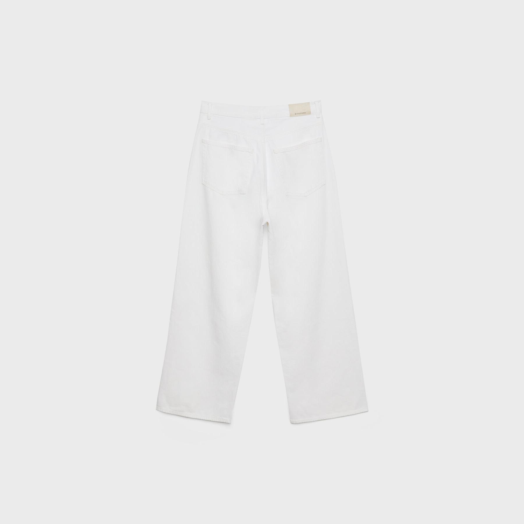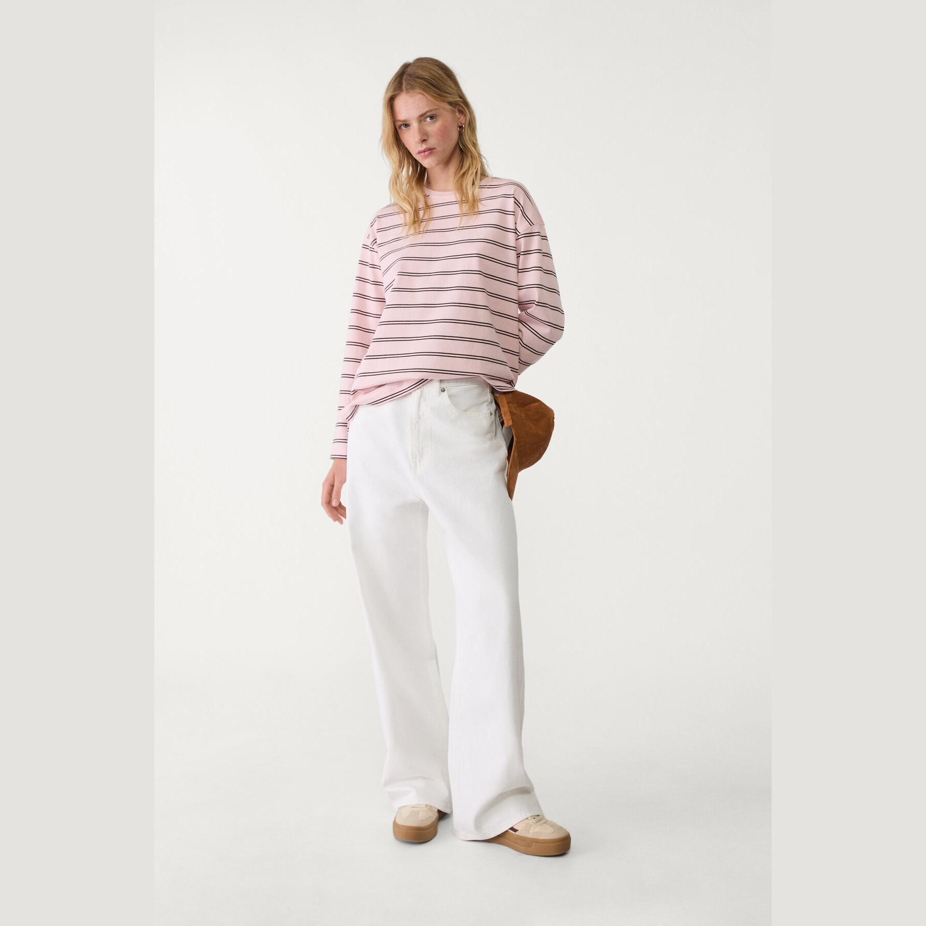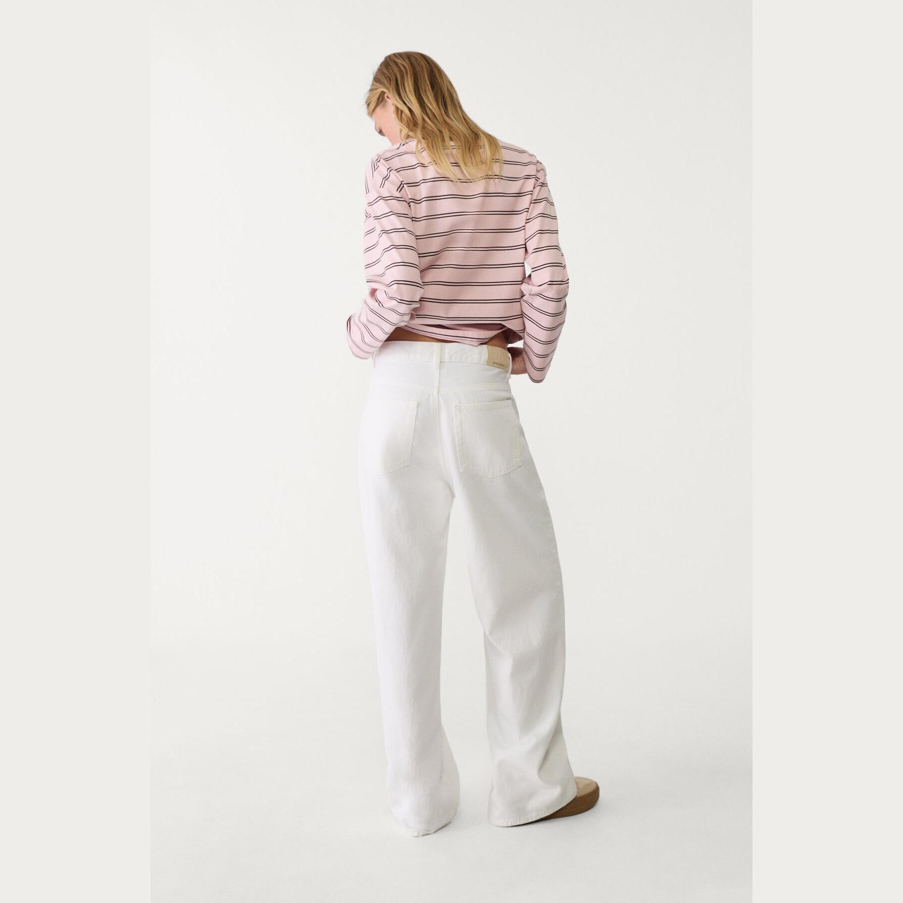 بنطال جينز أنيق من Stradivarius بلون إكرُو (كريمي فاتح)، مصنوع من خامة قطنية 100% بدون مطاط، يتميز بقصة مستقيمة واسعة (Straight Fit – Wide Leg) وخصر عادي يغطي منطقة السرة، مزود بإغلاق أمامي بسحاب وزر معدني، تصميم بخمسة جيوب عملية (أمامية + خلفية)، حلقات حزام، ويأتي مع حزام بنفس اللون، وأطراف بطول قياسي، مثالي للتنسيق مع توبات قصيرة أو قمصان مطبعة لإطلالة كاجوال مريحة وعصرية.