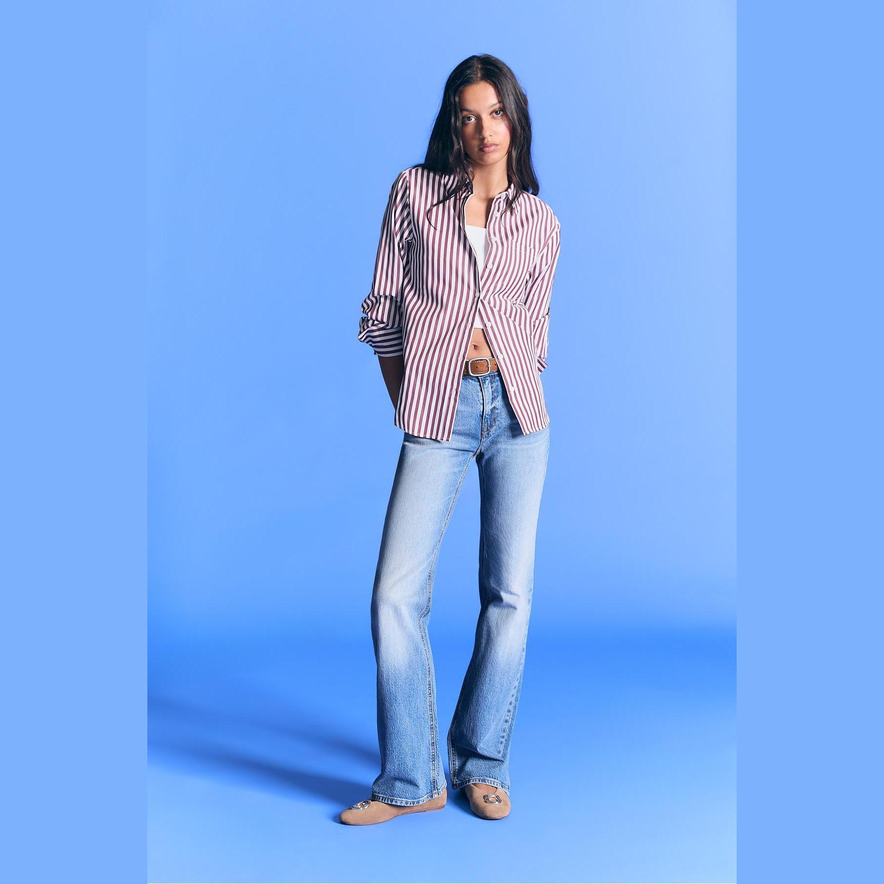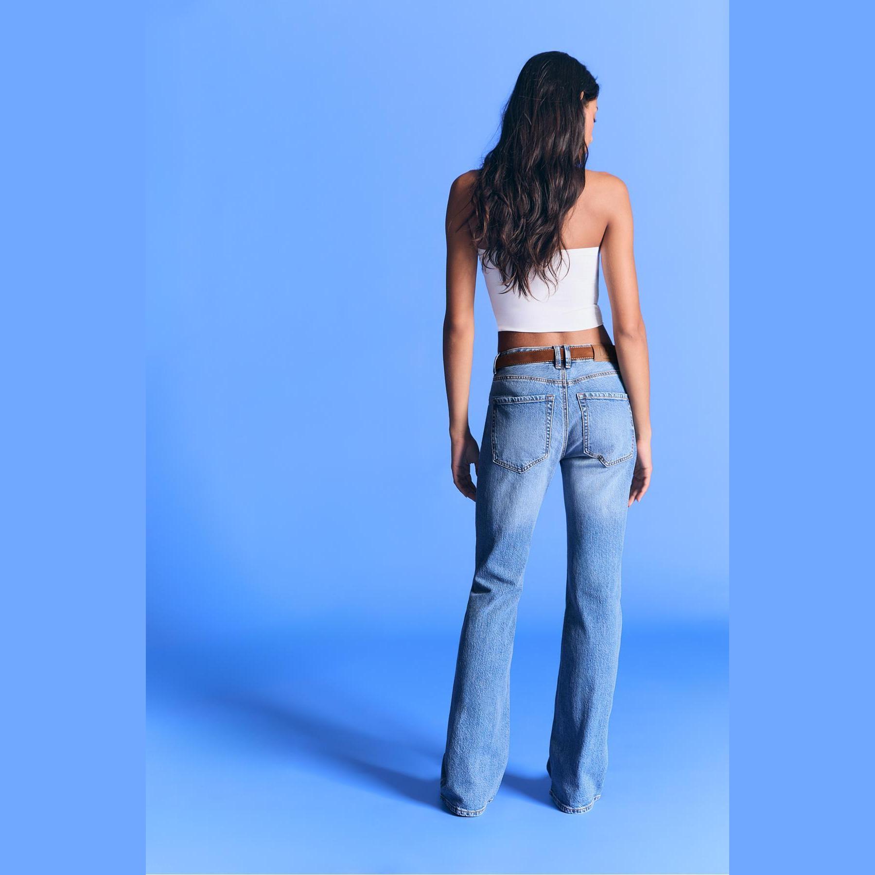 بنطال جينز أنيق من Stradivarius بلون أزرق متوسط مغسول بتأثير باهت، مصنوع من خامة قطنية بنسبة 99% مع 1% إيلاستان لمرونة خفيفة، يتميز بقصة Bootcut تبدأ ضيقة من الفخذ وتتسع تدريجيًا من الركبة، مع خصر عادي يغطي منطقة السرة، مزود بإغلاق أمامي بسحاب وزر معدني، تصميم بخمسة جيوب عملية (أمامية وخلفية)، حلقات حزام، ويأتي مع حزام قابل للإزالة بنفس اللون مع إبزيم معدني، مثالي للتنسيق مع توبات قصيرة أو جاكيتات لإطلالة كاجوال أنيقة وعصرية.