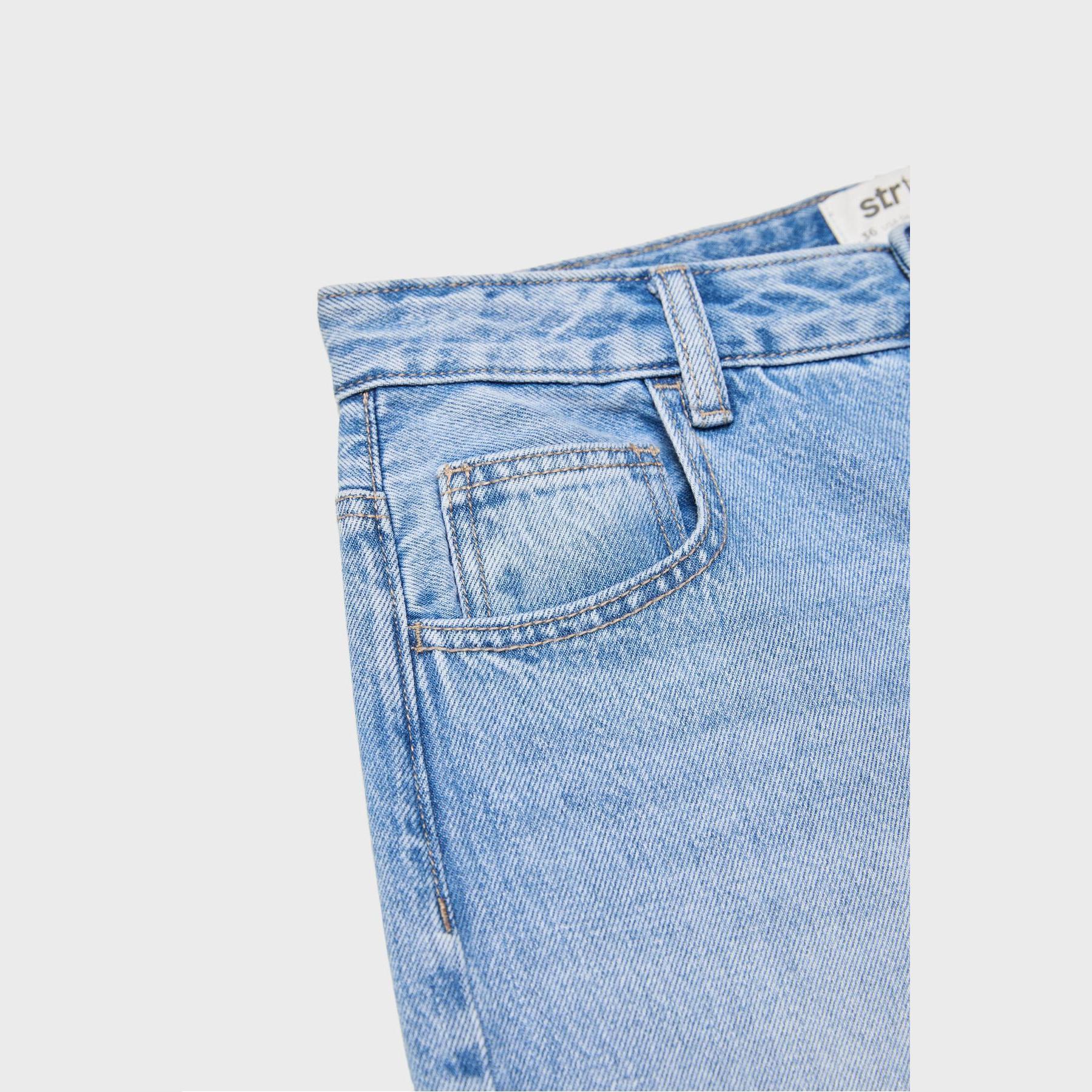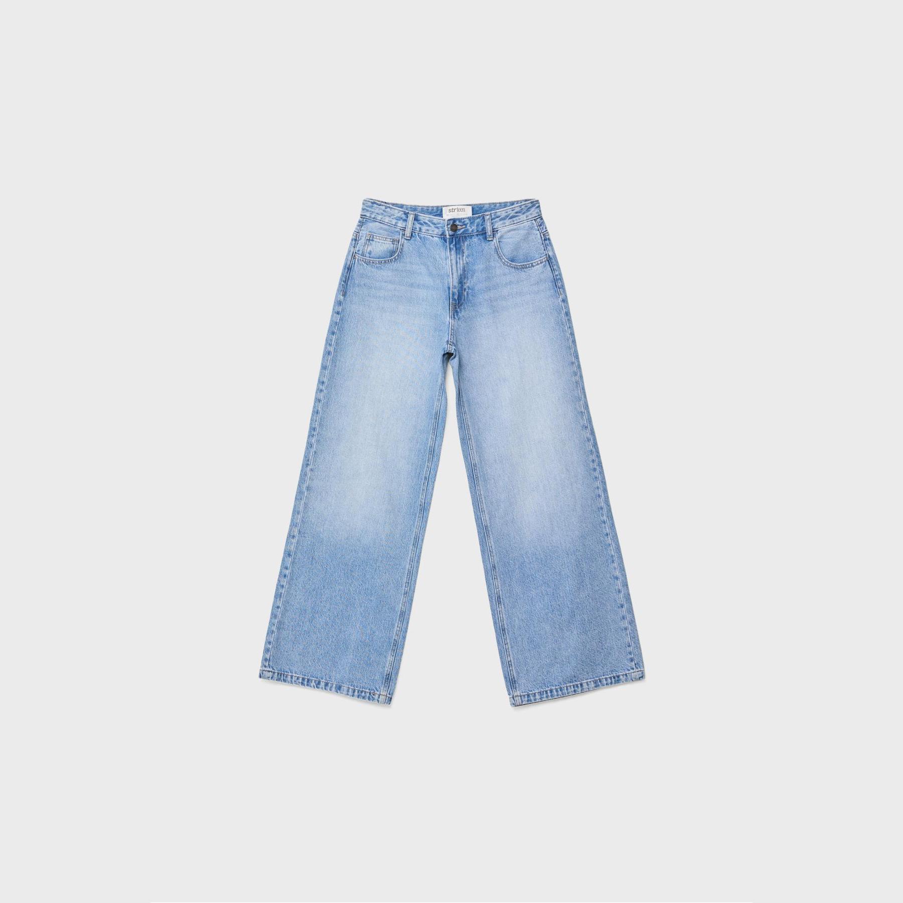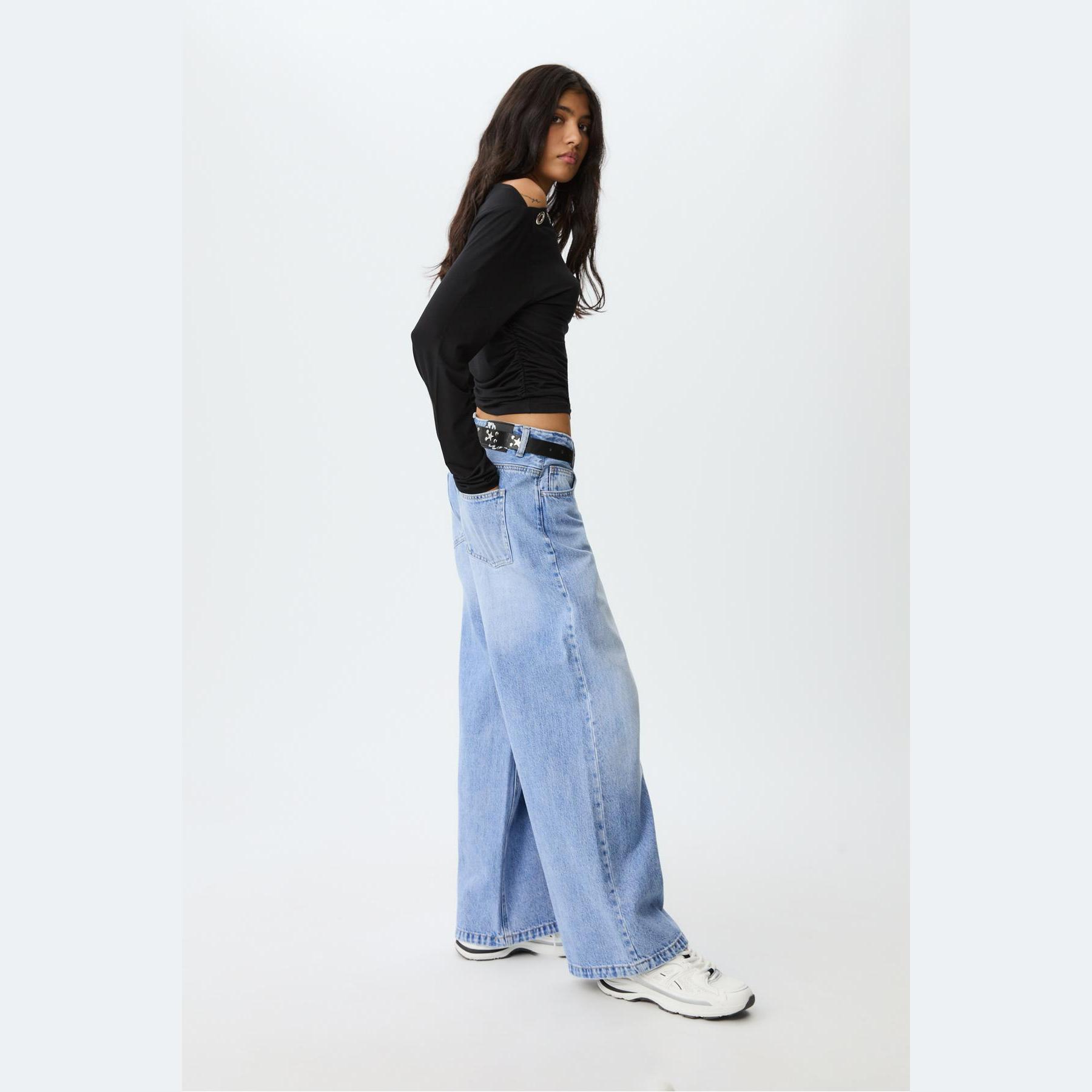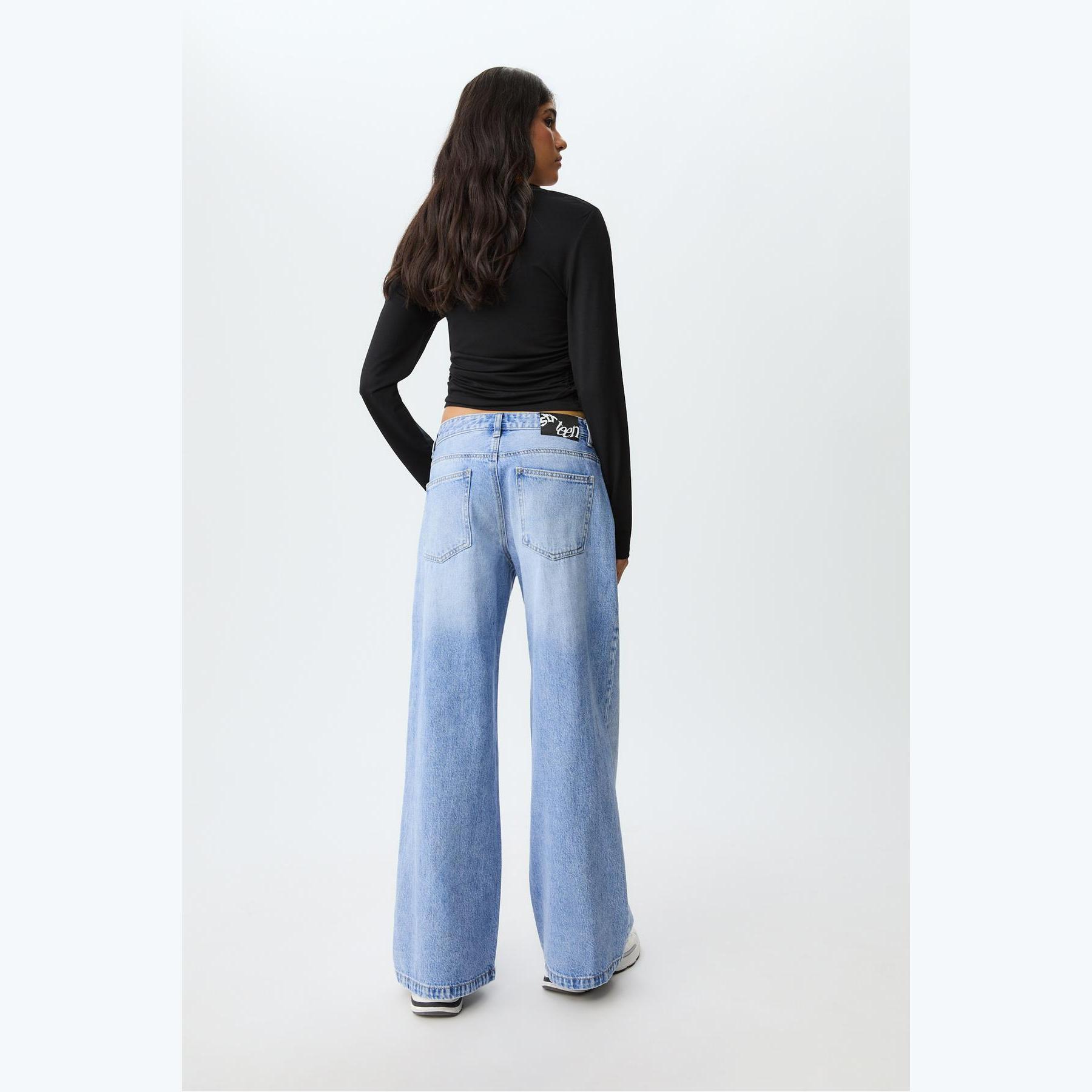 بنطال جينز أنيق من Stradivarius بلون أزرق متوسط مغسول بتأثير باهت، مصنوع من خامة قطنية 100% بدون مطاط، يتميز بقصة واسعة الساق (Wide Leg) وخصر عادي، مزود بإغلاق أمامي بسحاب وزر معدني، تصميم بخمسة جيوب عملية (أمامية + خلفية)، حلقات حزام، ويأتي مع حزام بنفس اللون، وأطراف بطول قياسي، مثالي للتنسيق مع توبات قصيرة أو جاكيتات لإطلالة كاجوال مريحة وعصرية.