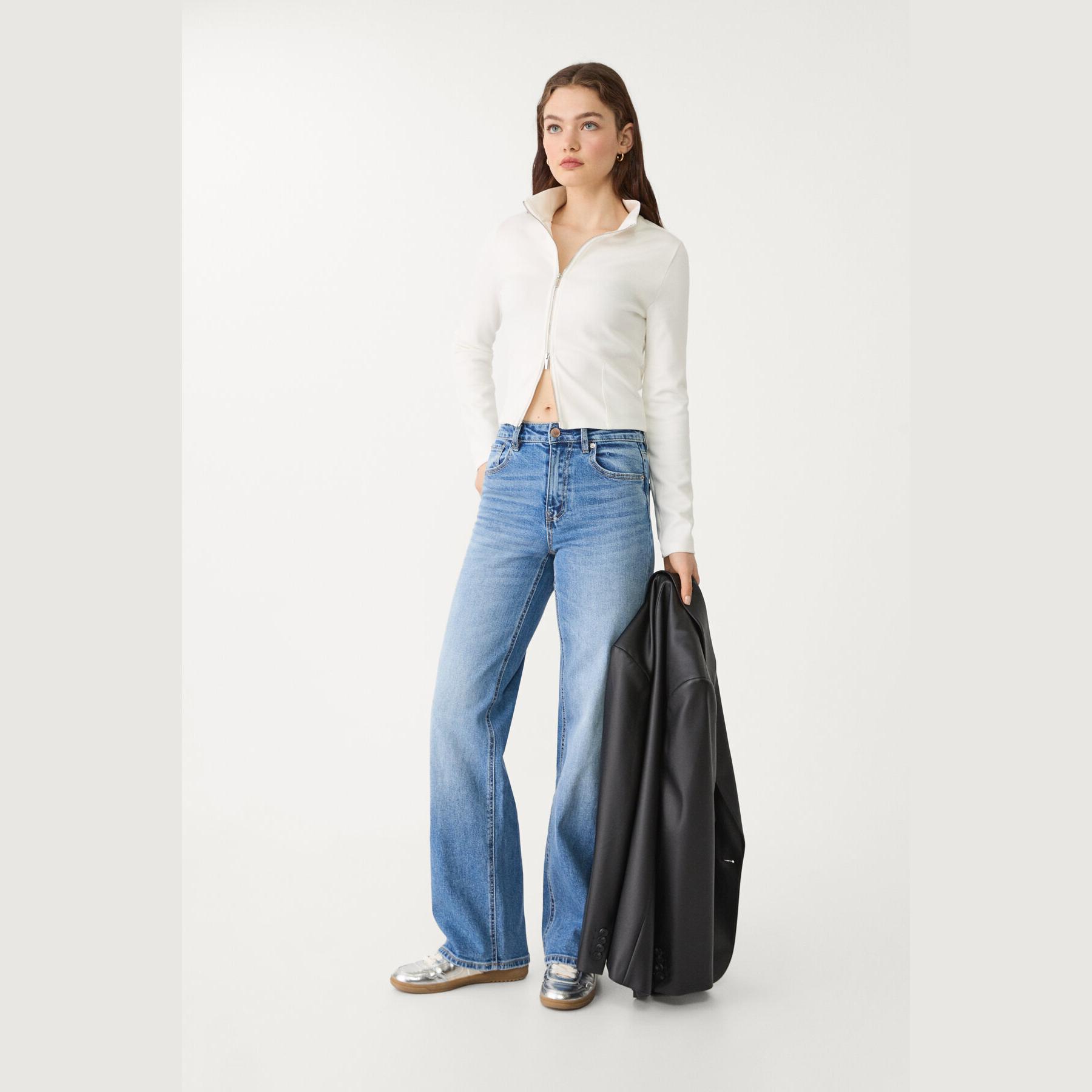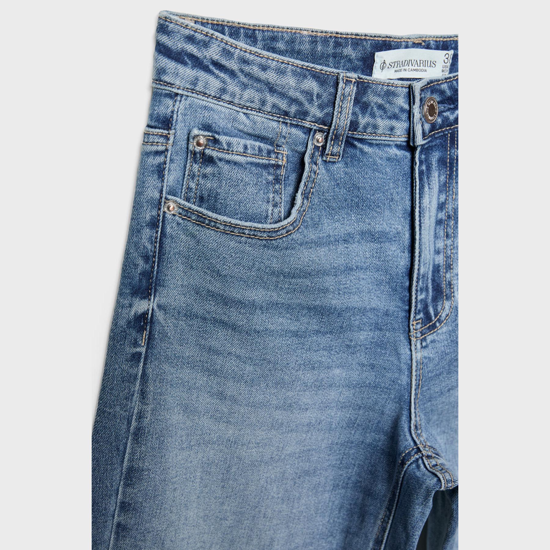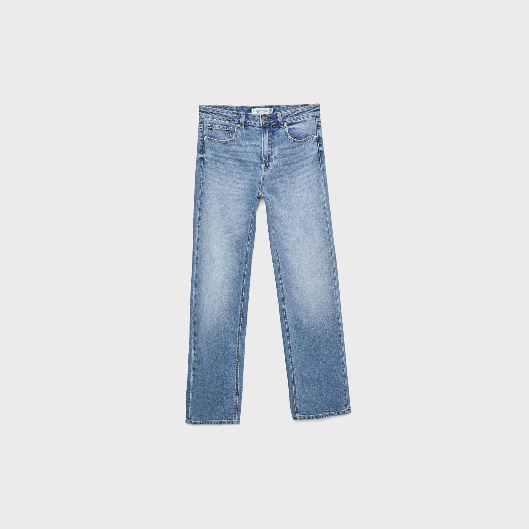 بنطال جينز أنيق من Stradivarius بلون أزرق دنيم، مصنوع من خامة قطنية بنسبة 99% مع 1% إيلاستان لمرونة خفيفة، يتميز بقصة مستقيمة مريحة (Straight Comfort Fit) وخصر عادي يغطي منطقة السرة، مزود بإغلاق أمامي بسحاب وزر معدني، تصميم بخمسة جيوب عملية (أمامية وخلفية)، حلقات حزام، ويأتي مع حزام بنفس اللون، وأطراف بطول قياسي، مثالي للتنسيق مع توبات قصيرة أو قمصان مطبعة لإطلالة كاجوال مريحة وعصرية.