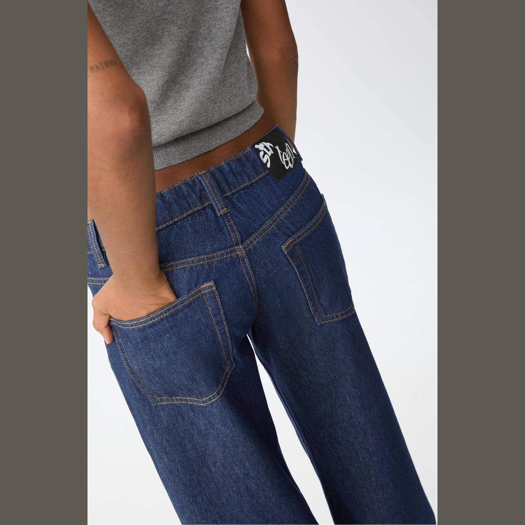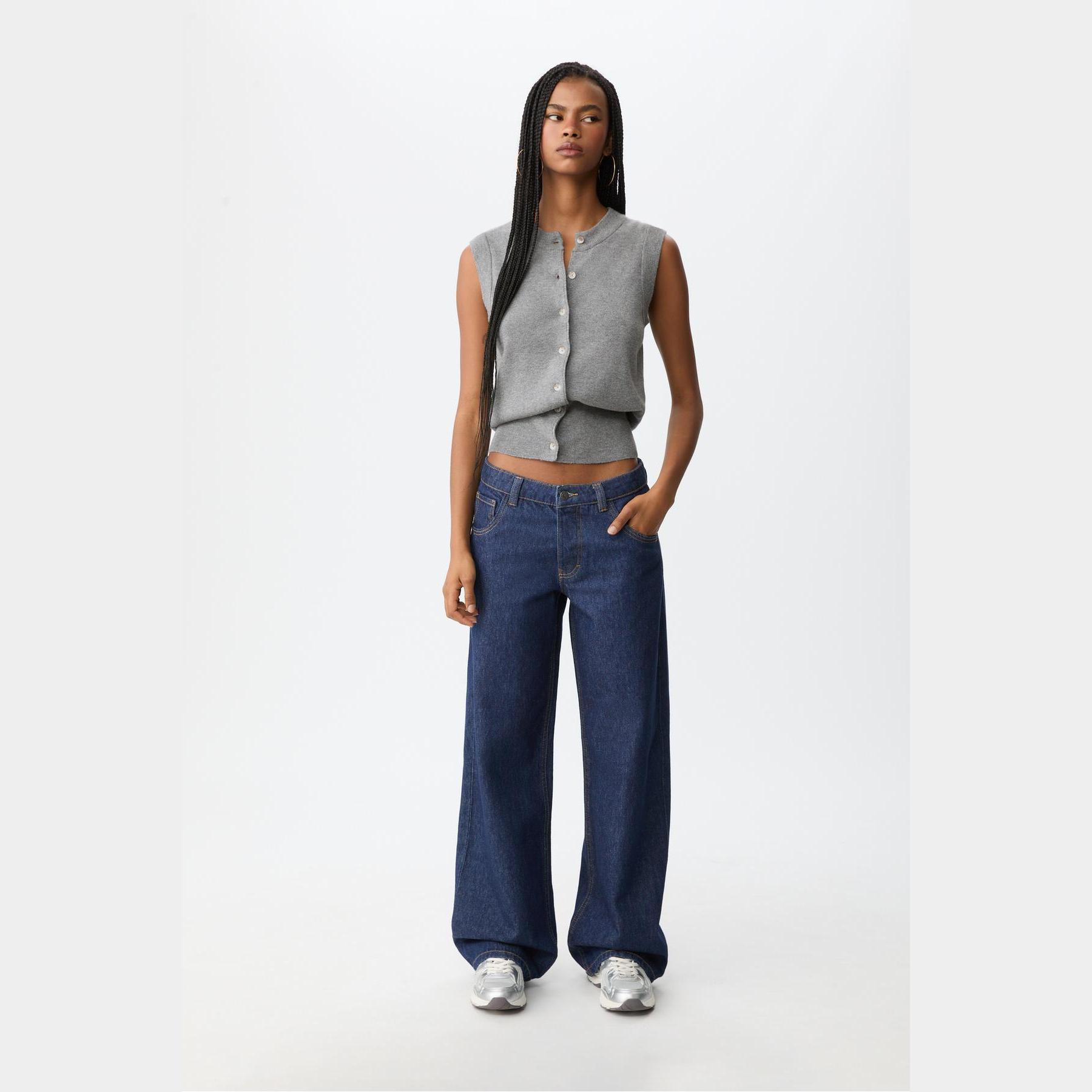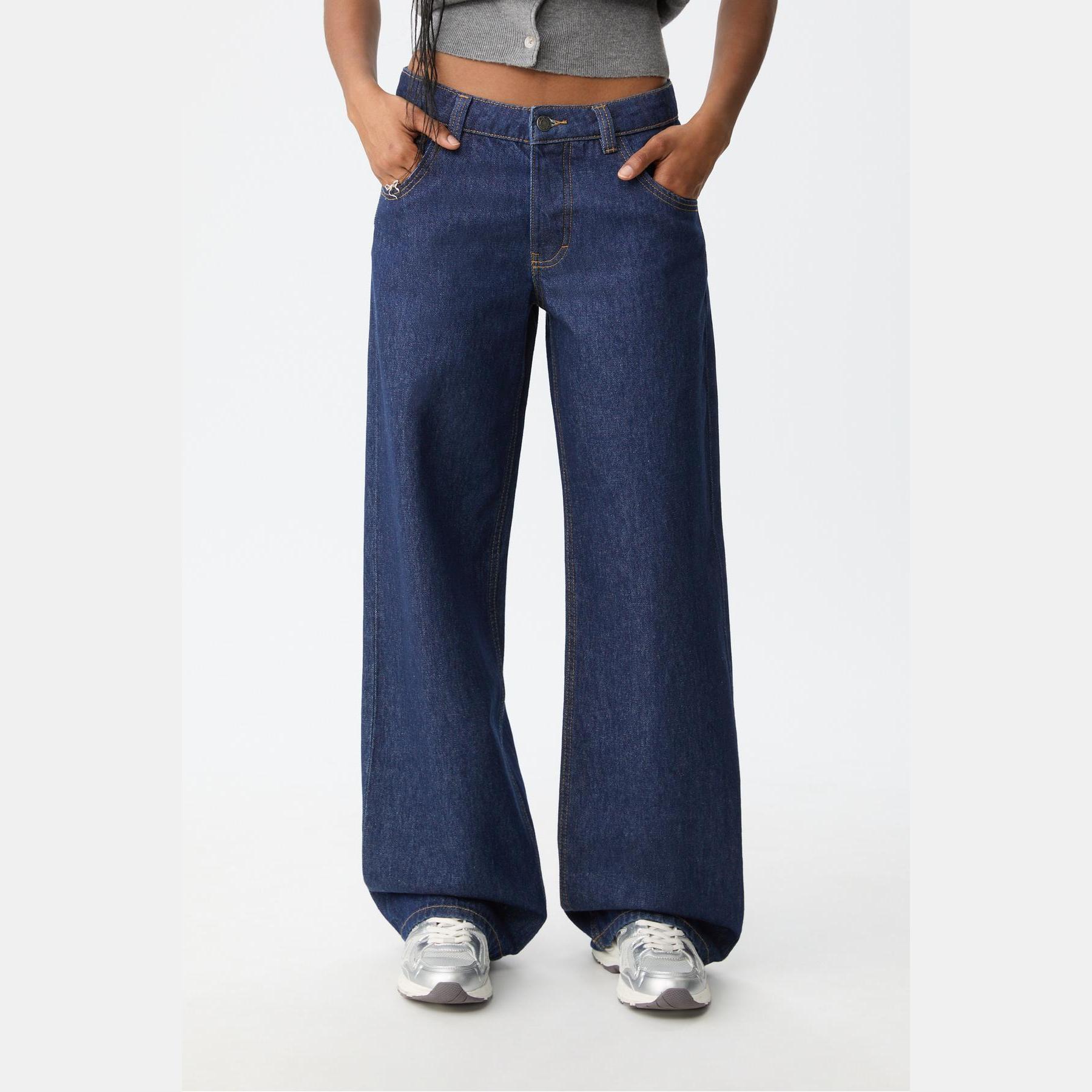 بنطال جينز أنيق من Stradivarius بلون كحلي داكن، مصنوع من خامة قطنية 100% بدون مطاط، يتميز بقصة Baggy فضفاضة وانسيابية (Loose Silhouette) وخصر عادي، مزود بإغلاق أمامي بسحاب وزر معدني، تصميم بخمسة جيوب عملية (أمامية + خلفية)، حلقات حزام، ويأتي مع حزام بنفس اللون، وأطراف مستقيمة بطول قياسي، مثالي للتنسيق مع توبات قصيرة أو جاكيتات دنيم لإطلالة كاجوال مريحة وعصرية.