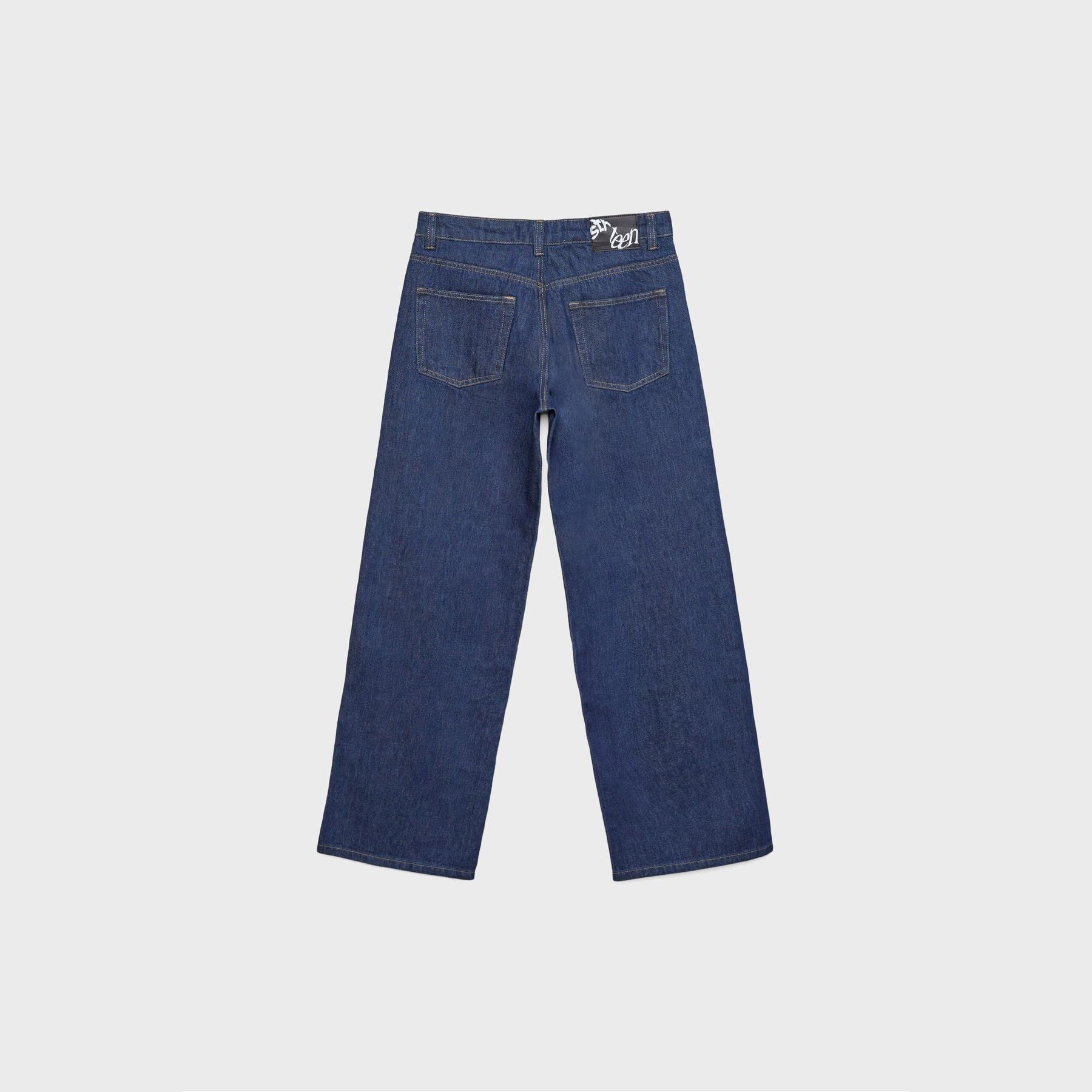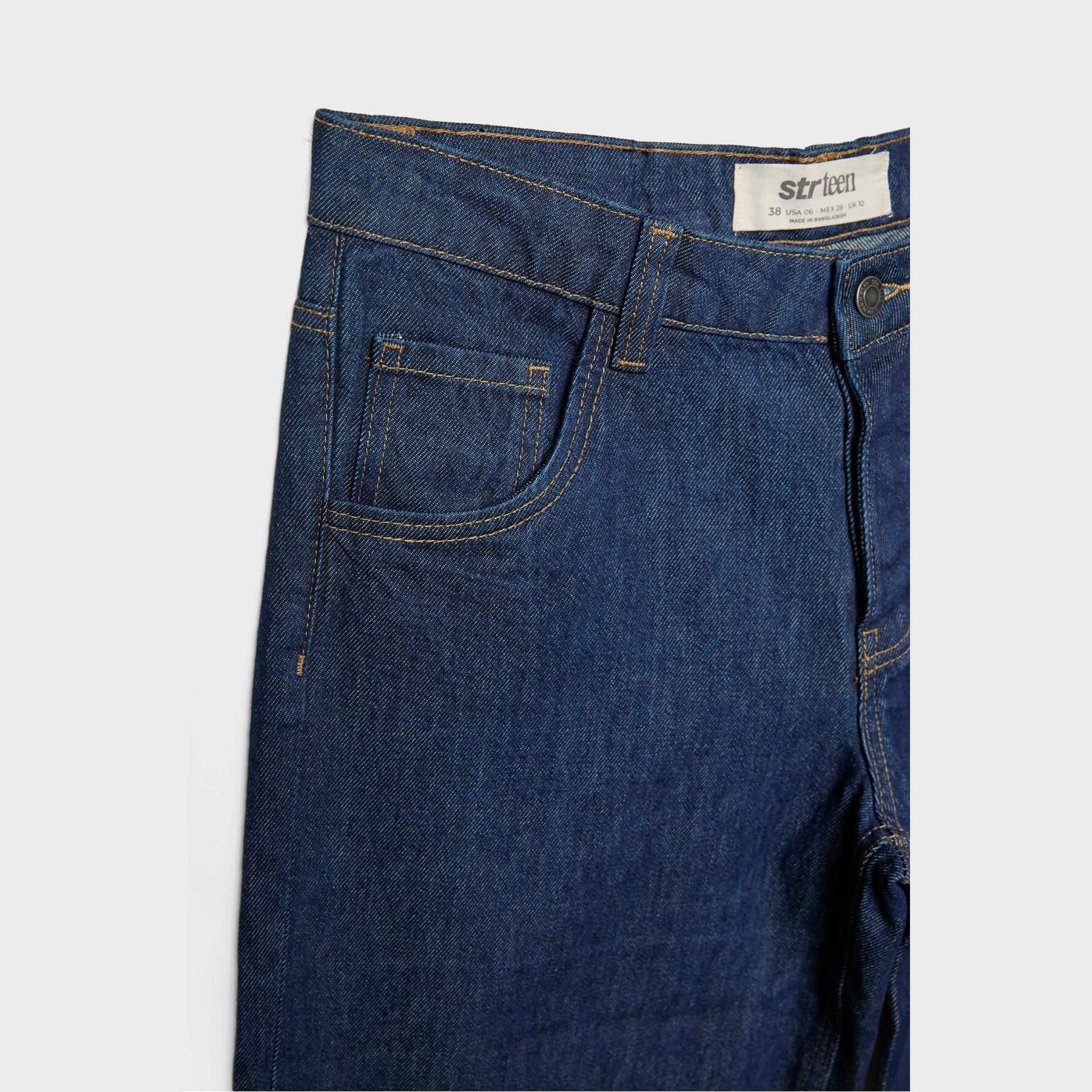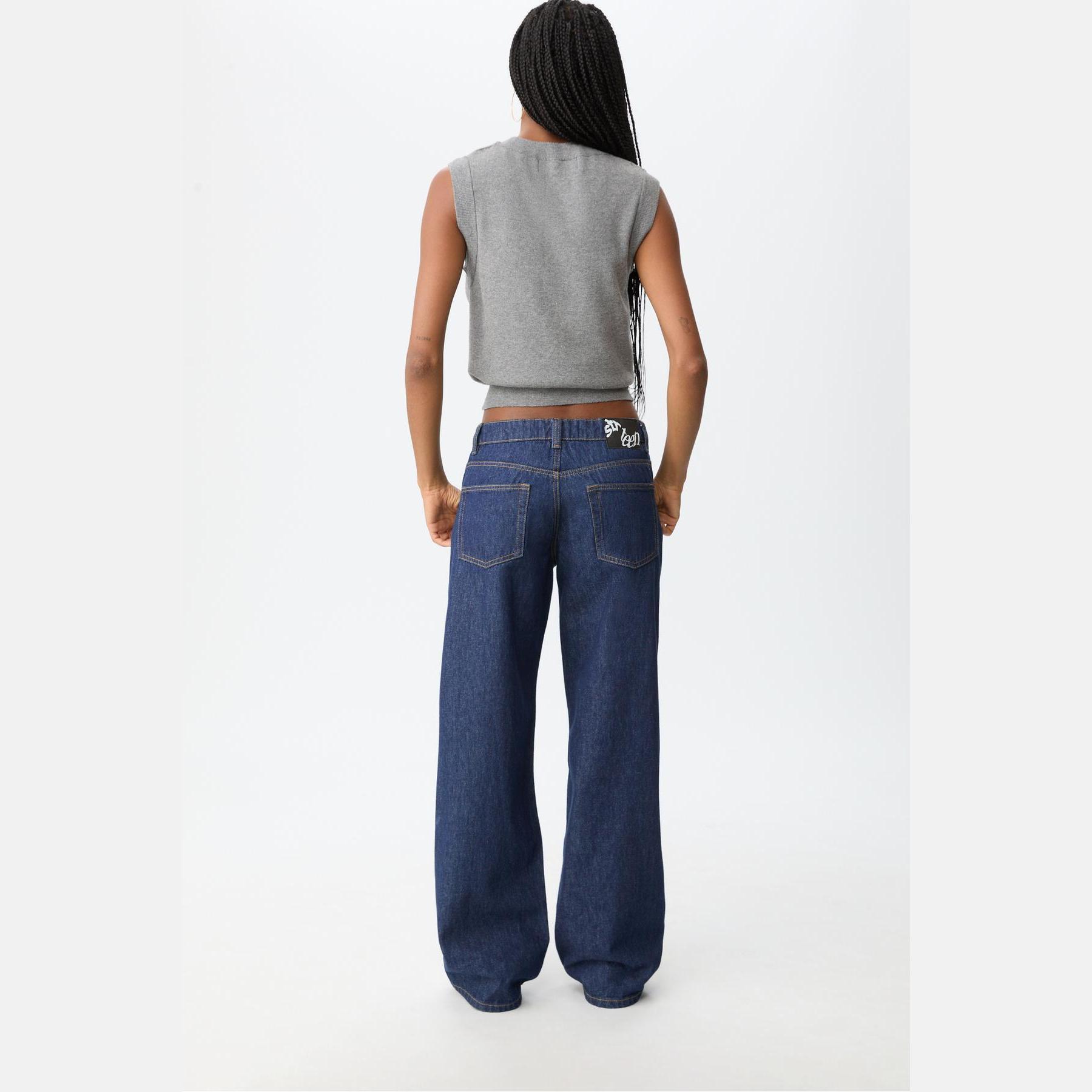 بنطال جينز أنيق من Stradivarius بلون كحلي داكن، مصنوع من خامة قطنية 100% بدون مطاط، يتميز بقصة Baggy فضفاضة وانسيابية (Loose Silhouette) وخصر عادي، مزود بإغلاق أمامي بسحاب وزر معدني، تصميم بخمسة جيوب عملية (أمامية + خلفية)، حلقات حزام، ويأتي مع حزام بنفس اللون، وأطراف مستقيمة بطول قياسي، مثالي للتنسيق مع توبات قصيرة أو جاكيتات دنيم لإطلالة كاجوال مريحة وعصرية.