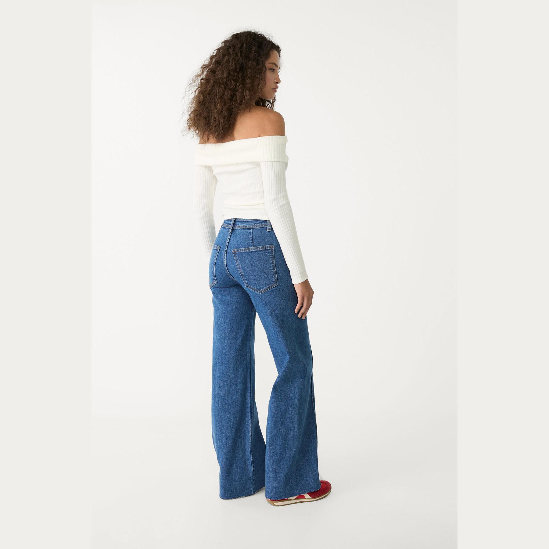بنطال جينز أنيق من Stradivarius بلون أزرق دنيم، مصنوع من خامة قطنية بنسبة 99% مع 1% إيلاستان لمرونة خفيفة، يتميز بقصة مستقيمة مريحة وخصر عالي يغطي منطقة السرة، مزود بإغلاق أمامي بسحاب وزر معدني، تصميم بخمسة جيوب عملية تشمل جيوب أمامية بارزة وخلفية، حلقات حزام، ويأتي مع حزام بنفس اللون، مع دُرز طولي أمامي يضفي لمسة تصميمية مميزة، وأطراف سفلية مشطوبة (Frayed Hem)، مثالي للتنسيق مع توبات قصيرة أو جاكيتات لإطلالة كاجوال أنيقة وعصرية.