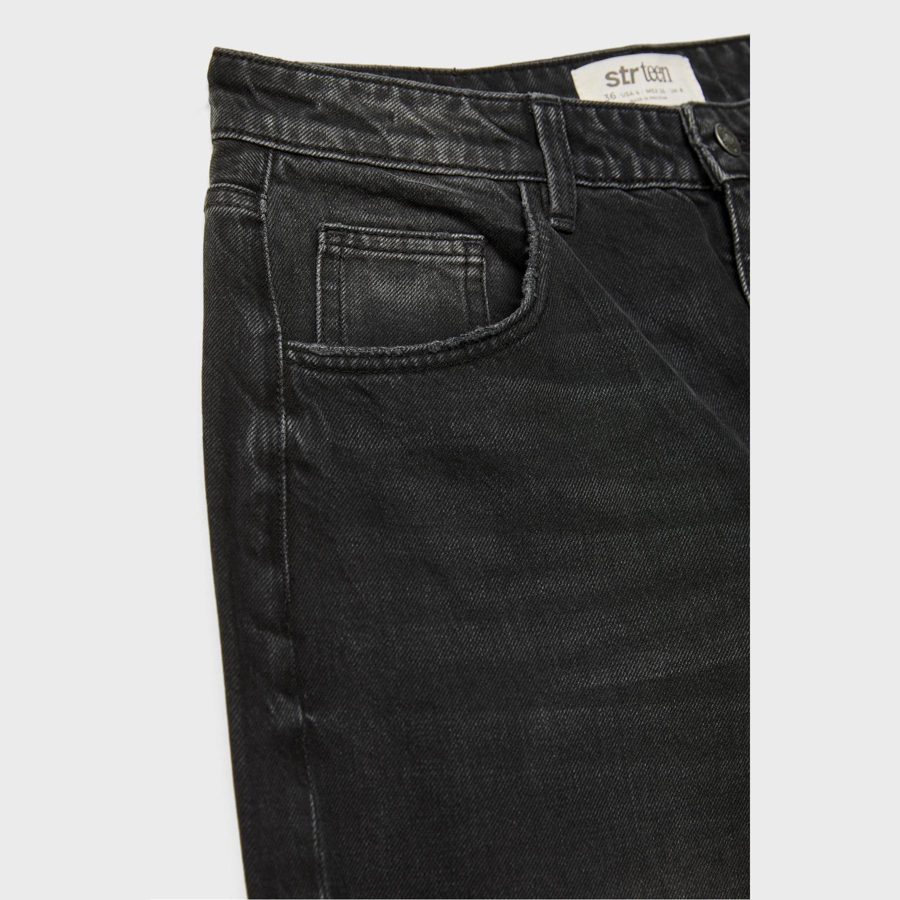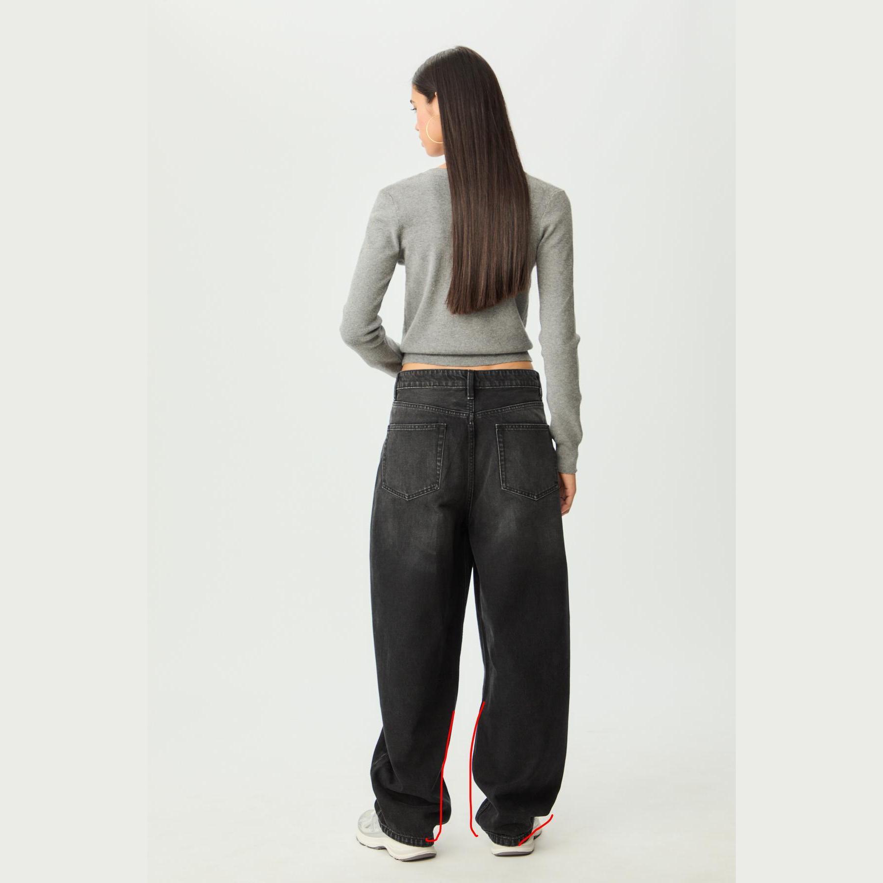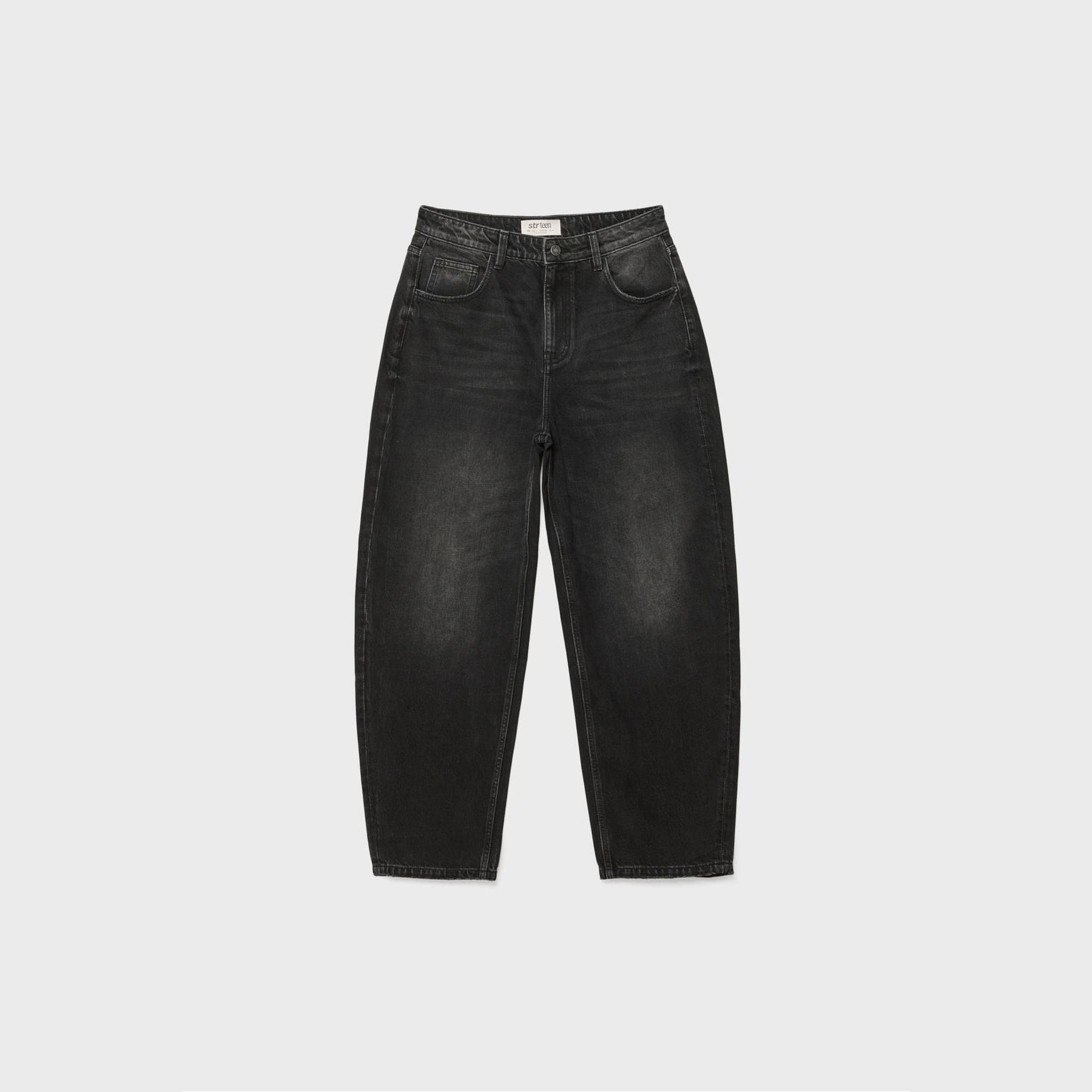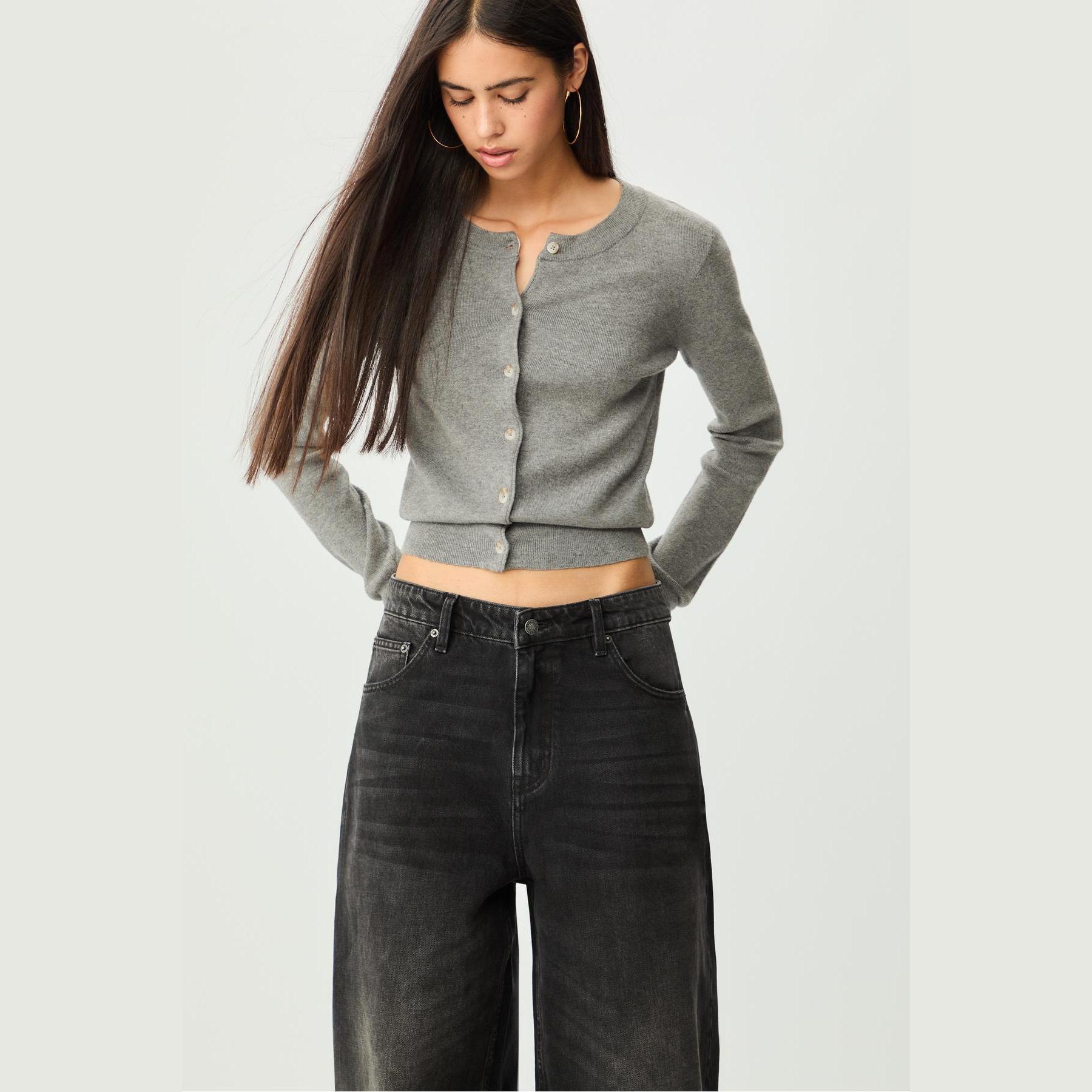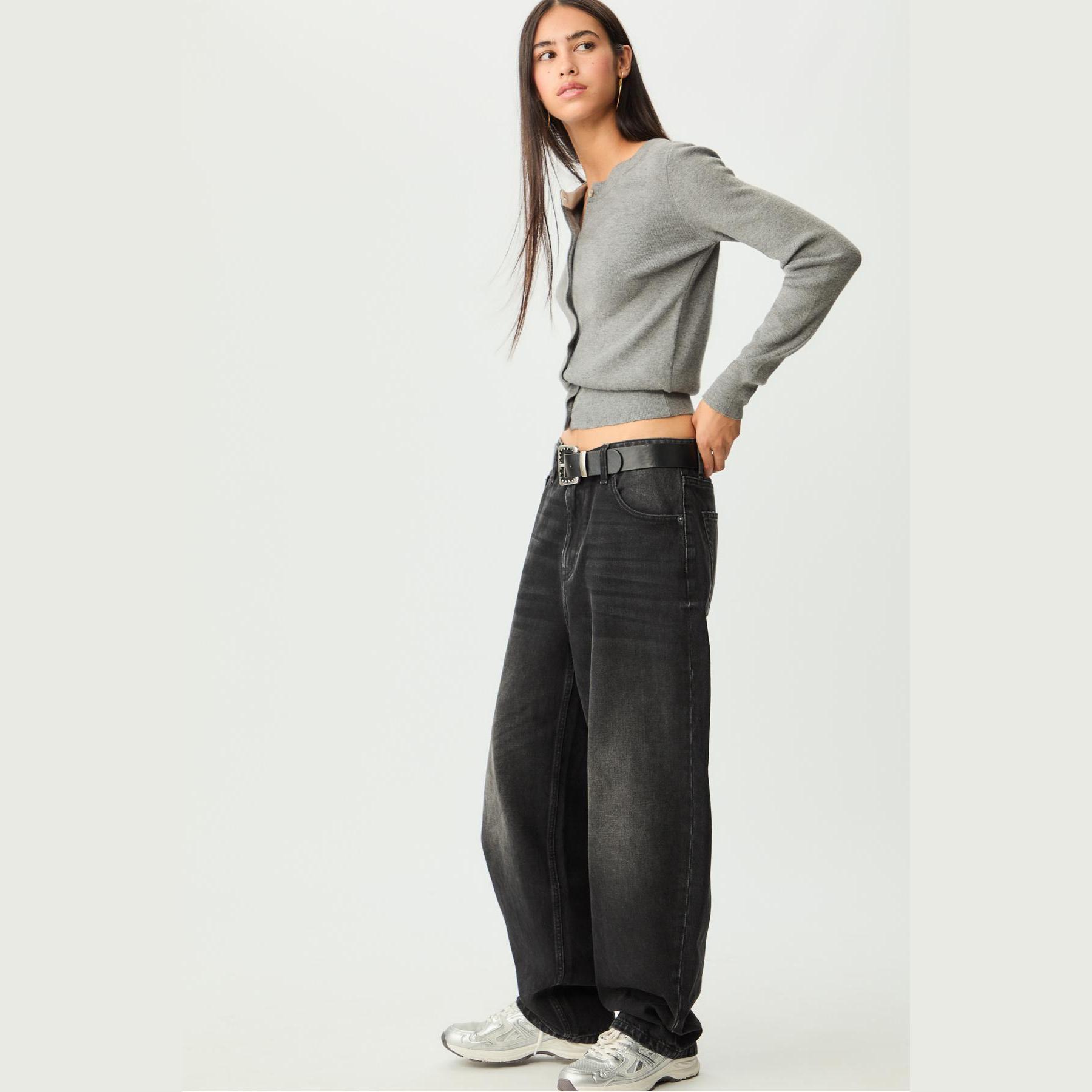 بنطال جينز أنيق من Stradivarius بلون رمادي، مصنوع من خامة قطنية 100% بدون مطاط، يتميز بقصة Baggy واسعة الساق وسيلويت كلوش، مع خصر عادي، مزود بإغلاق أمامي بسحاب وزر معدني، تصميم بخمسة جيوب عملية (أمامية + خلفية)، حلقات حزام، وأطراف بطول قياسي، مثالي للتنسيق مع توبات قصيرة أو جاكيتات لإطلالة كاجوال مريحة وعصرية.