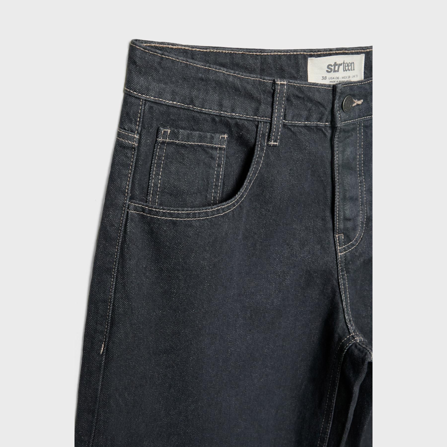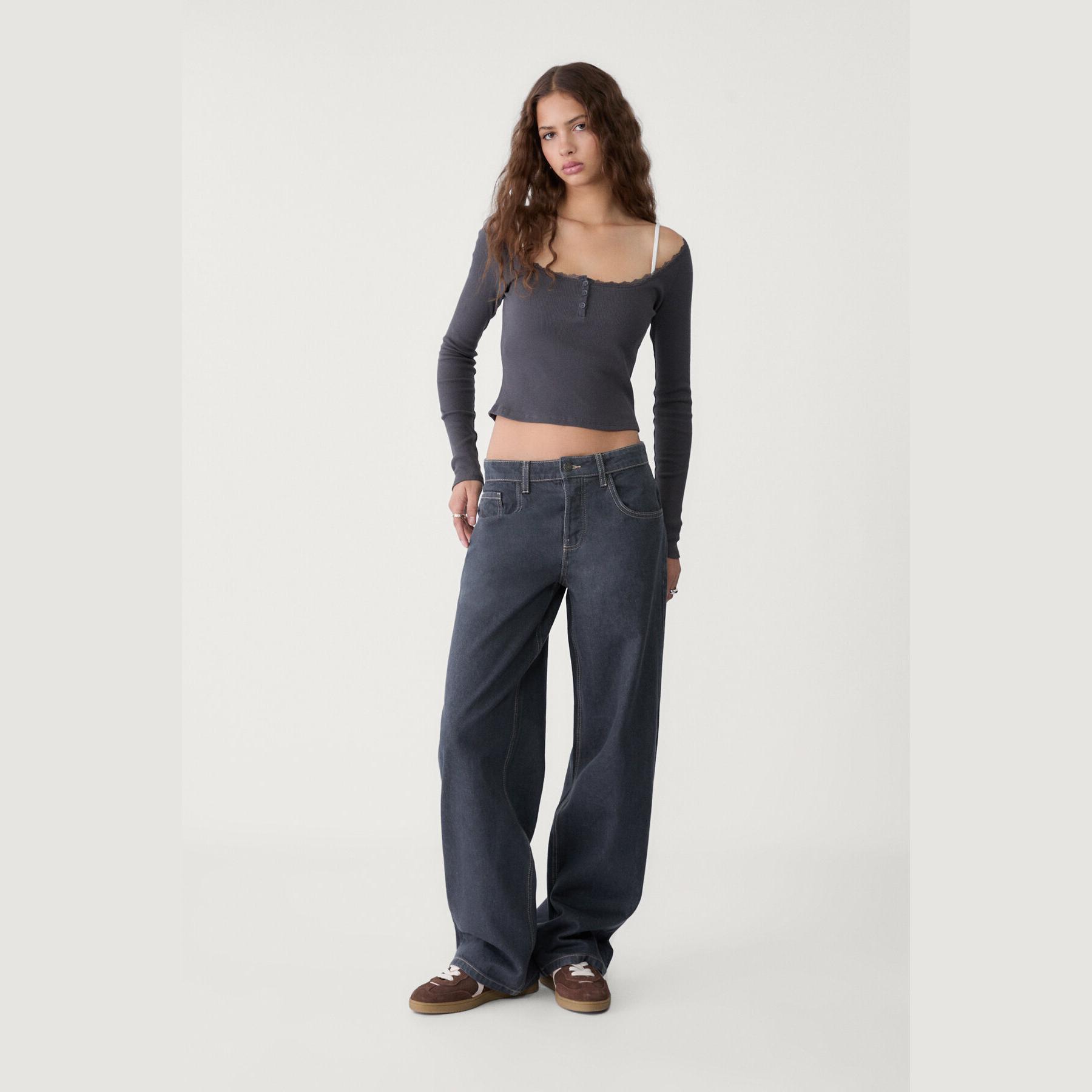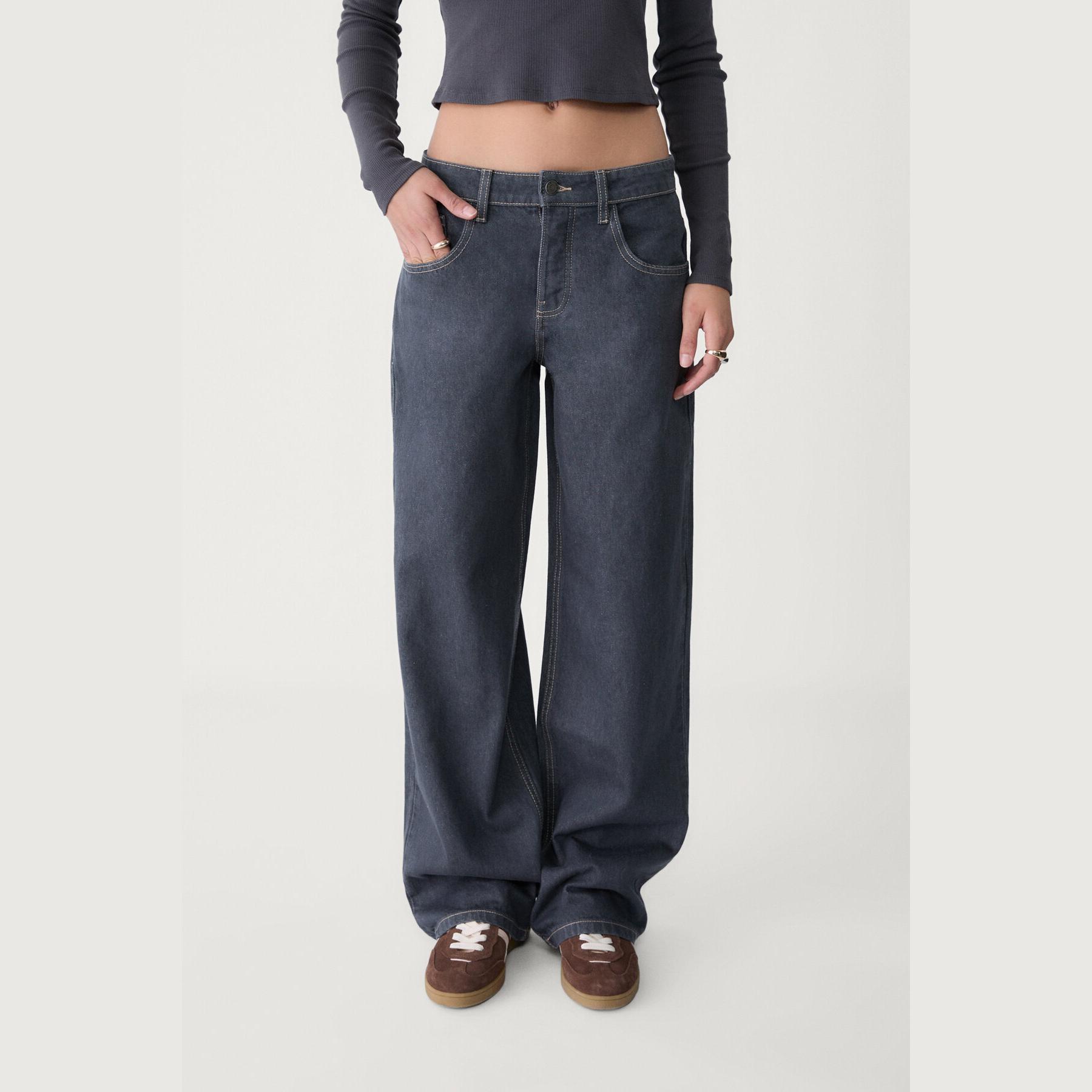 بنطال جينز أنيق من Stradivarius بلون أزرق دنيم، مصنوع من خامة قطنية 100% بدون مطاط، يتميز بقصة مستقيمة واسعة (Straight Fit – Loose Baggy) وخصر عادي، مزود بإغلاق أمامي بسحاب وزر معدني، تصميم بخمسة جيوب عملية (أمامية + خلفية)، حلقات حزام، ويأتي مع حزام بنفس اللون، وأطراف بطول قياسي، مثالي للتنسيق مع توبات قصيرة أو جاكيتات لإطلالة كاجوال مريحة وعصرية.