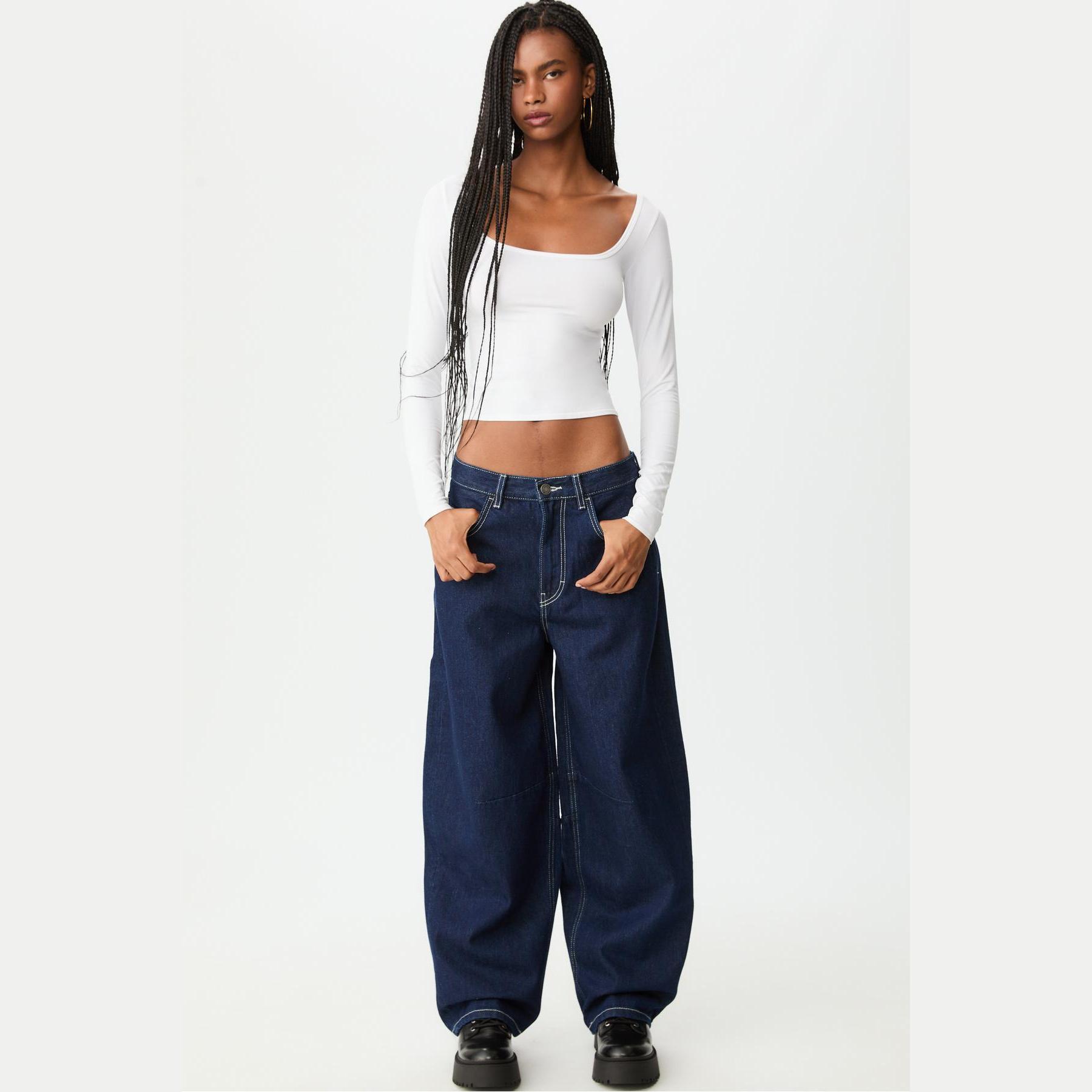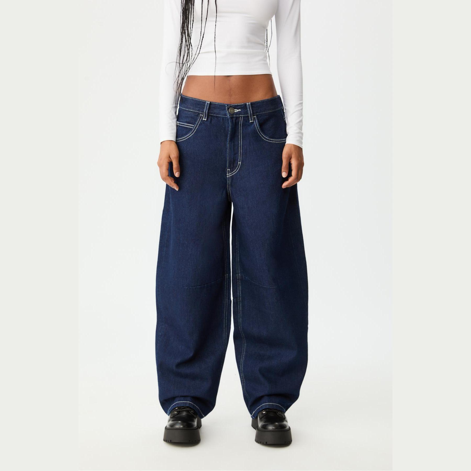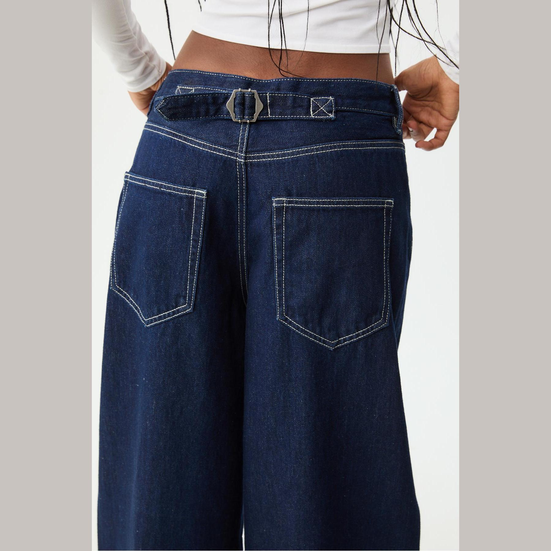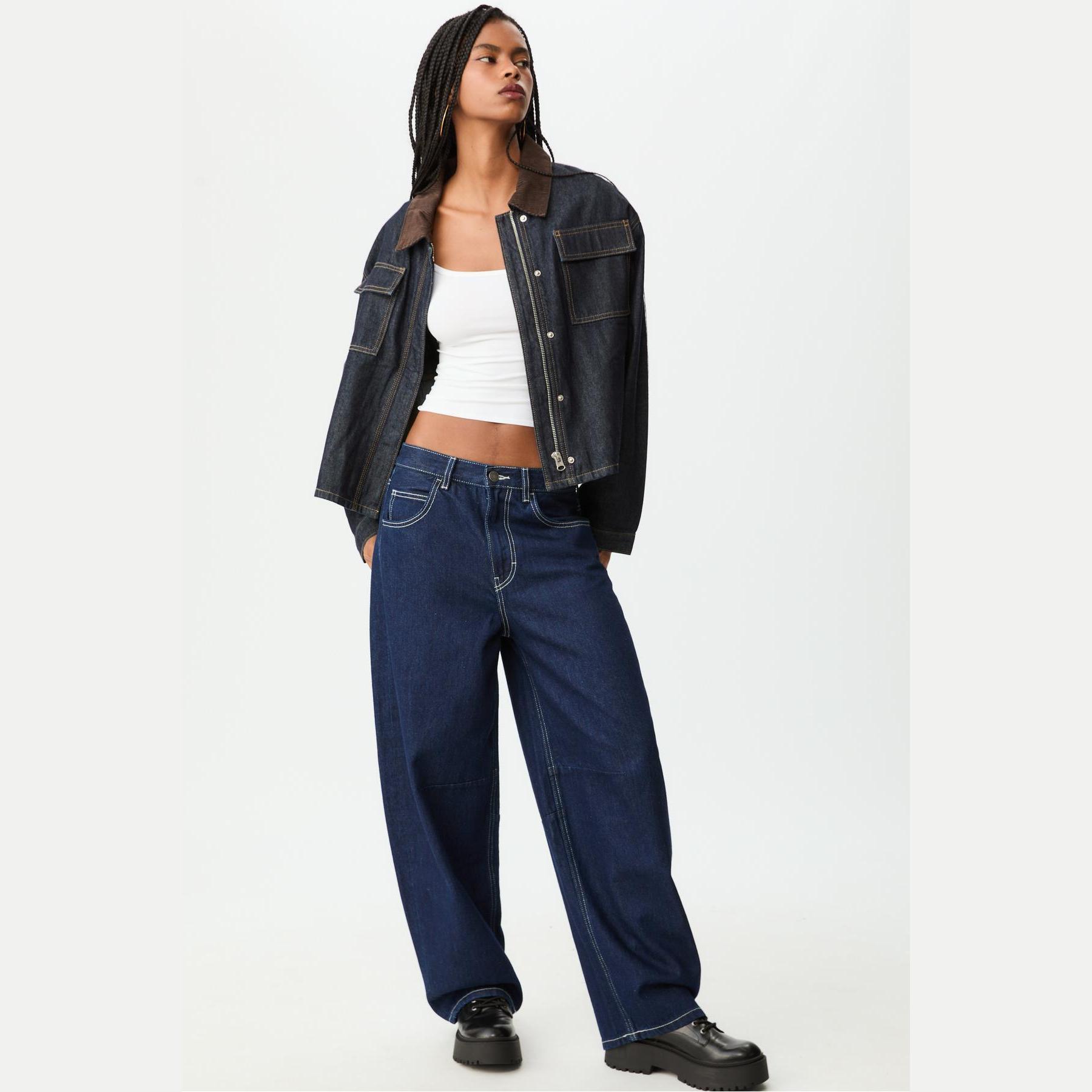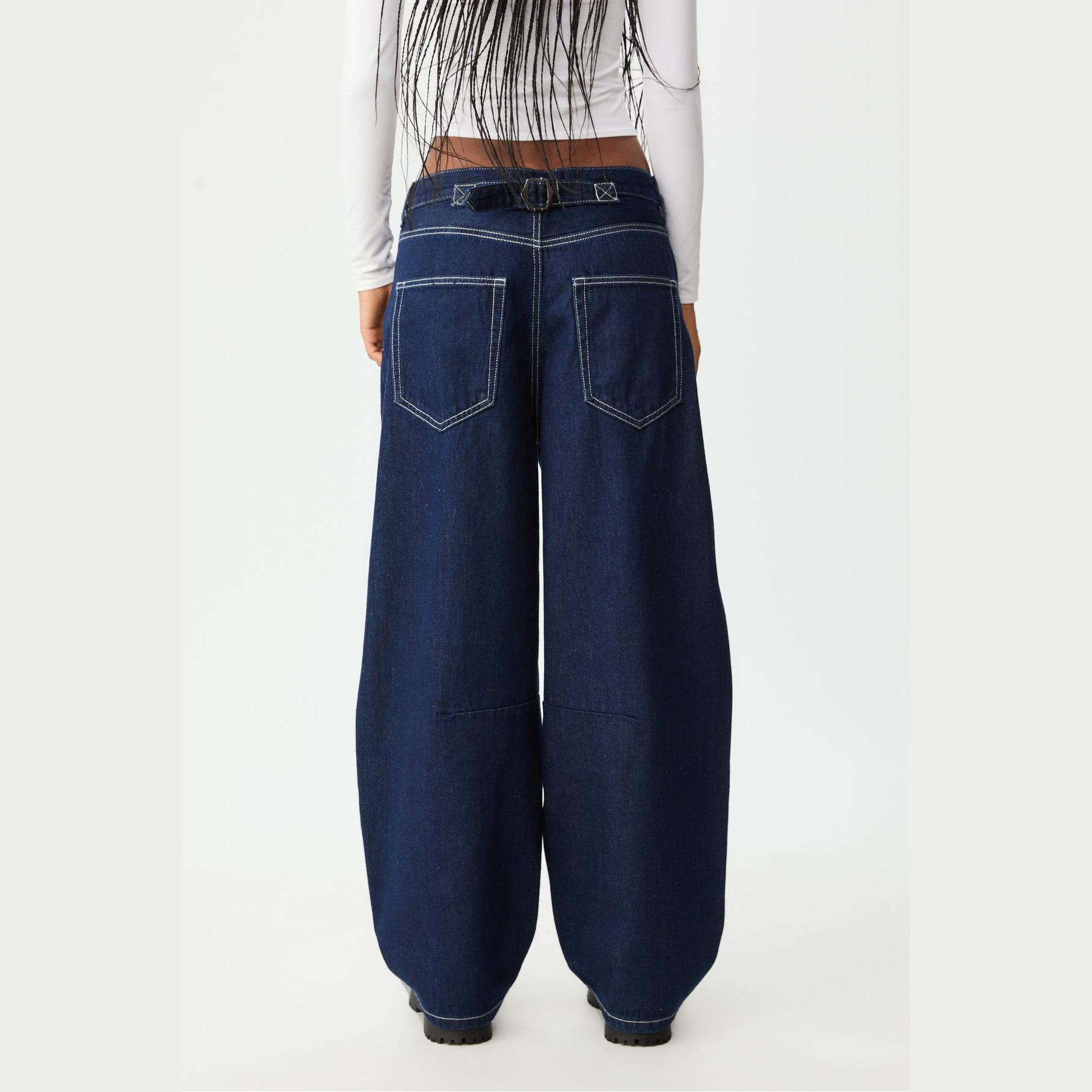 بنطال جينز أنيق من Stradivarius بلون كحلي داكن، مصنوع من خامة قطنية 100% بدون مطاط، يتميز بقصة Barrel واسعة عند الورك وتضيق تدريجيًا نحو الأسفل، مع خصر متوسط وخصائص قابلة للتعديل من الخلف، مزود بإغلاق أمامي بسحاب وزر معدني، تصميم بخمسة جيوب عملية (أمامية + خلفية)، حلقات حزام، وأطراف بطول قياسي، مثالي للتنسيق مع توبات قصيرة أو جاكيتات لإطلالة كاجوال مريحة وعصرية.