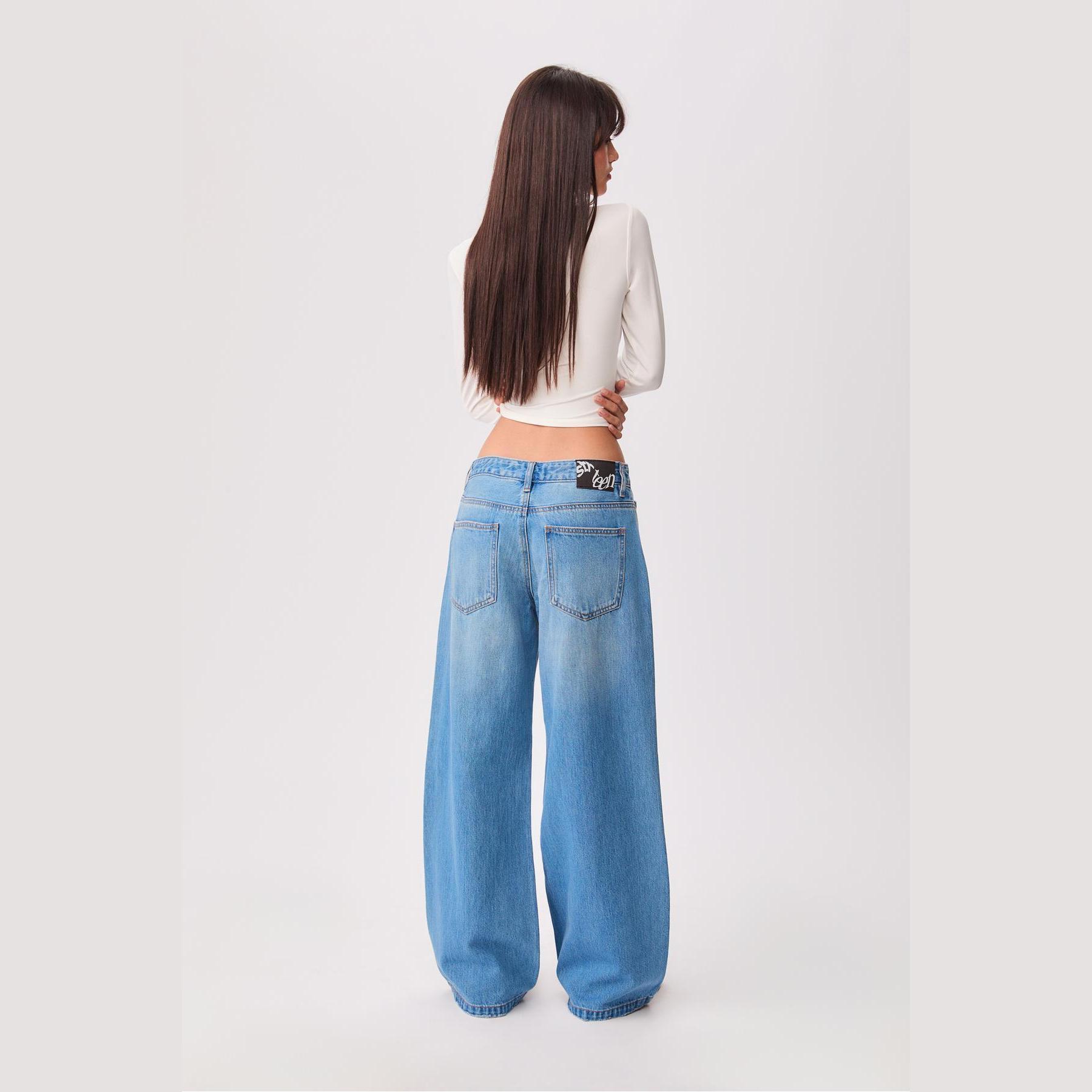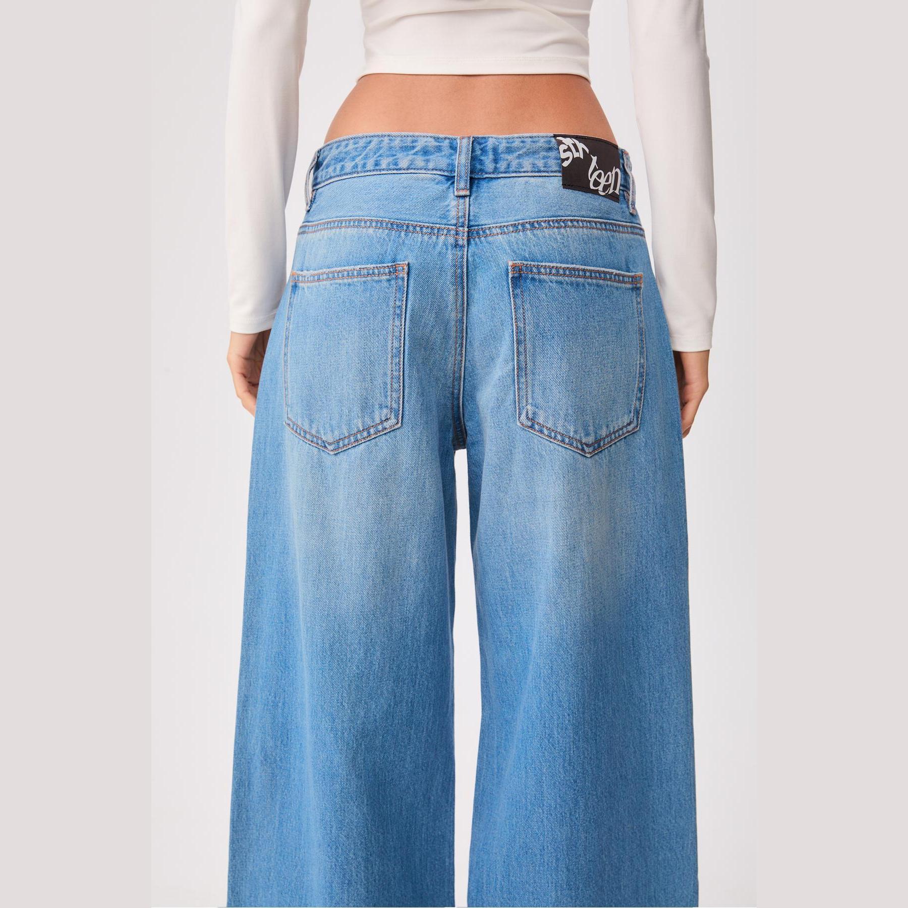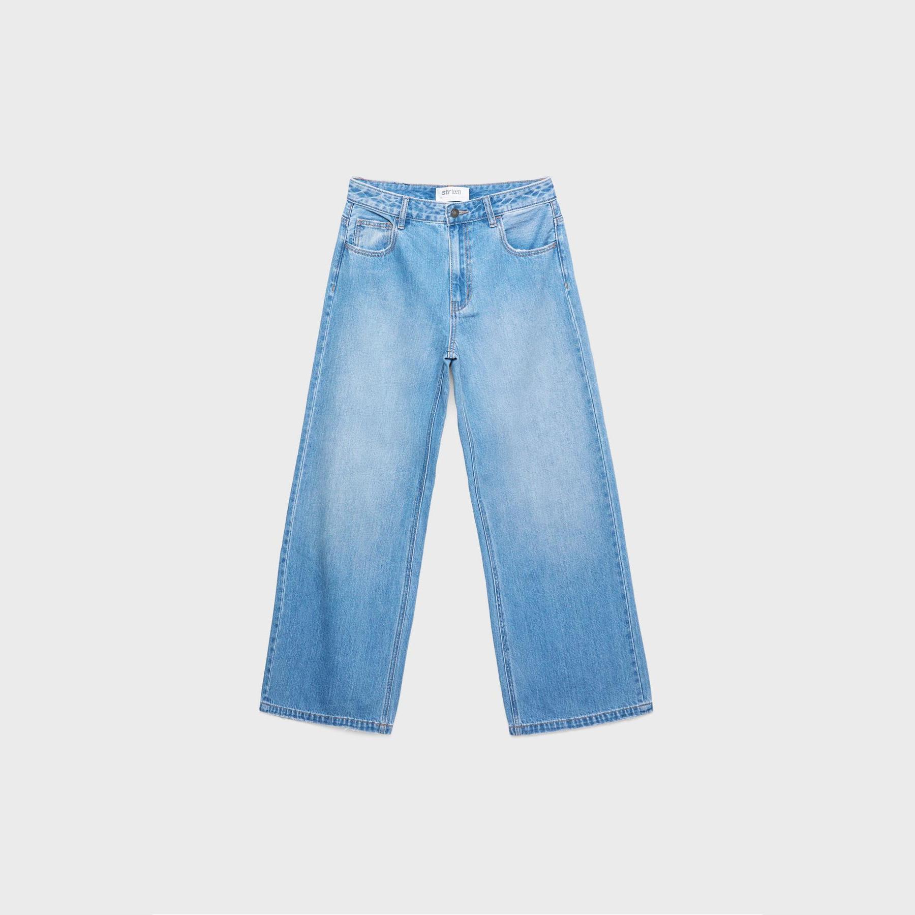 بنطال جينز أنيق من Stradivarius بلون دنيم أزرق متوسط بتأثير باهت (Soluk Efektli Orta Mavi Denim)، مصنوع من خامة قطنية 100% بدون مطاط، يتميز بقصة واسعة الساق (Wide Leg) وخصر عادي، مزود بإغلاق أمامي بسحاب وزر معدني، تصميم بخمسة جيوب عملية (أمامية + خلفية)، حلقات حزام، ويأتي مع حزام بنفس اللون، وأطراف بطول قياسي، مثالي للتنسيق مع توبات قصيرة أو جاكيتات لإطلالة كاجوال مريحة وعصرية.