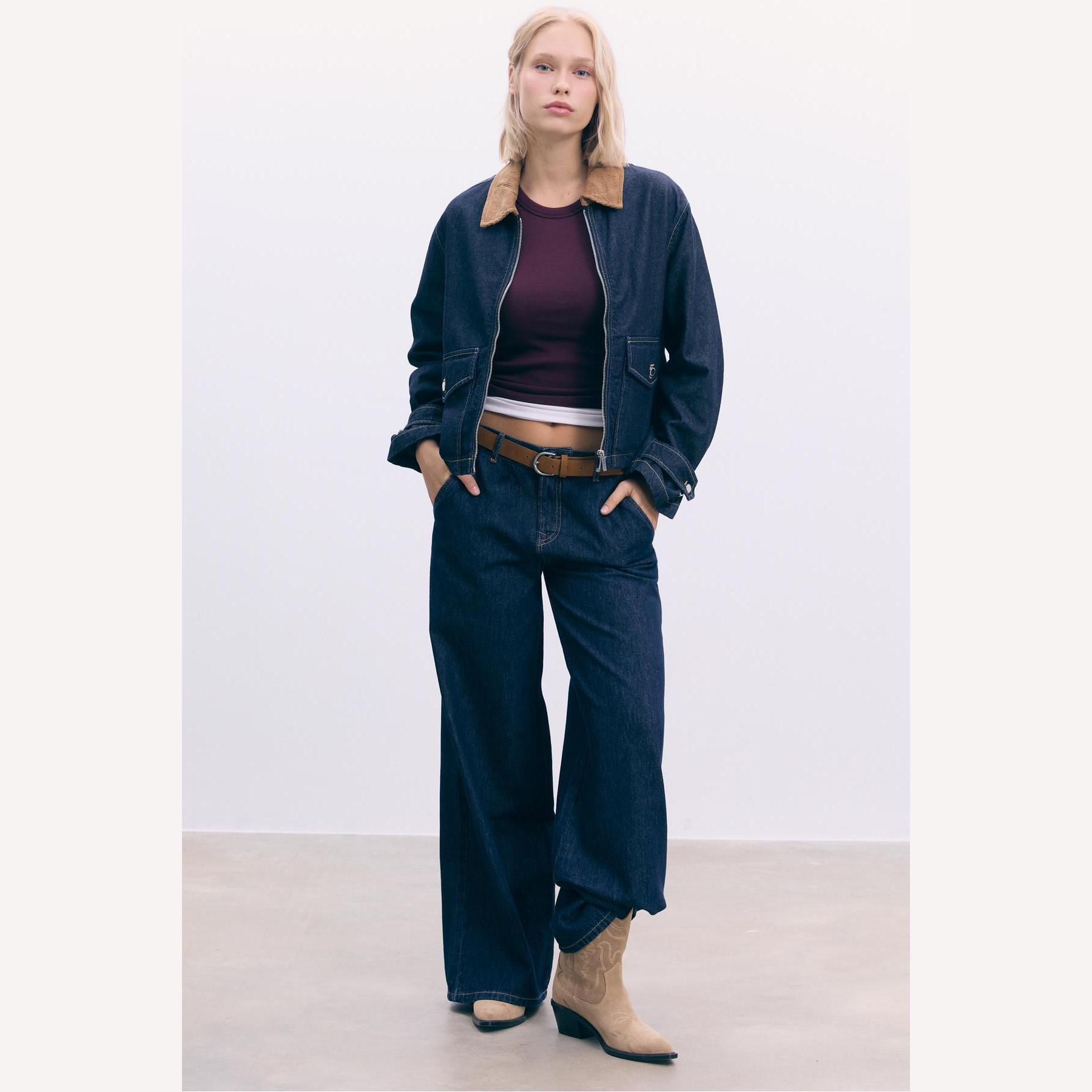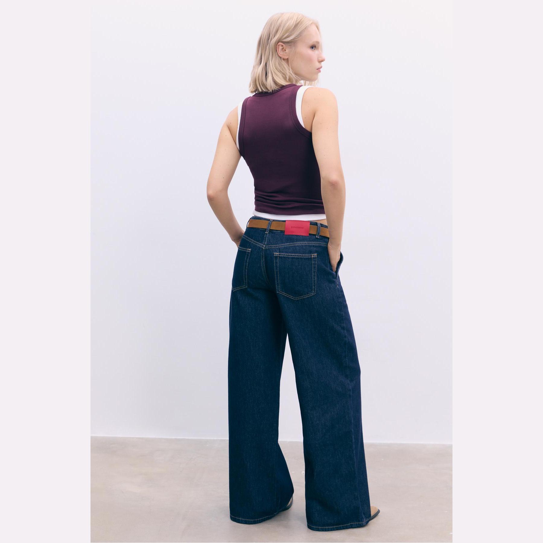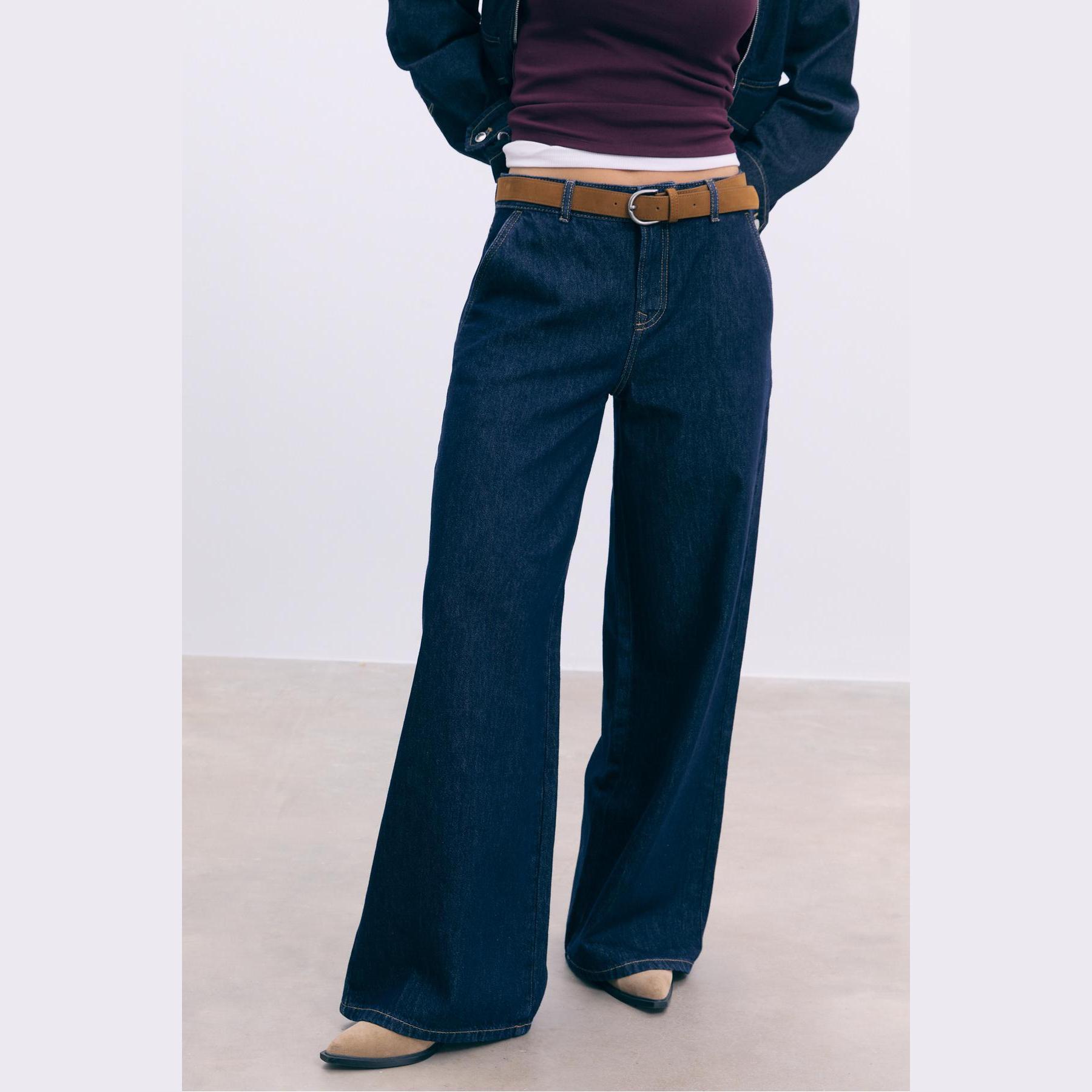بنطال جينز أنيق من Stradivarius بلون كحلي داكن، مصنوع من خامة قطنية 100% بدون مطاط، يتميز بقصة واسعة مريحة (Relaxed Wide Fit) وخصر عادي، مزود بإغلاق أمامي بسحاب وزر معدني، تصميم بخمسة جيوب عملية (أمامية + خلفية)، حلقات حزام، ويأتي مع حزام قابل للإزالة بلون متباين، وأطراف سفلية واسعة (Flared Hem)، مثالي للتنسيق مع توبات قصيرة أو جاكيتات لإطلالة كاجوال أنيقة وعصرية.
