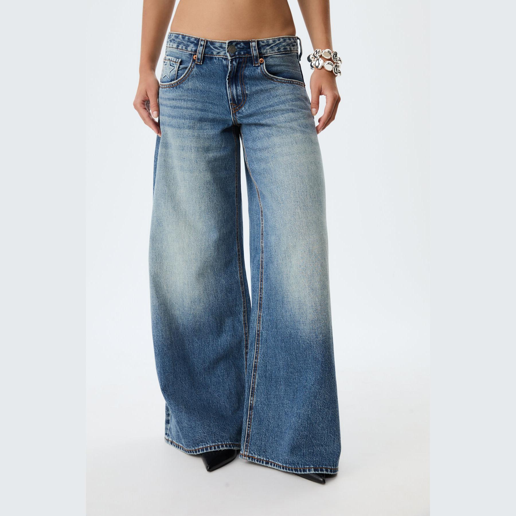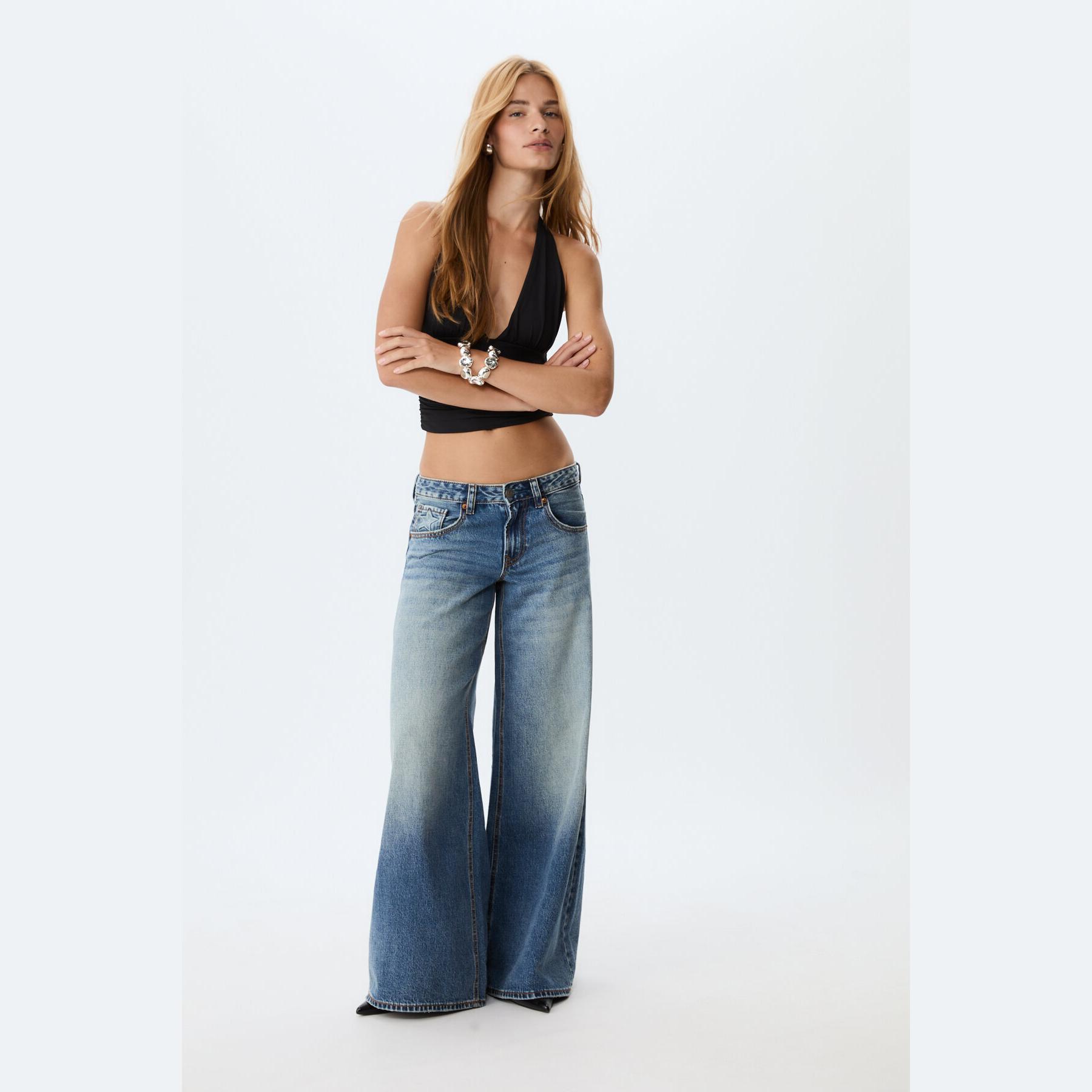 بنطال جينز أنيق من Stradivarius بلون دنيم أزرق متوسط بتأثير باهت، مصنوع من خامة قطنية 100% بدون مطاط، يتميز بقصة واسعة الساق (Wide Leg) وخصر منخفض، مزود بإغلاق أمامي بسحاب وزر معدني، تصميم بخمسة جيوب عملية تشمل جيوب أمامية وأخرى خلفية مزينة بتطريز نجوم بارزة، حلقات حزام، ويأتي مع حزام بنفس اللون، وأطراف بطول قياسي، مثالي للتنسيق مع توبات قصيرة أو جاكيتات دنيم لإطلالة كاجوال مريحة وعصرية.