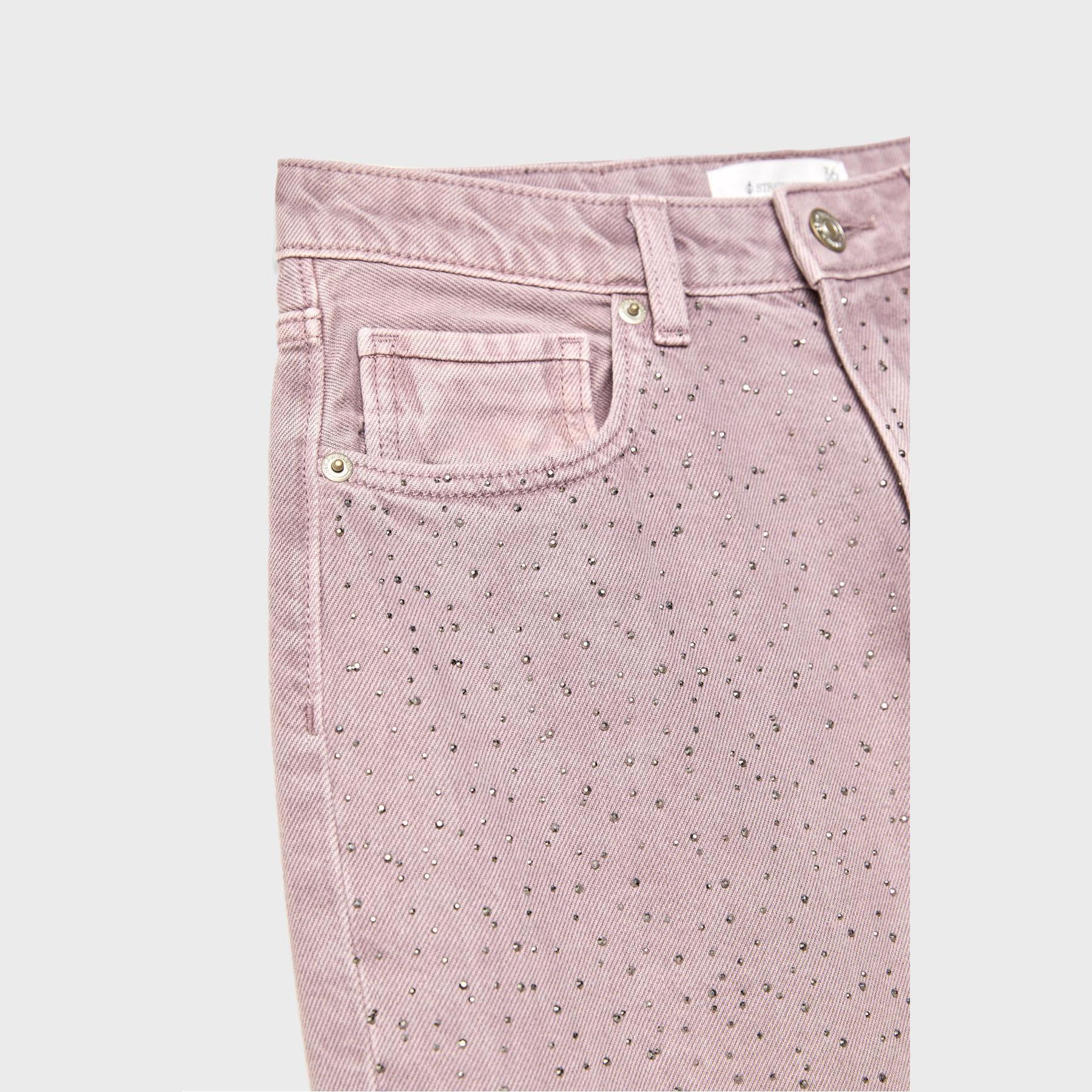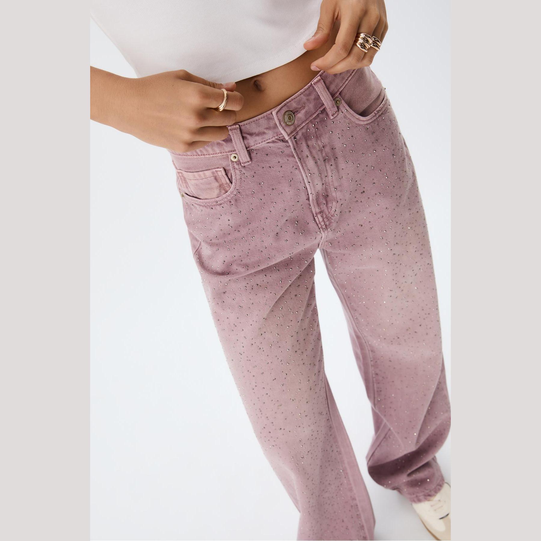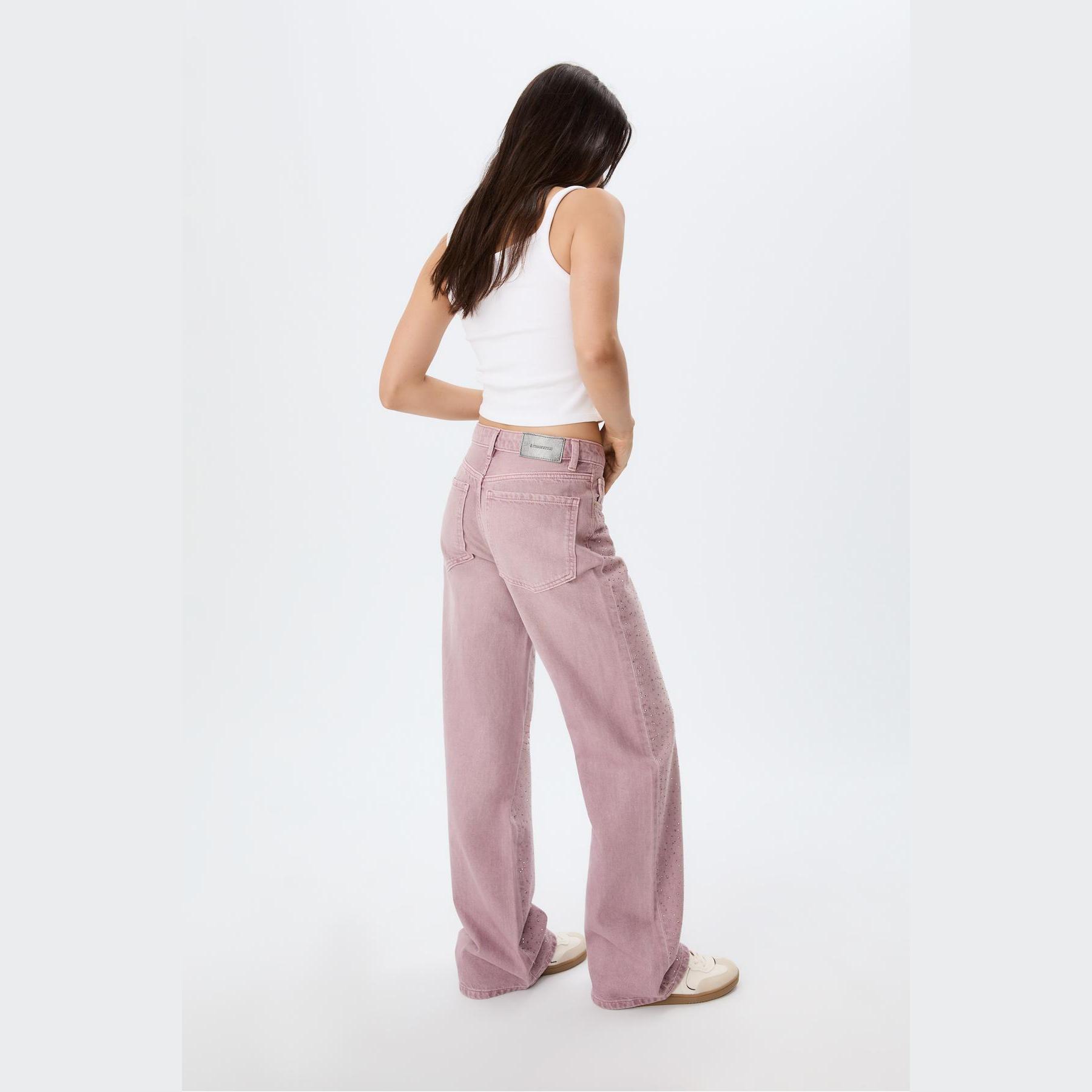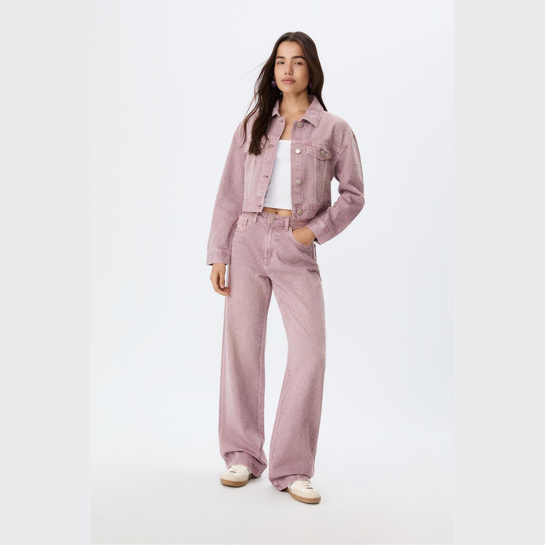 بنطال جينز أنيق من Stradivarius بلون زهر لامع، مصنوع من خامة قطنية 100% بدون مطاط، يتميز بقصة مستقيمة (Straight Fit) وخصر عادي، مزود بإغلاق أمامي بسحاب وزر معدني، تصميم بخمسة جيوب عملية (أمامية + خلفية)، حلقات حزام، بدون حزام، ويأتي بتفاصيل براقة على الجزء الأمامي تضيف لمسة جمالية ملفتة، وأطراف مستقيمة بطول قياسي، مثالي للتنسيق مع توبات سوداء أو قطع جلدية لإطلالة مسائية أنيقة.
