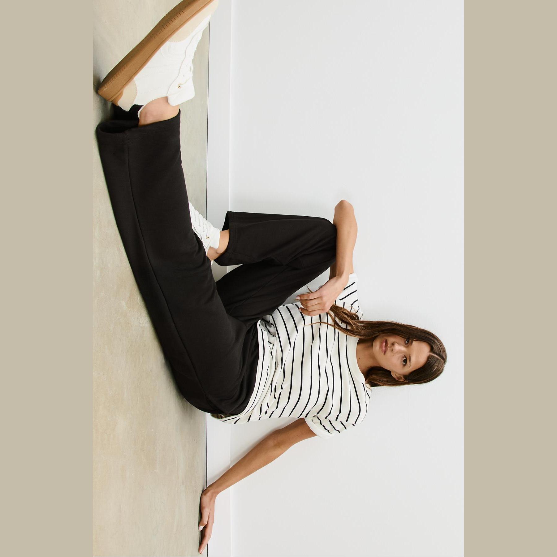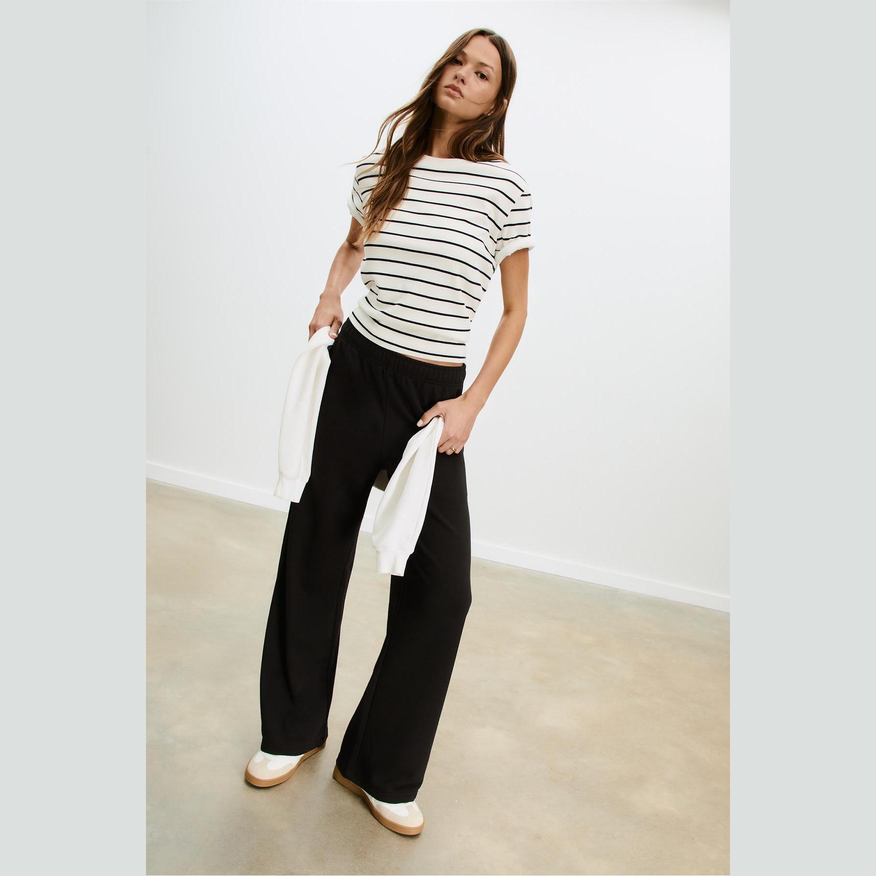 بنطال عملي من Stradivarius بلون أسود، مصنوع من خامة متينة بتركيبة 56% بوليستر، 44% قطن، يتميز بقصة Culotte واسعة، خصر متوسط برباط داخلي قابل للتعديل، أرجل مستقيمة وواسعة، تصميم سادة بدون طبعات، مزود بجيبين جانبيين، بدون أزرار أو سحاب، ملمس داخلي ناعم، بدون بطانة، مثالي للتنسيق مع سويت شيرت أو تيشيرت لإطلالة كاجوال يومية.