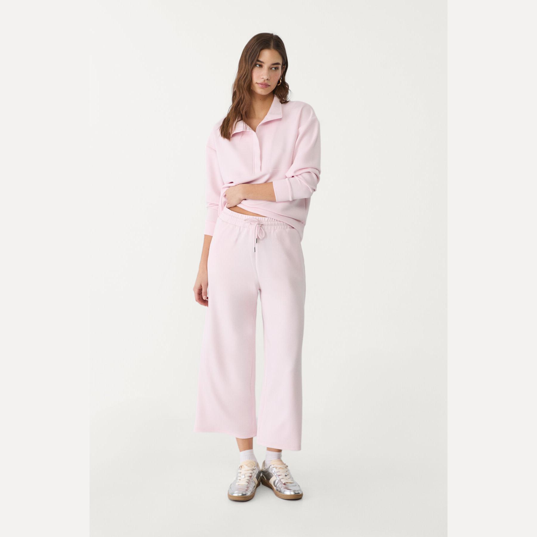 بنطال أنيق من Stradivarius بلون وردي، مصنوع من خامة ناعمة بتركيبة 49% مودال، 41% بوليستر، 10% إيلاستان، يتميز بقصة Culotte مستقيمة وواسعة، خصر متوسط بخصر مطاطي ورباط داخلي قابل للتعديل، تصميم سادة بدون طبعات، مزود بجيبين جانبيين، ملمس داخلي ناعم، بدون بطانة، مثالي للتنسيق مع كنزة محبوكة أو تيشيرت لإطلالة كاجوال ناعمة.