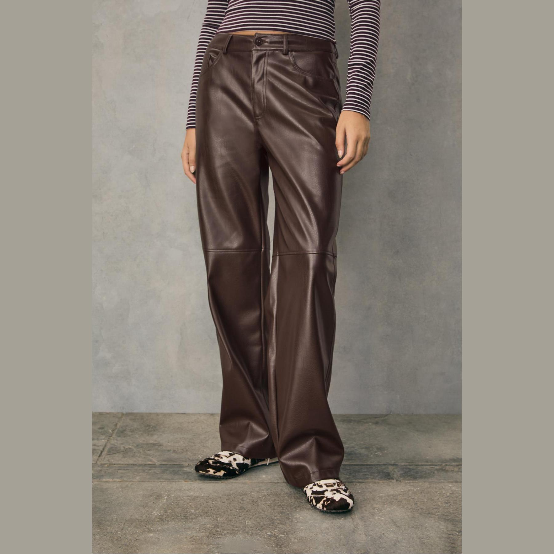 بنطال أنيق من Stradivarius بلون بني، مصنوع من خامة صناعية بتركيبة 50% بوليستر، 50% بولي يوريثان، يتميز بقصة مستقيمة، خصر متوسط مع حلقات للحزام، إغلاق أمامي بسحاب وزر، أرجل طويلة بقصة مستقيمة، تصميم سادة بملمس محبب، مزود بجيبين أماميين وجيوب خلفية، بدون بطانة، ملمس داخلي ناعم، مثالي للتنسيق مع بلوزة ساتان أو جاكيت جلد لإطلالة مسائية جريئة.