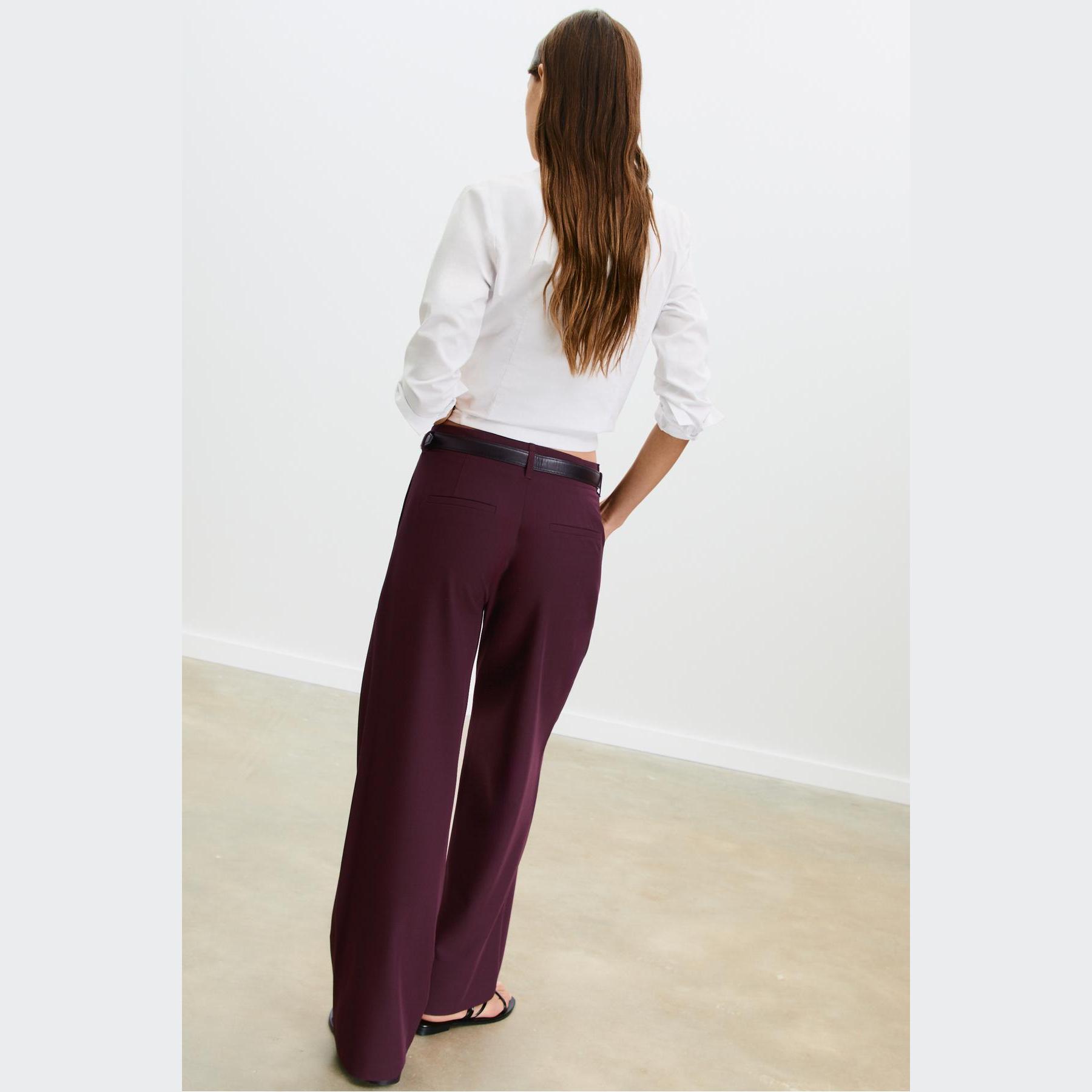 بنطال أنيق من Stradivarius بلون بنفسجي، مصنوع من خامة مرنة بتركيبة 78% بوليستر، 16% فيسكوز، 6% إيلاستان، يتميز بقصة Straight Fit مريحة، خصر متوسط مع حزام قابل للإزالة وتفاصيل إبزيم معدني، إغلاق أمامي بسحاب، زر، دبوس داخلي وكبسة معدنية، مزود بجيبين أماميين وجيوب خلفية وهمية، تصميم سادة بدون طبعات، ملمس داخلي ناعم، بدون بطانة، مثالي للتنسيق مع قميص أو بلوزة لإطلالة مكتبية أو أنيقة.