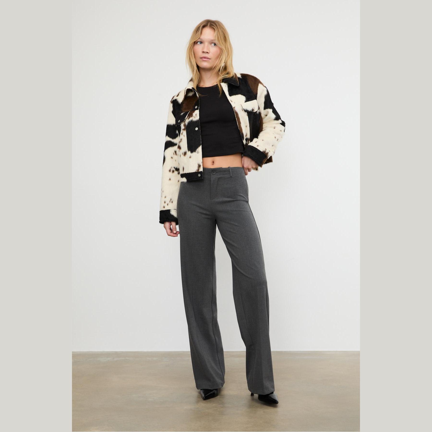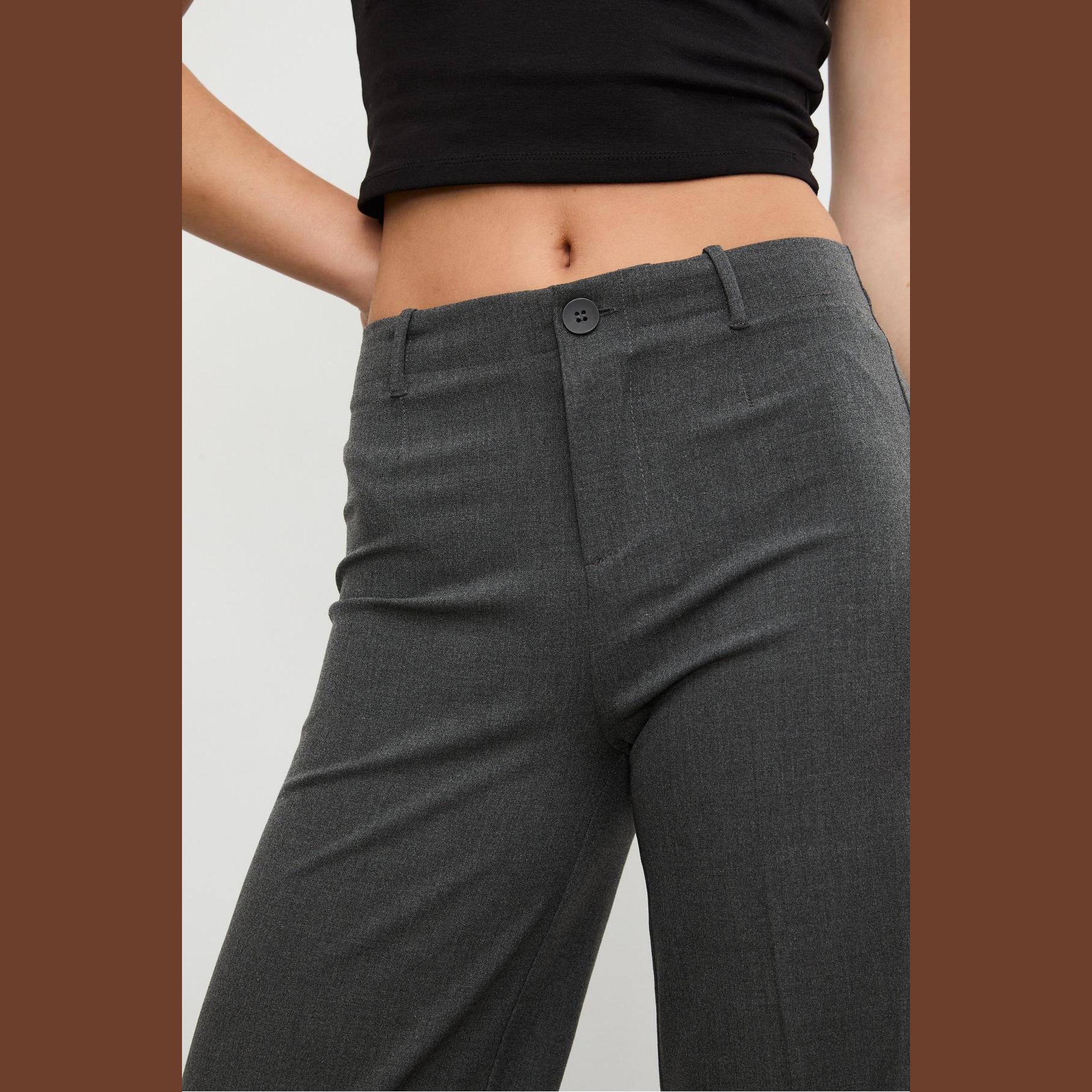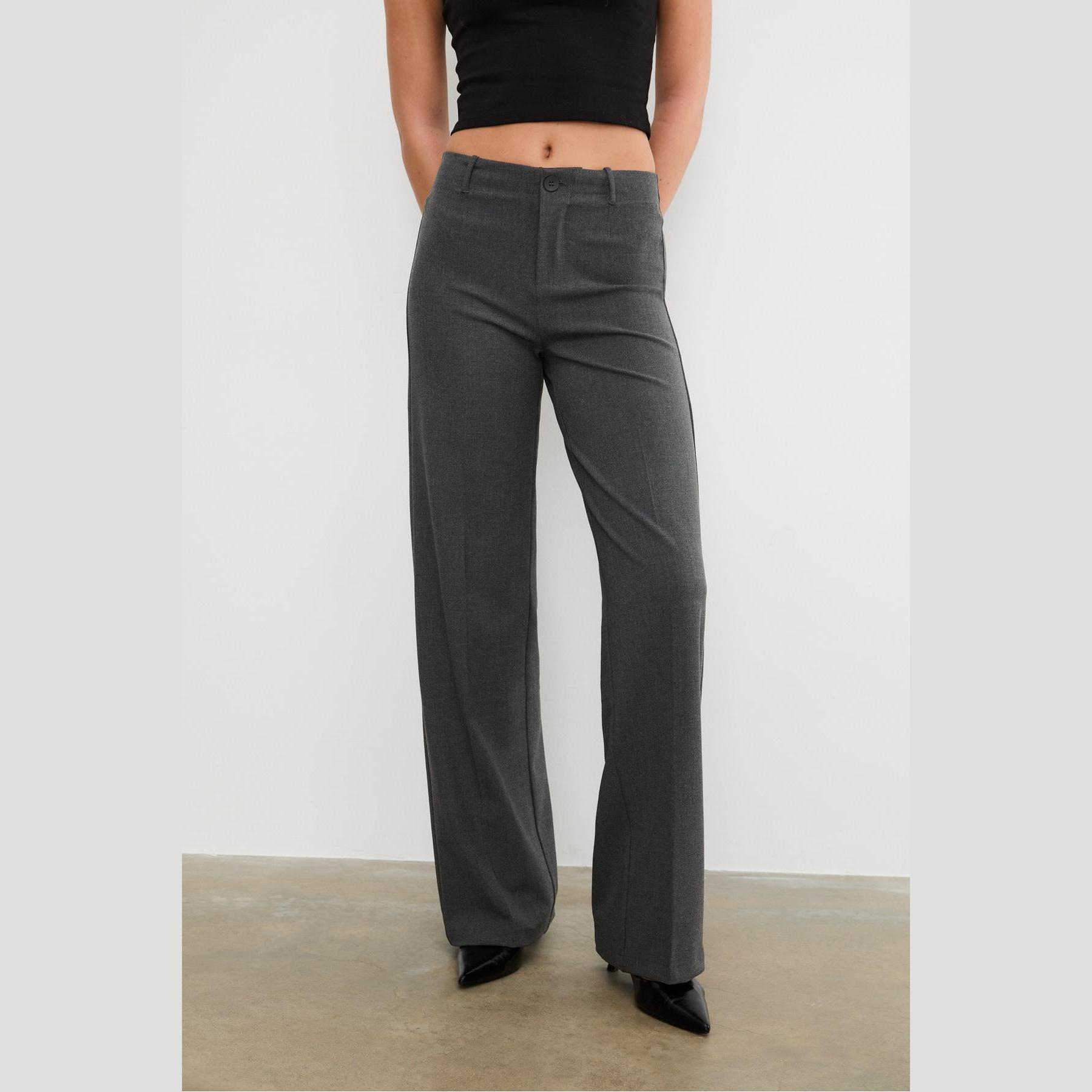 بنطال أنيق من Stradivarius بلون رمادي غامق، مصنوع من خامة مرنة بتركيبة 64% بوليستر، 32% فيسكوز، 4% إيلاستان، يتميز بقصة Straight Fit واسعة، خصر متوسط مع حلقات للحزام، إغلاق أمامي بسحاب وزر، أرجل طويلة بقصة واسعة، تصميم سادة بدون طبعات، مزود بجيبين جانبيين، جيوب خلفية وهمية، بدون بطانة، ملمس داخلي ناعم، مثالي للتنسيق مع قميص أو بلوزة لإطلالة مكتبية أو أنيقة.