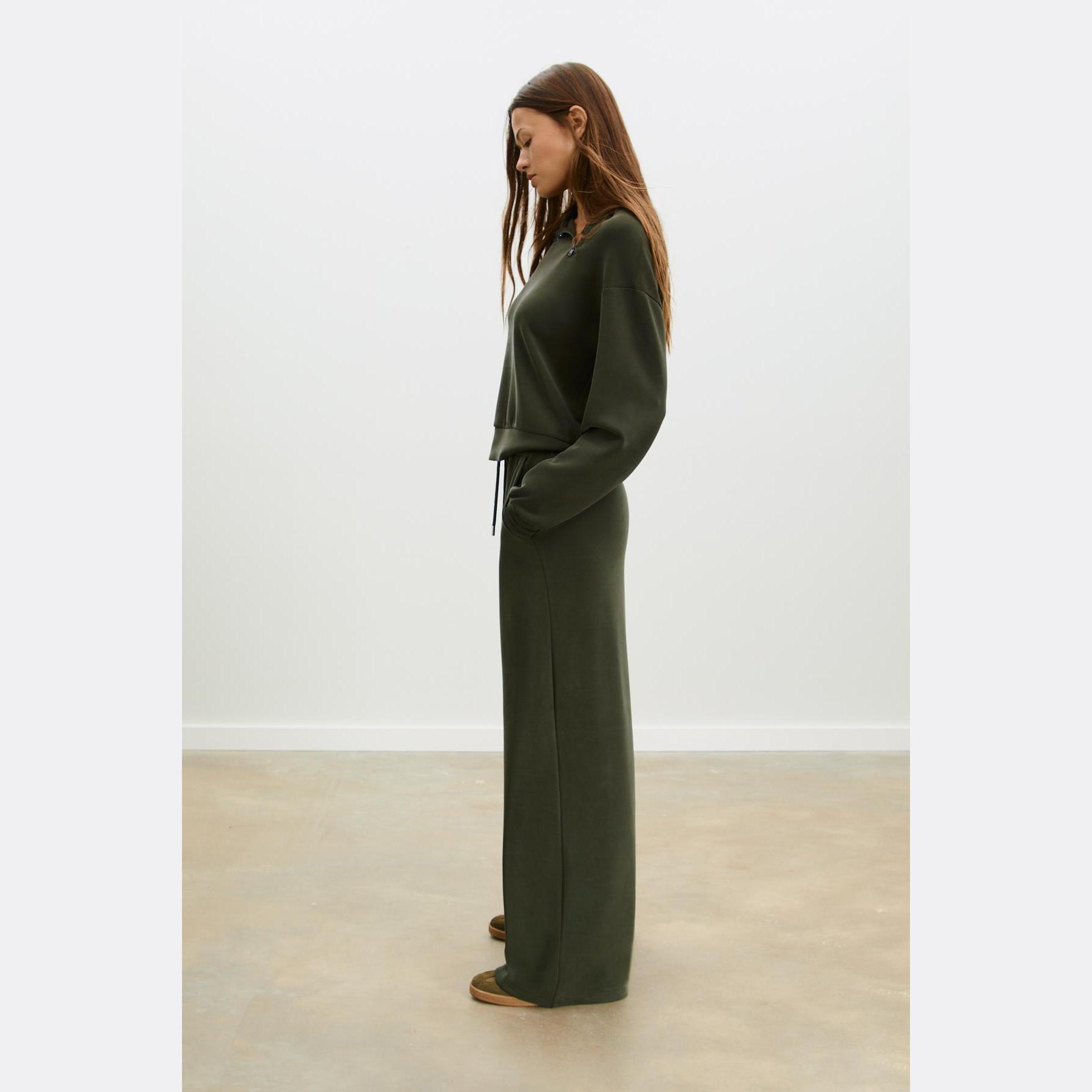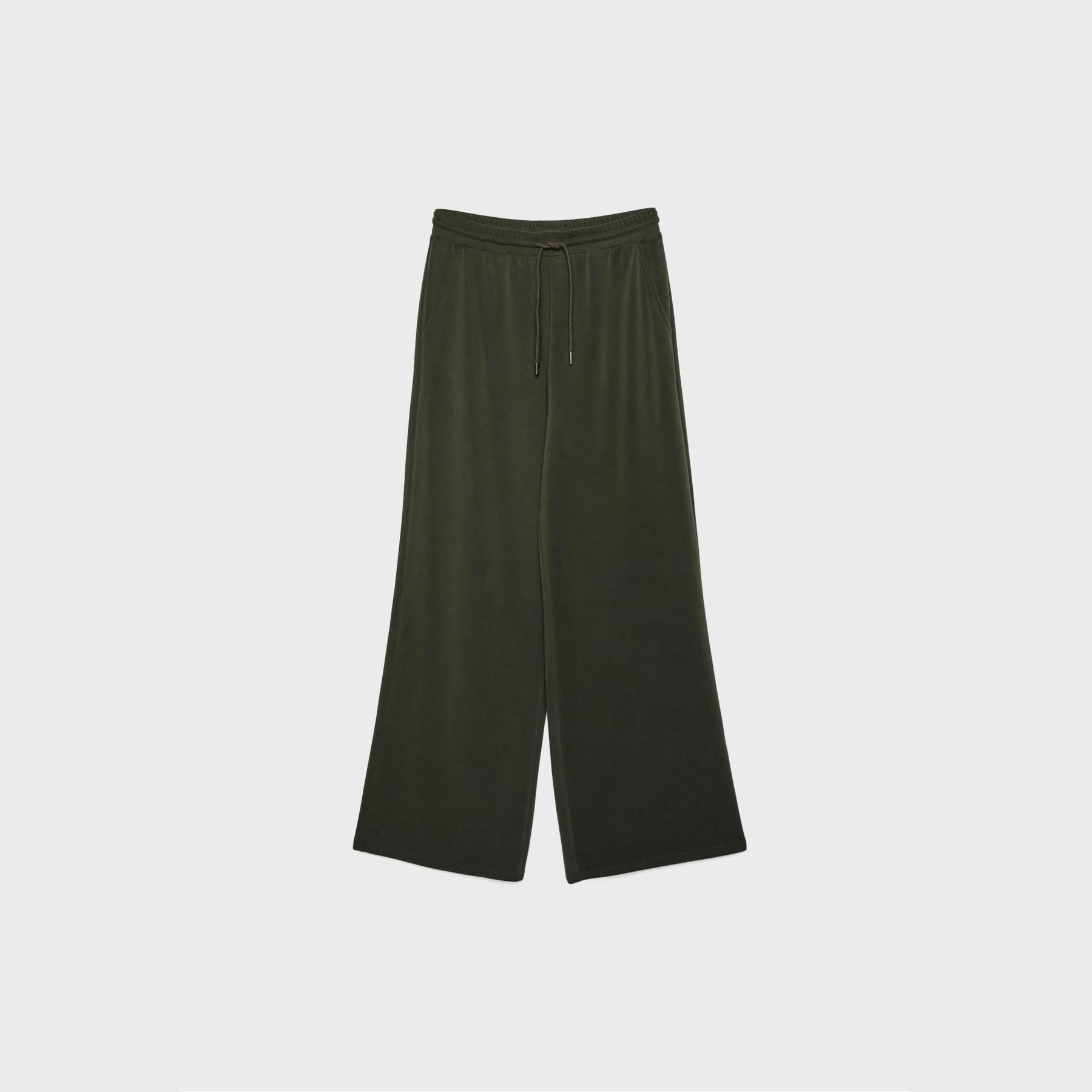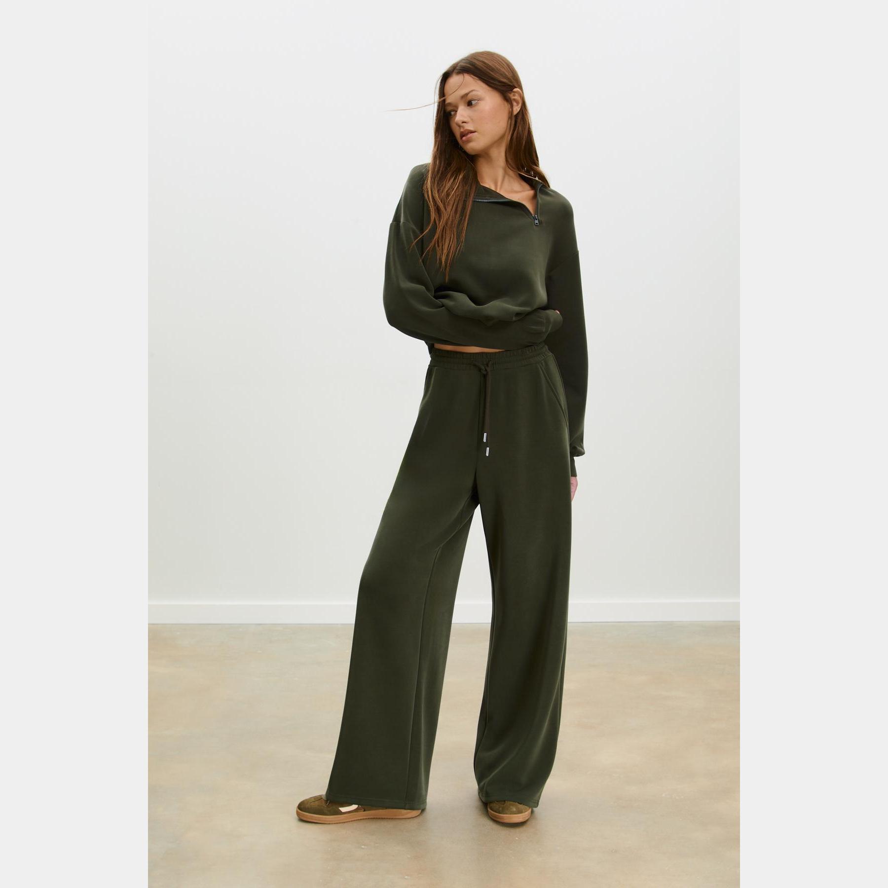بنطال عملي من Stradivarius بلون أخضر داكن، مصنوع من خامة ناعمة بتركيبة 49% مودال، 41% بوليستر، 10% إيلاستان، يتميز بقصة Palazzo واسعة، خصر متوسط بخصر مطاطي ورباط داخلي قابل للتعديل، أرجل طويلة وفضفاضة، تصميم سادة بدون طبعات، مزود بجيبين جانبيين، ملمس داخلي ناعم، بدون بطانة، مثالي للتنسيق مع كنزة محبوكة أو تيشيرت لإطلالة كاجوال ناعمة.