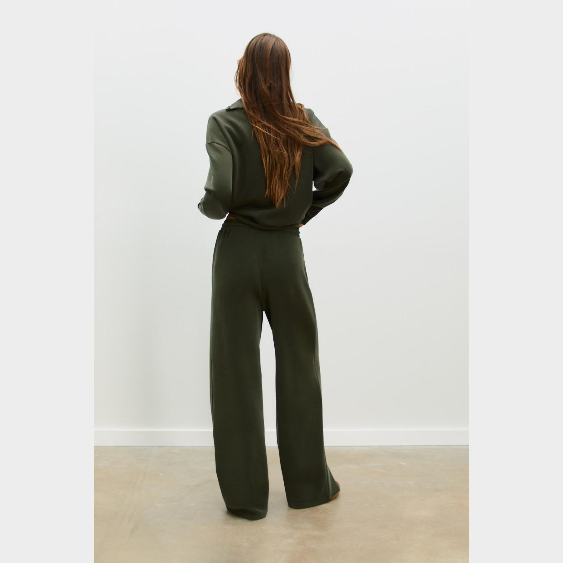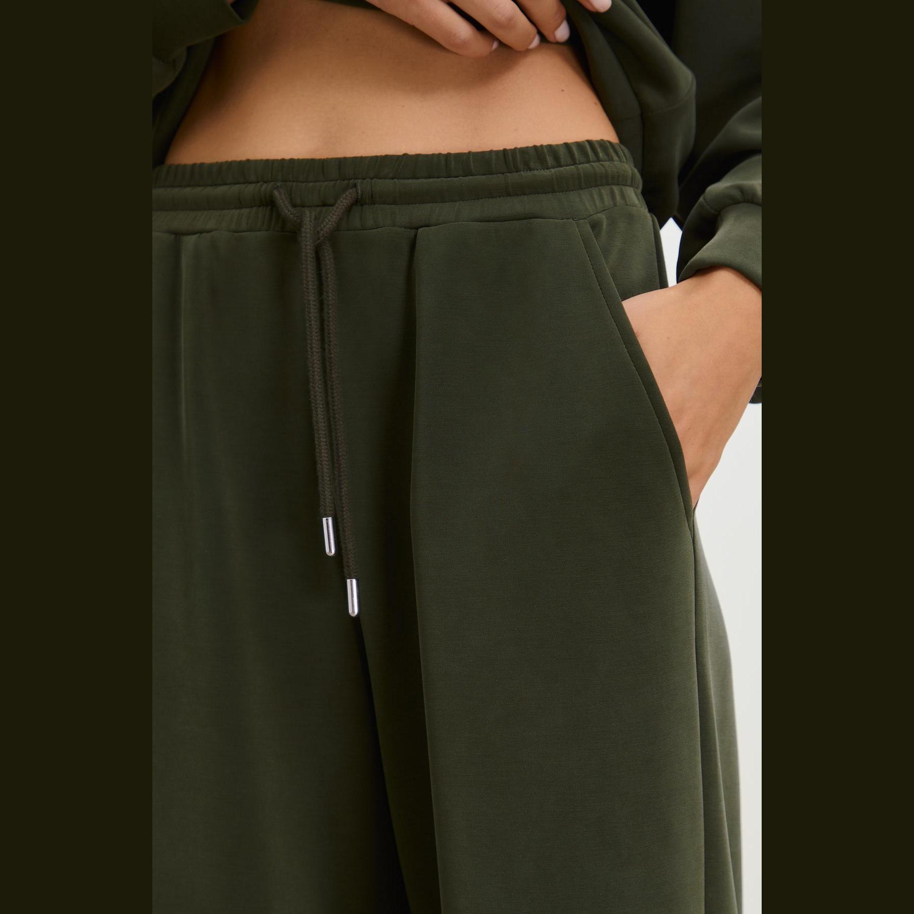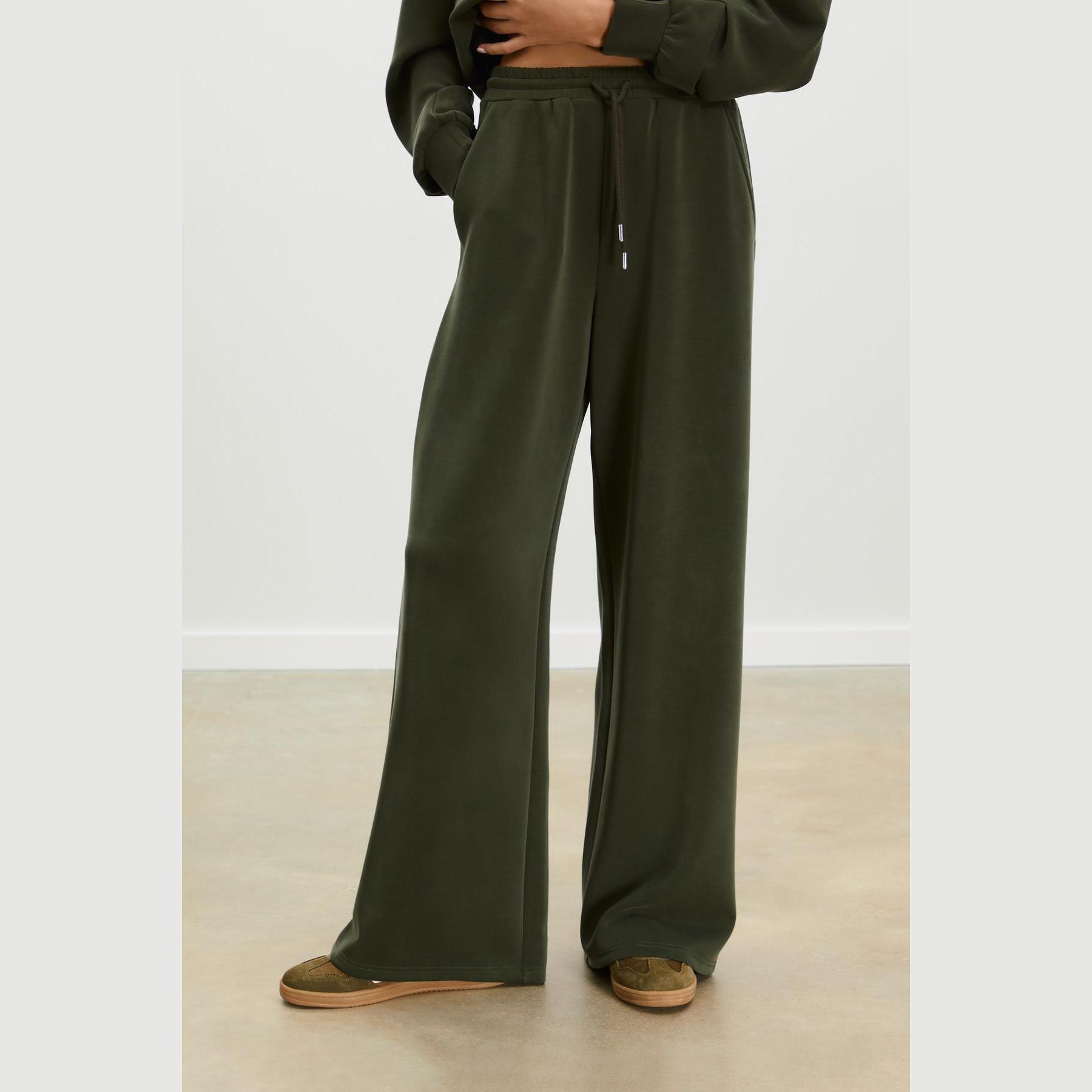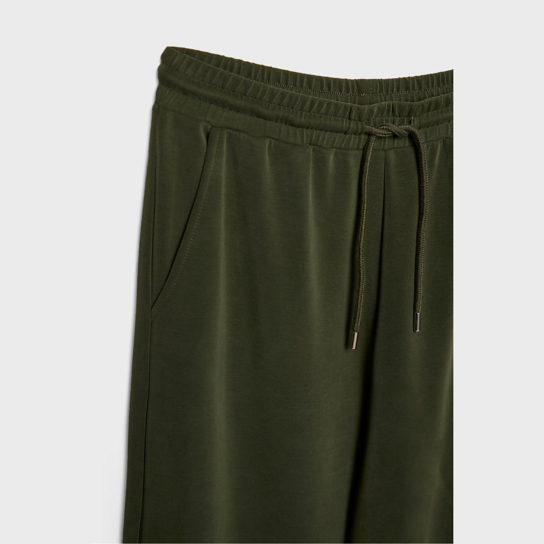 بنطال عملي من Stradivarius بلون أخضر داكن، مصنوع من خامة ناعمة بتركيبة 49% مودال، 41% بوليستر، 10% إيلاستان، يتميز بقصة Palazzo واسعة، خصر متوسط بخصر مطاطي ورباط داخلي قابل للتعديل، أرجل طويلة وفضفاضة، تصميم سادة بدون طبعات، مزود بجيبين جانبيين، ملمس داخلي ناعم، بدون بطانة، مثالي للتنسيق مع كنزة محبوكة أو تيشيرت لإطلالة كاجوال ناعمة.