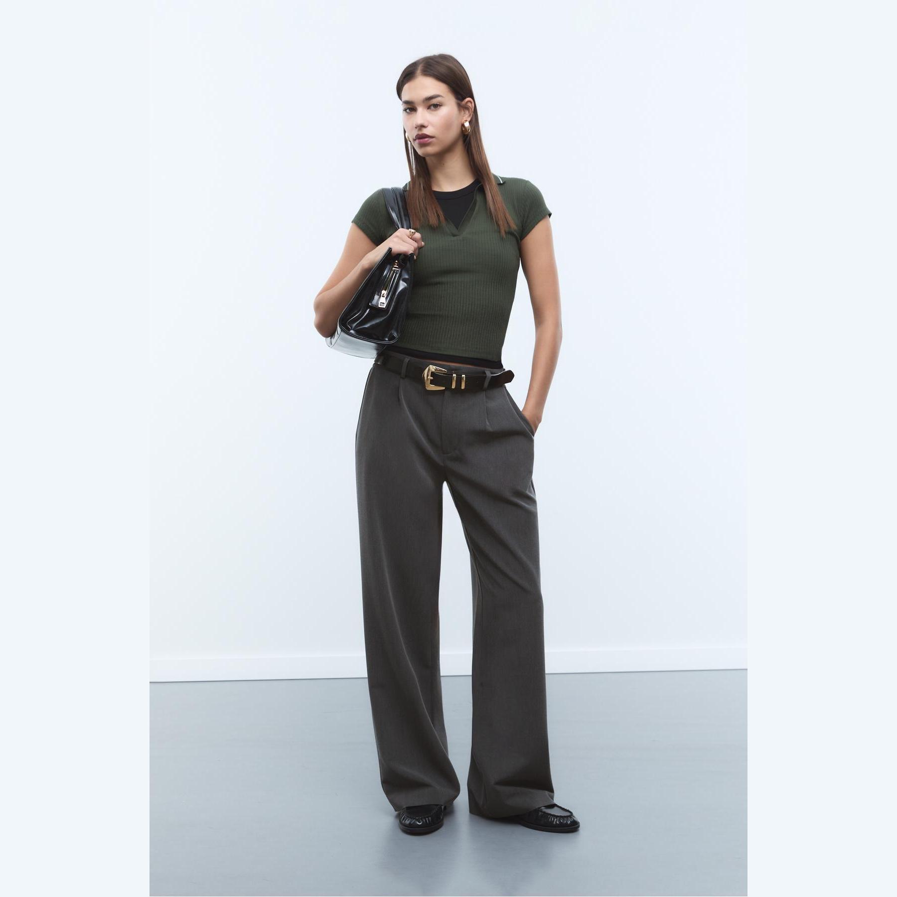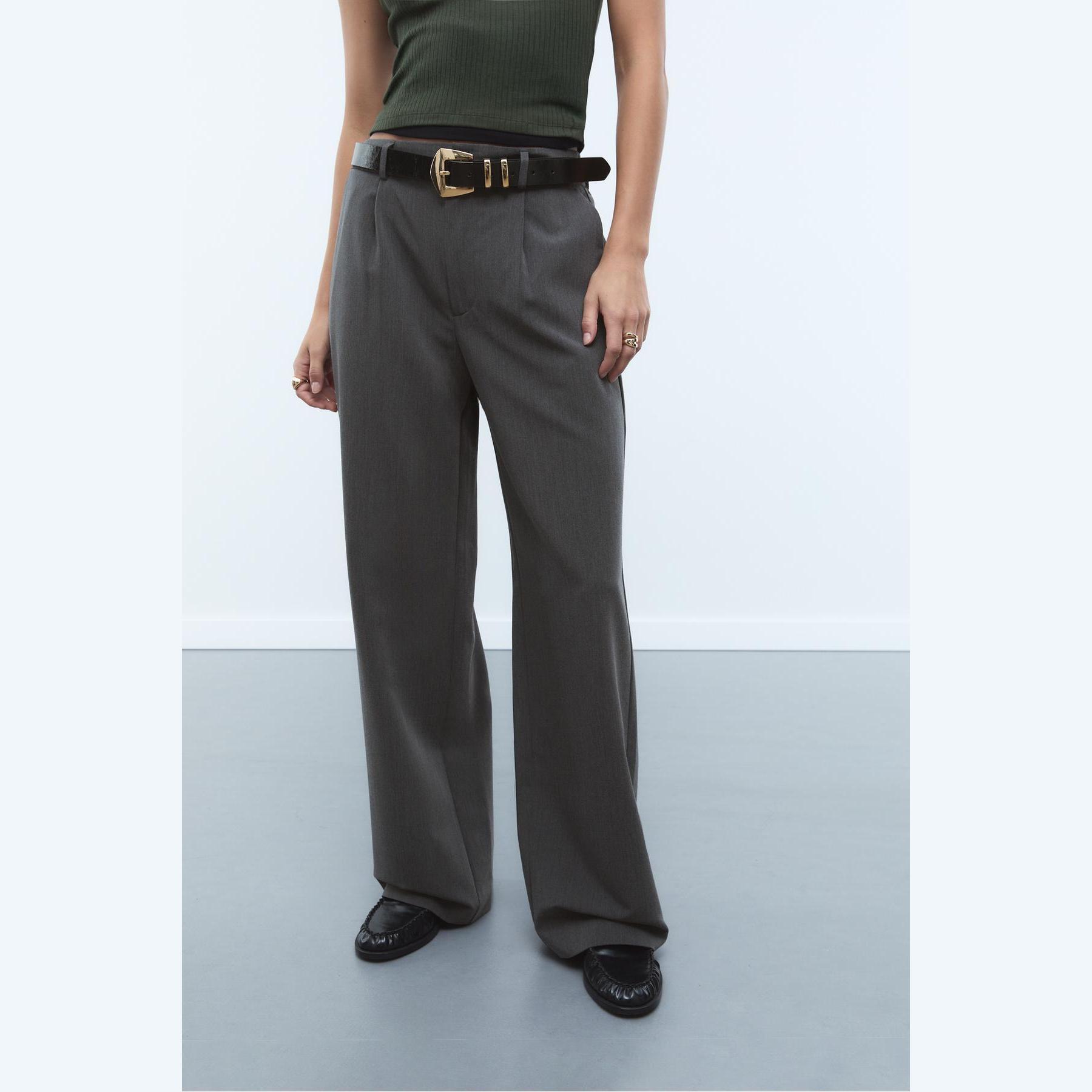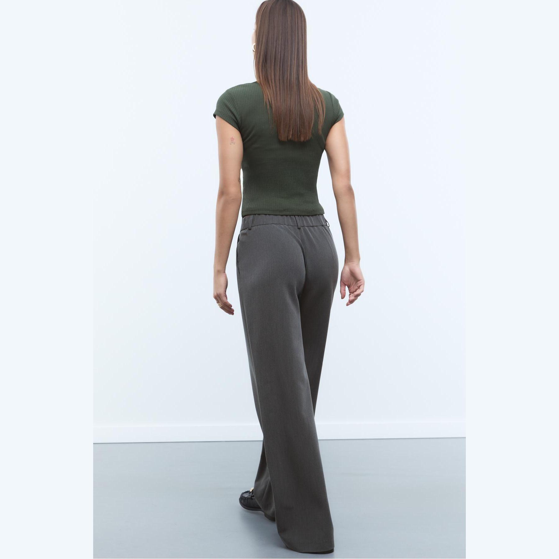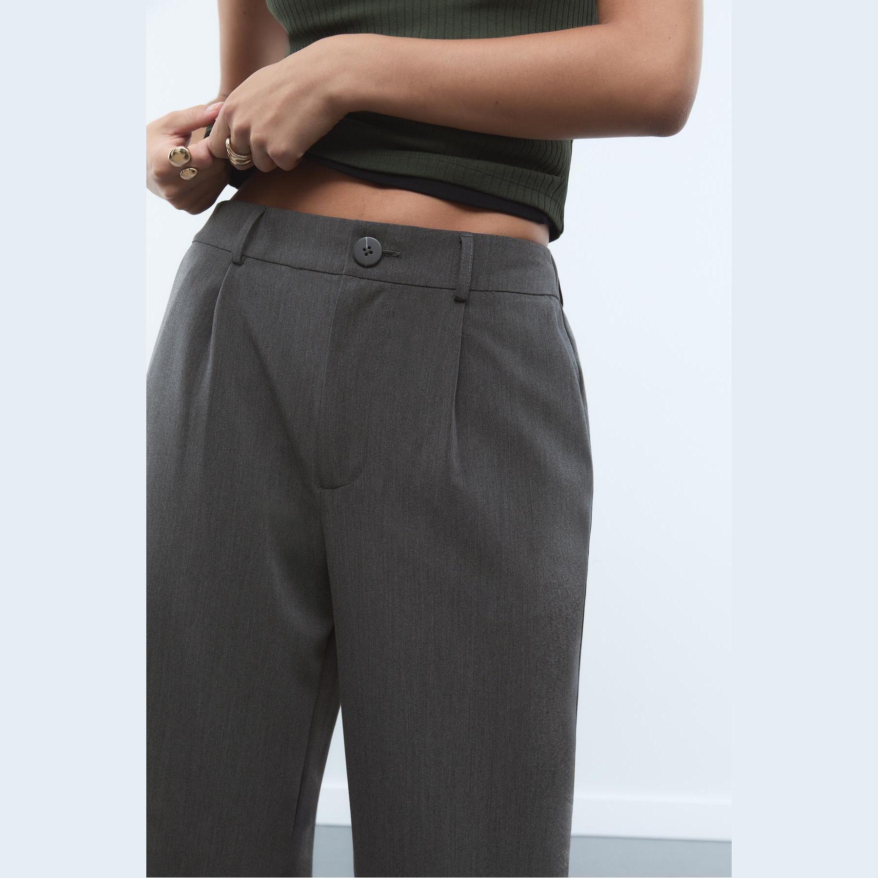 بنطال أنيق من Stradivarius بلون رمادي غامق، مصنوع من خامة مرنة بتركيبة 76% بوليستر، 18% فيسكوز، 6% إيلاستان، يتميز بقصة مستقيمة، خصر متوسط مع حلقات للحزام وخصر خلفي مطاطي، إغلاق أمامي بسحاب وزر، أرجل طويلة بقصة مستقيمة، تصميم سادة بدون طبعات، مزود بجيبين جانبيين، تفاصيل بنس أمامية، بدون بطانة، ملمس داخلي ناعم، مثالي للتنسيق مع قميص أو بلوزة لإطلالة مكتبية أو أنيقة.