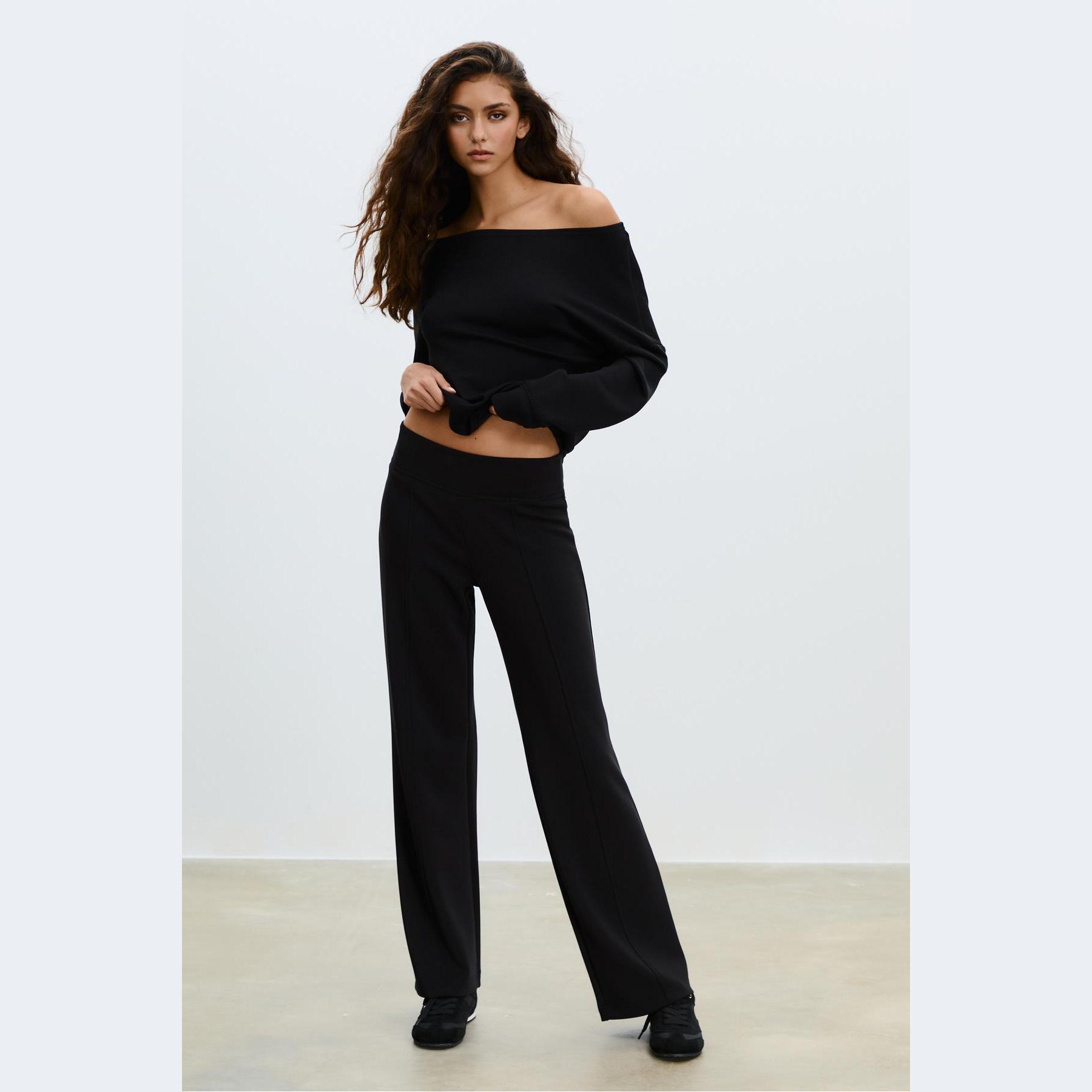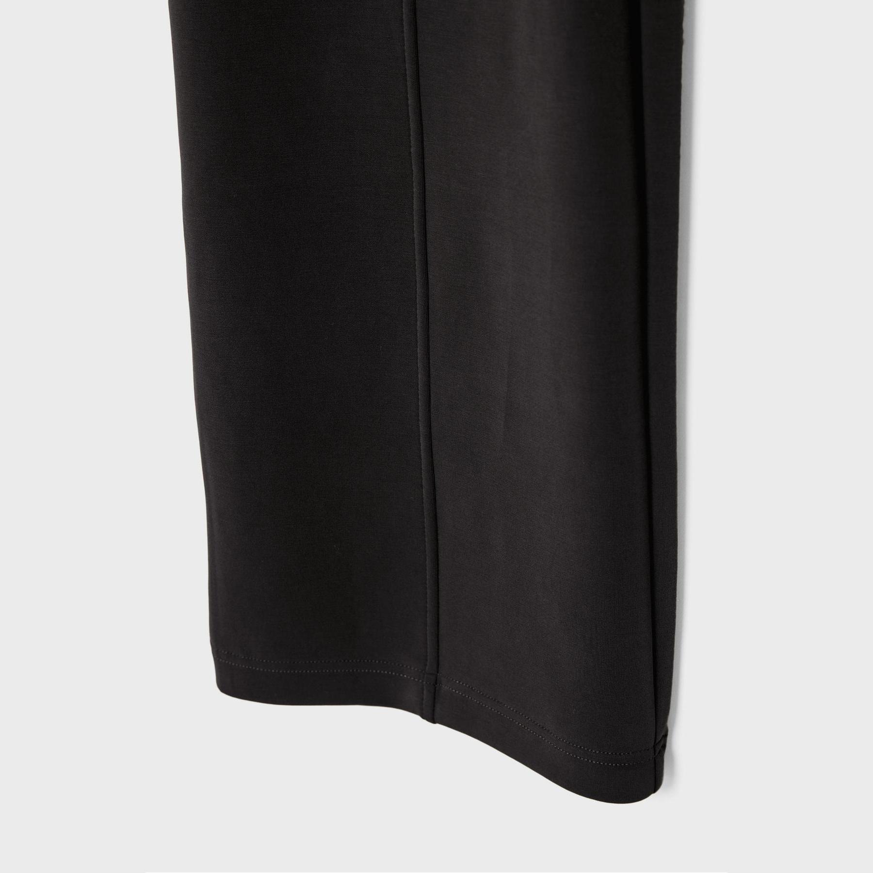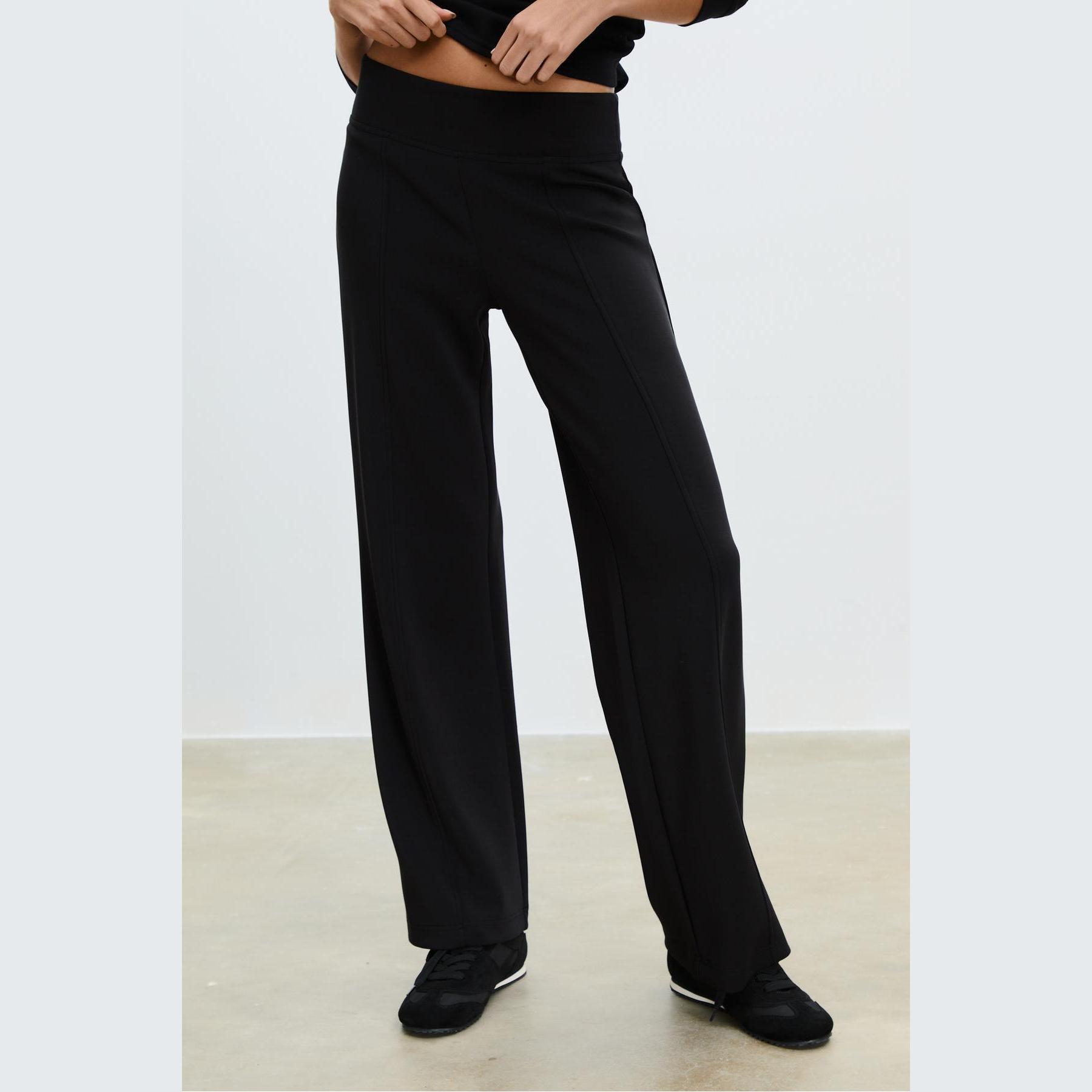 بنطال عملي من Stradivarius بلون أسود، مصنوع من خامة ناعمة بتركيبة 49% مودال، 41% بوليستر، 10% إيلاستان، يتميز بقصة مستقيمة، خصر متوسط بخصر مطاطي ورباط داخلي قابل للتعديل، أرجل مستقيمة بدون أساور، تصميم سادة مع تفاصيل نيرفور أمامية تضيف لمسة تصميمية، مزود بجيبين جانبيين، ملمس داخلي ناعم، بدون بطانة، مثالي للتنسيق مع تيشيرت أو كنزة لإطلالة كاجوال ناعمة.