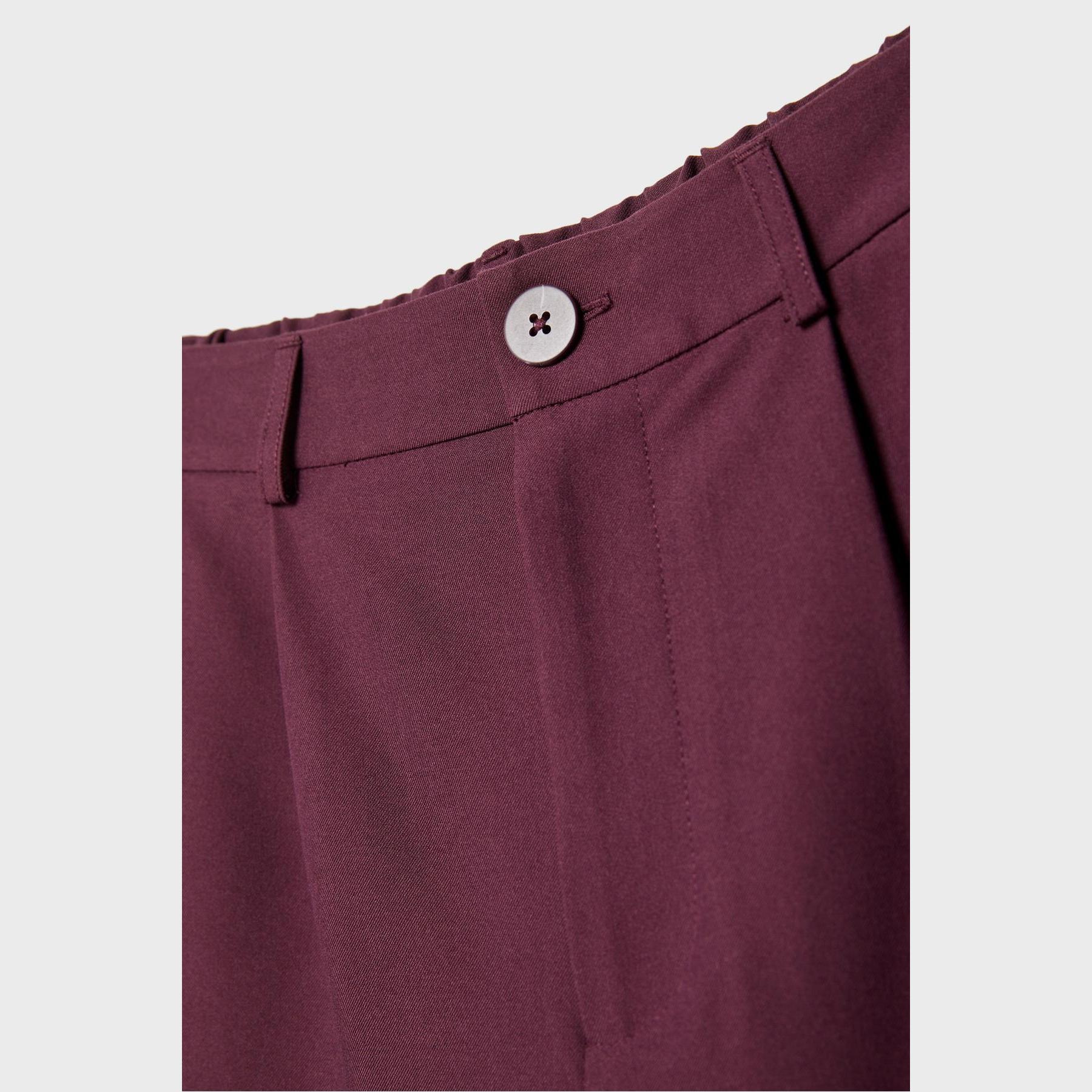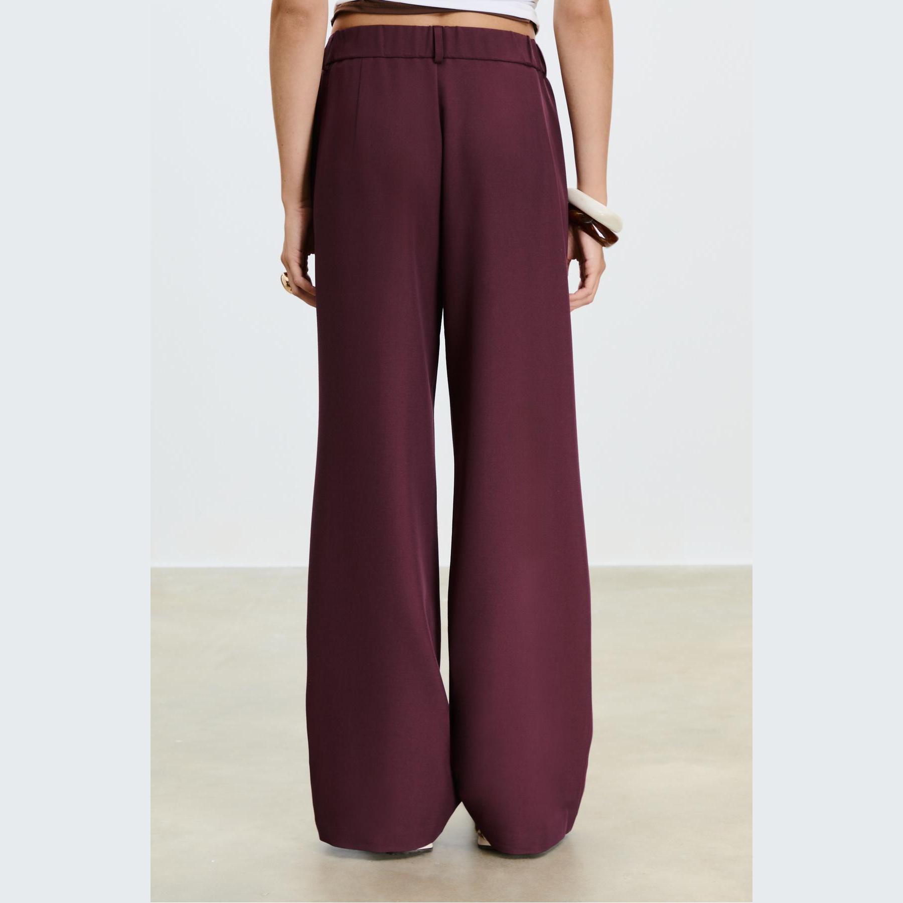بنطال أنيق من Stradivarius بلون بنفسجي، مصنوع من خامة مرنة بتركيبة 80% بوليستر، 16% فيسكوز، 4% إيلاستان، يتميز بقصة مستقيمة، خصر متوسط مع حلقات للحزام وخصر خلفي مطاطي، إغلاق أمامي بسحاب وزر، أرجل طويلة بقصة مستقيمة، تصميم سادة بدون طبعات، مزود بجيبين جانبيين، تفاصيل بنس أمامية، بدون بطانة، ملمس داخلي ناعم، مثالي للتنسيق مع قميص أو بلوزة لإطلالة مكتبية أو أنيقة.