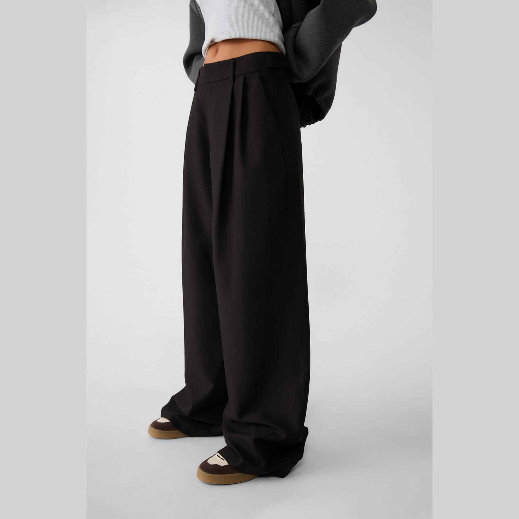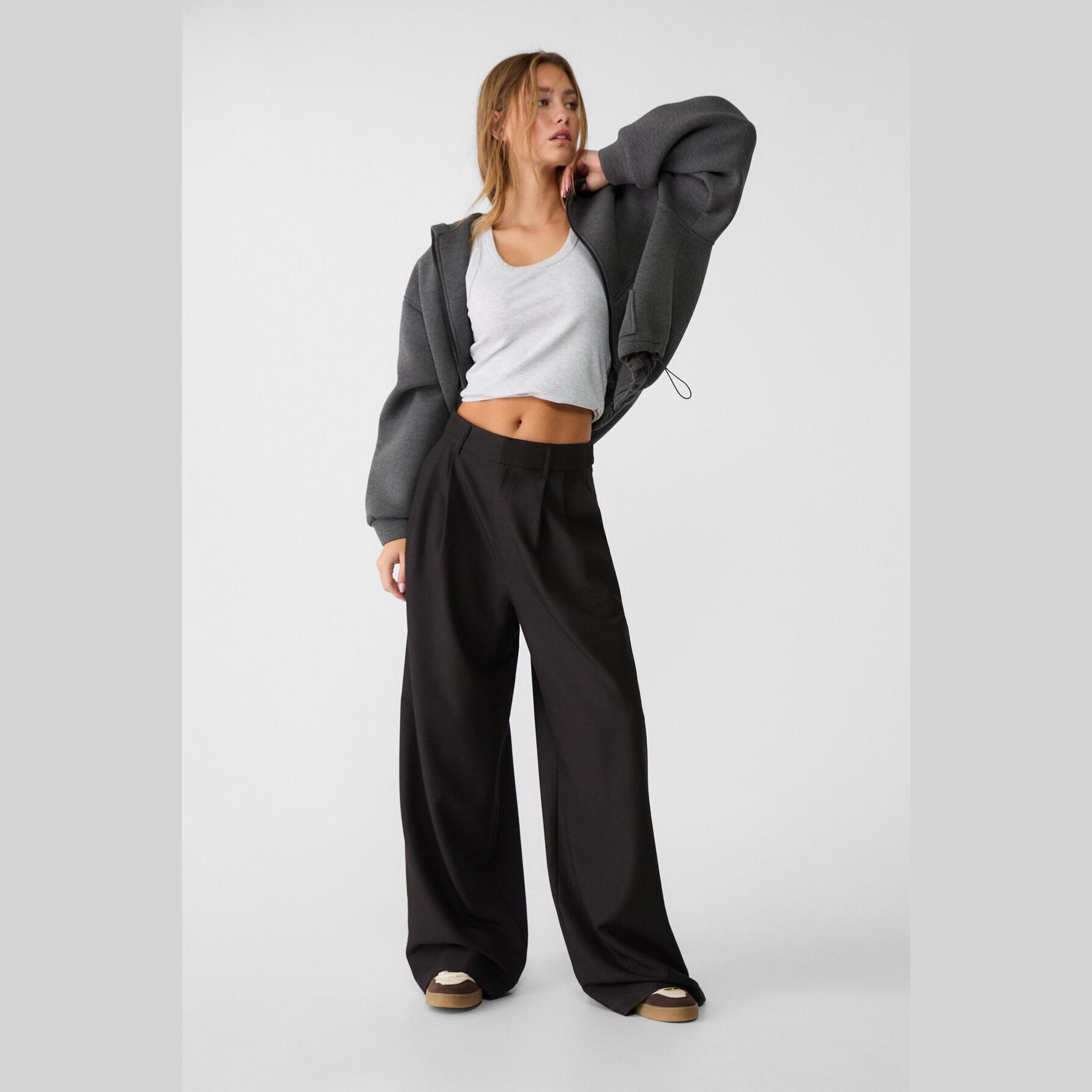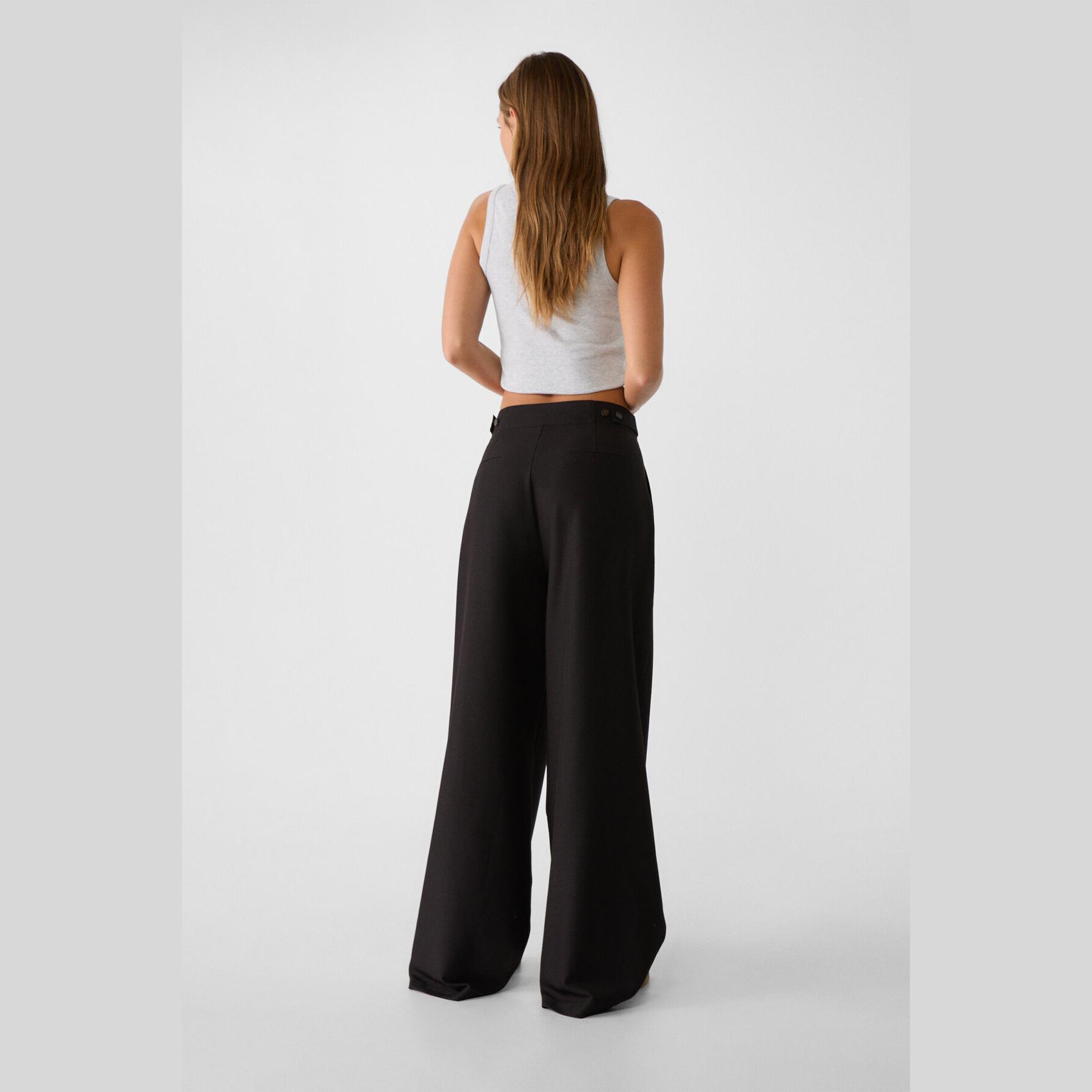 بنطال عملي من Stradivarius بلون أسود، مصنوع من خامة ناعمة بتركيبة 100% بوليستر، يتميز بقصة Oversize واسعة جدًا، خصر متوسط مع خصر مطاطي، أرجل طويلة وفضفاضة بقصة Extra Wide Leg، تصميم سادة بدون طبعات، مزود بجيبين جانبيين، بدون بطانة، ملمس داخلي ناعم، مثالي للتنسيق مع تيشيرت أو توب قصير لإطلالة كاجوال عصرية.