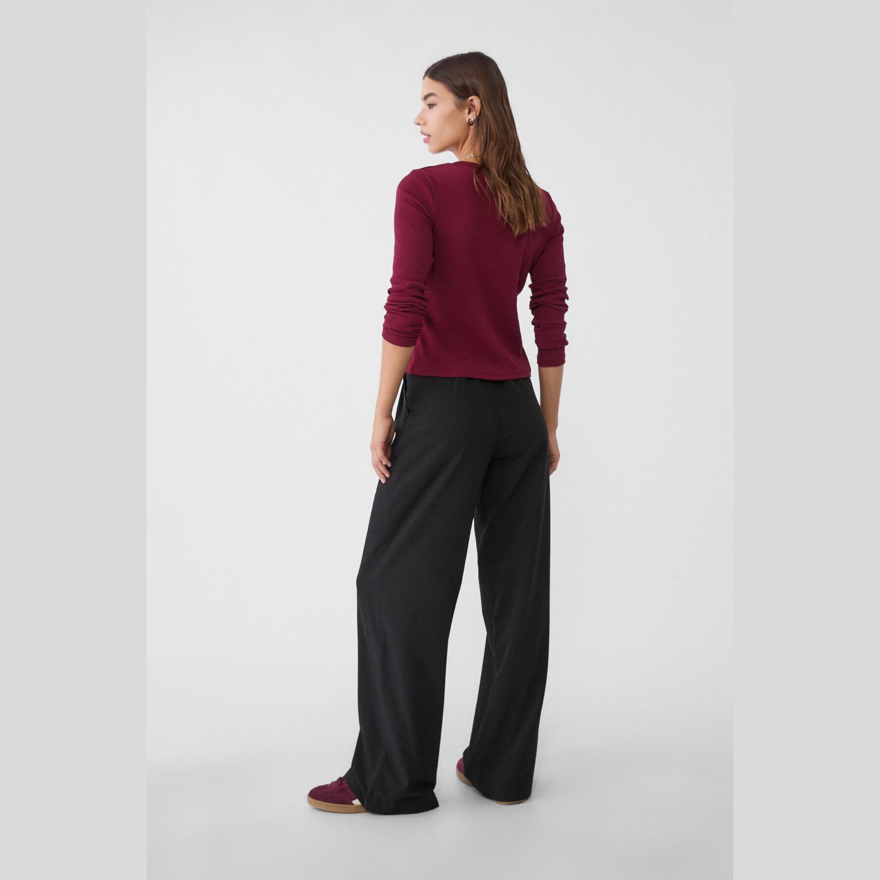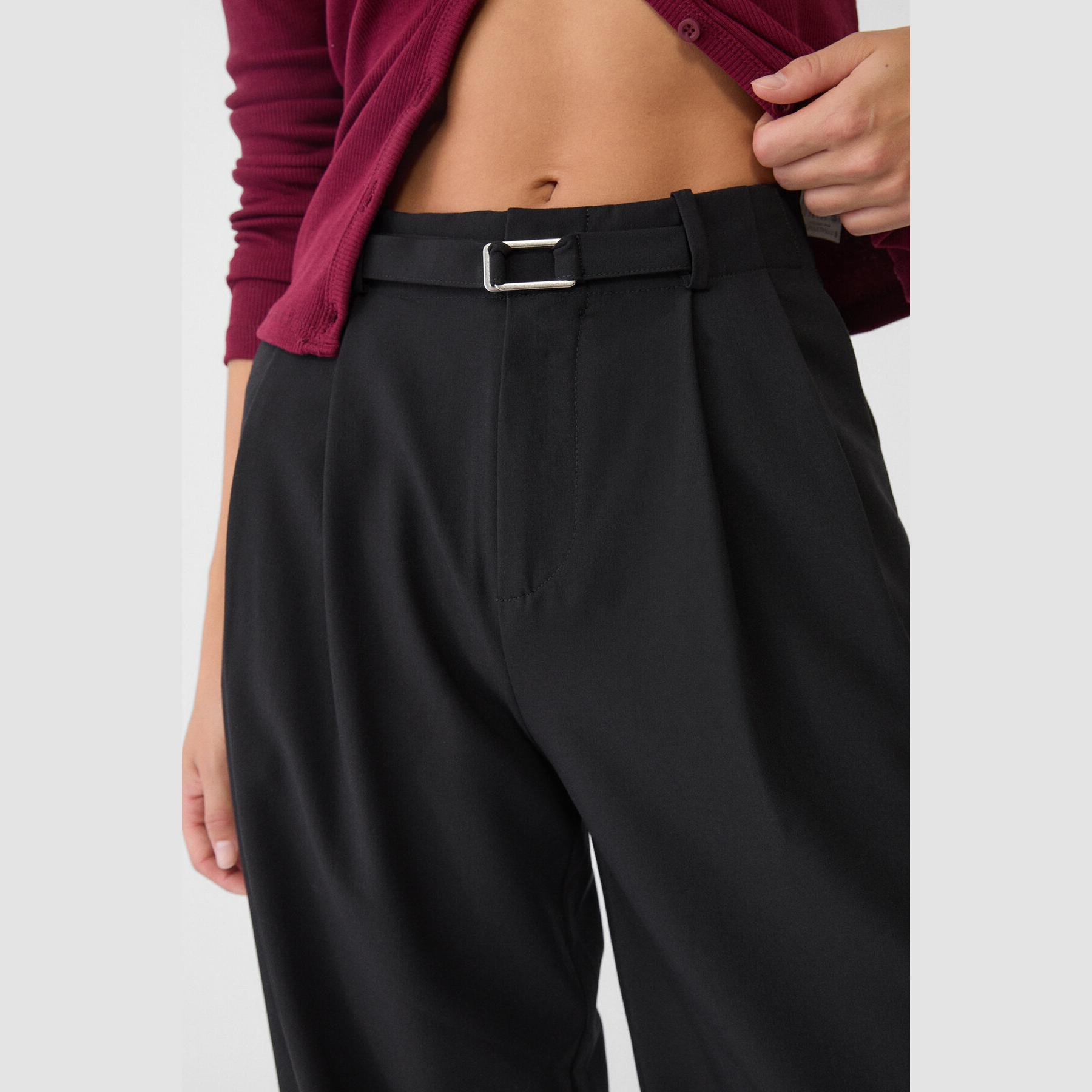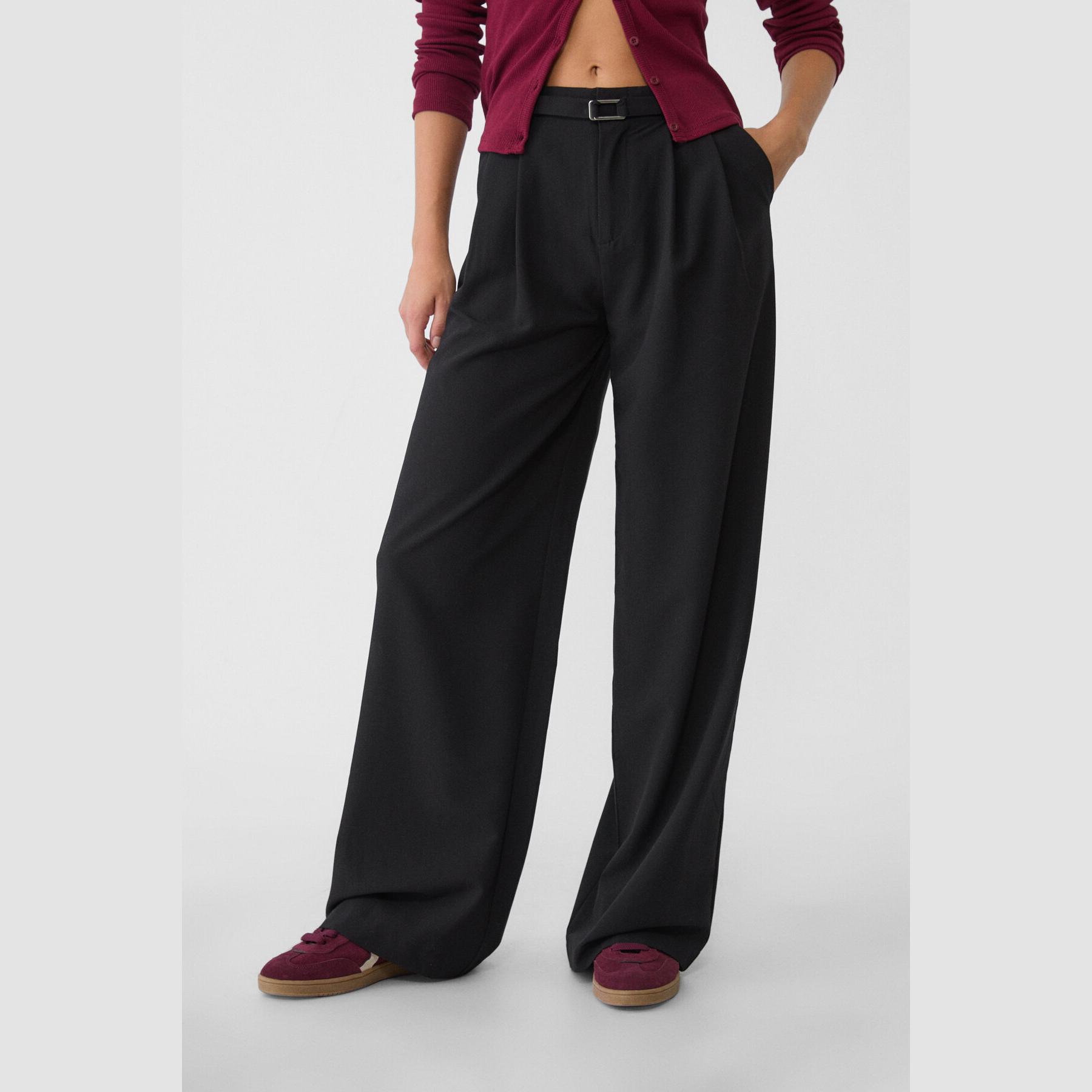 بنطال أنيق من Stradivarius بلون أسود، مصنوع من خامة مرنة بتركيبة 72% بوليستر، 22% فيسكوز، 6% إيلاستان، يتميز بقصة واسعة، خصر مرتفع مع شريط أمامي مزود بإبزيم معدني قابل للتعديل، خصر خلفي مطاطي، إغلاق أمامي بسحاب، زر، دبوس داخلي وكبسة معدنية، مزود بجيبين جانبيين، تصميم سادة مع بنس أمامية، بدون بطانة، ملمس داخلي ناعم، مثالي للتنسيق مع قميص أو بلوزة لإطلالة مكتبية أو كاجوال أنيقة.