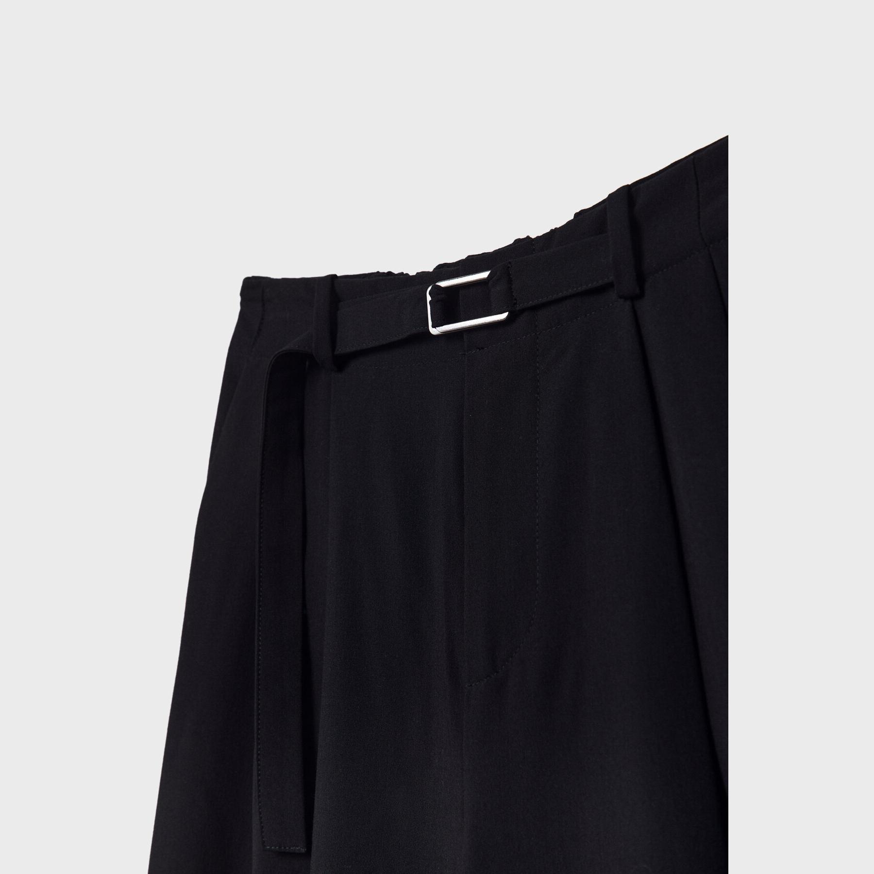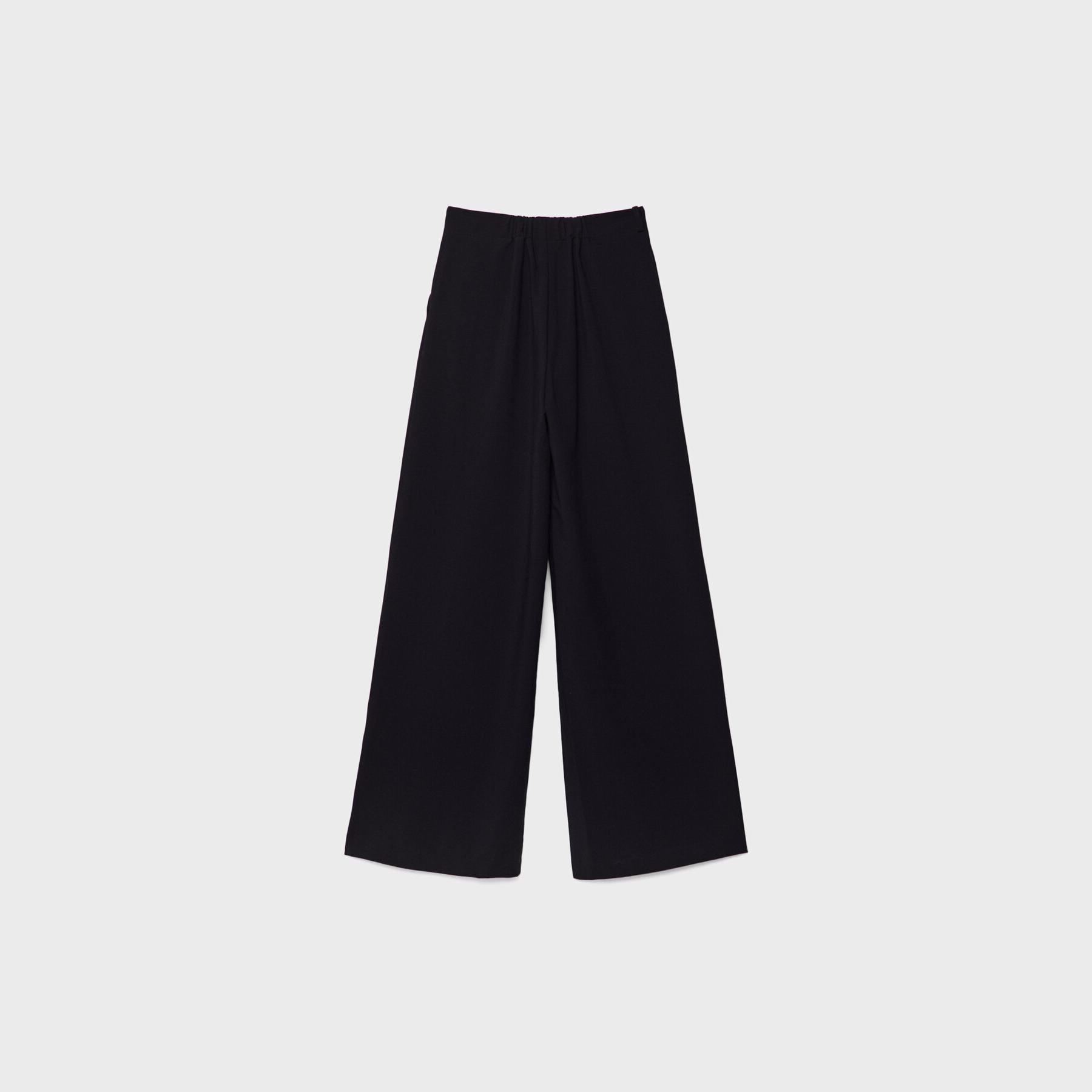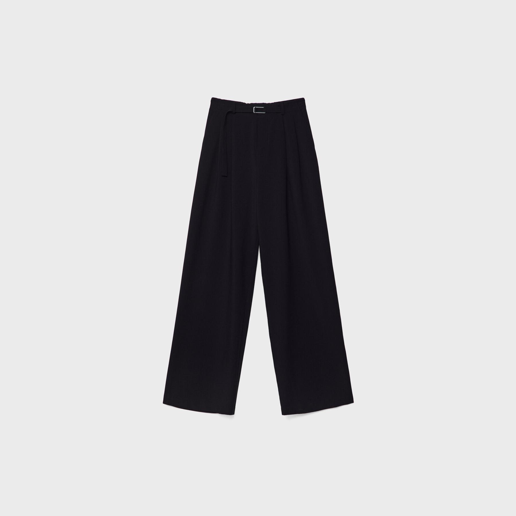بنطال أنيق من Stradivarius بلون أسود، مصنوع من خامة مرنة بتركيبة 72% بوليستر، 22% فيسكوز، 6% إيلاستان، يتميز بقصة واسعة، خصر مرتفع مع شريط أمامي مزود بإبزيم معدني قابل للتعديل، خصر خلفي مطاطي، إغلاق أمامي بسحاب، زر، دبوس داخلي وكبسة معدنية، مزود بجيبين جانبيين، تصميم سادة مع بنس أمامية، بدون بطانة، ملمس داخلي ناعم، مثالي للتنسيق مع قميص أو بلوزة لإطلالة مكتبية أو كاجوال أنيقة.