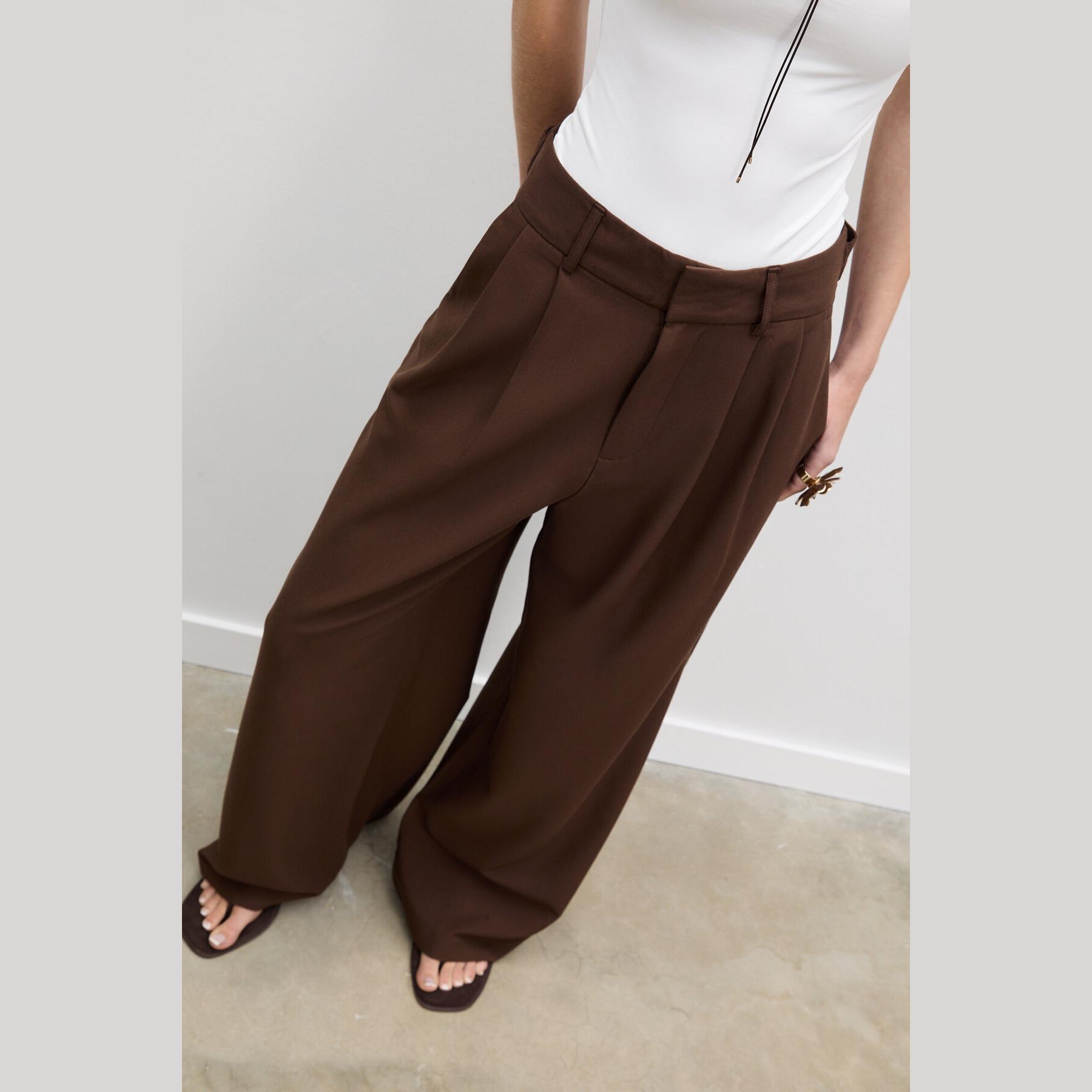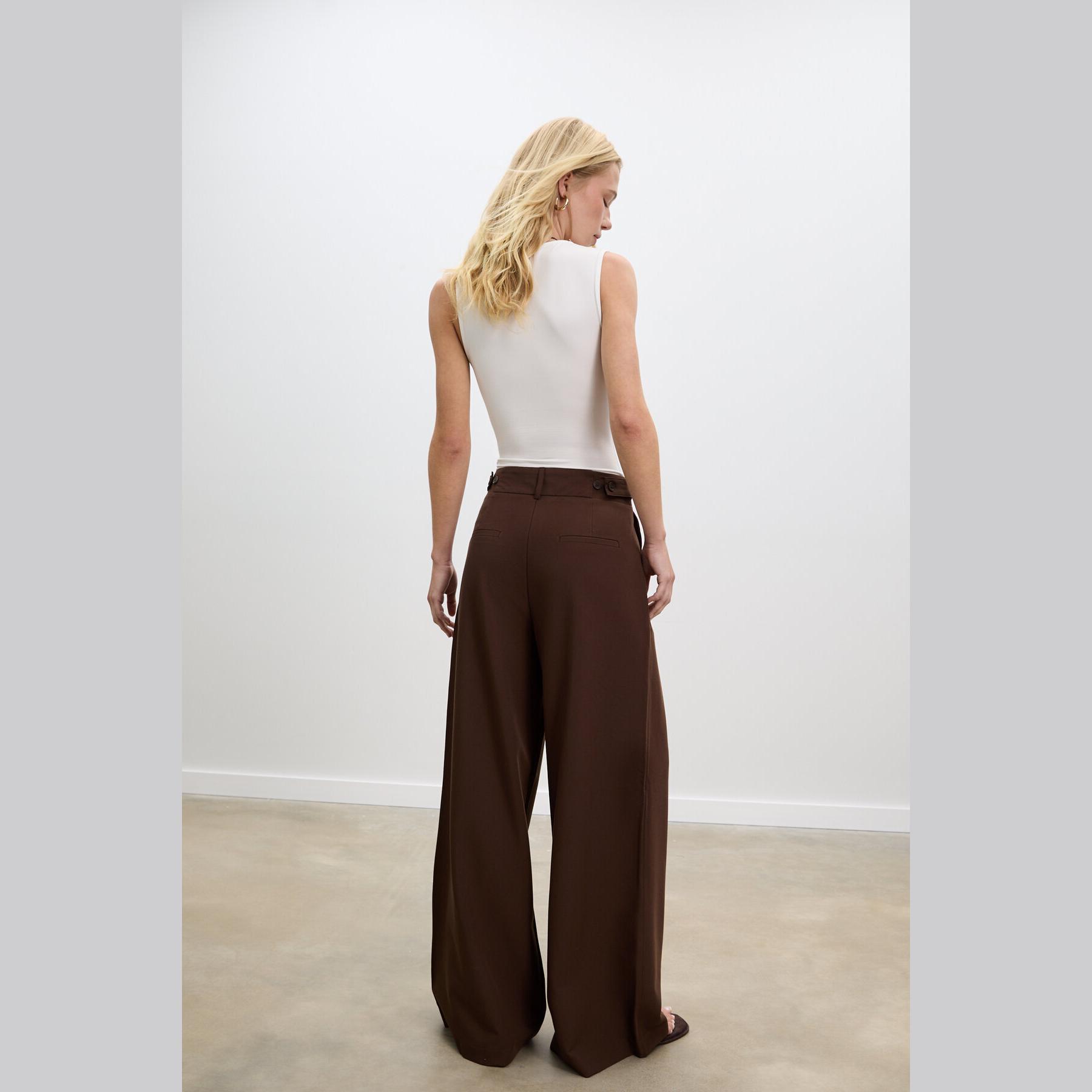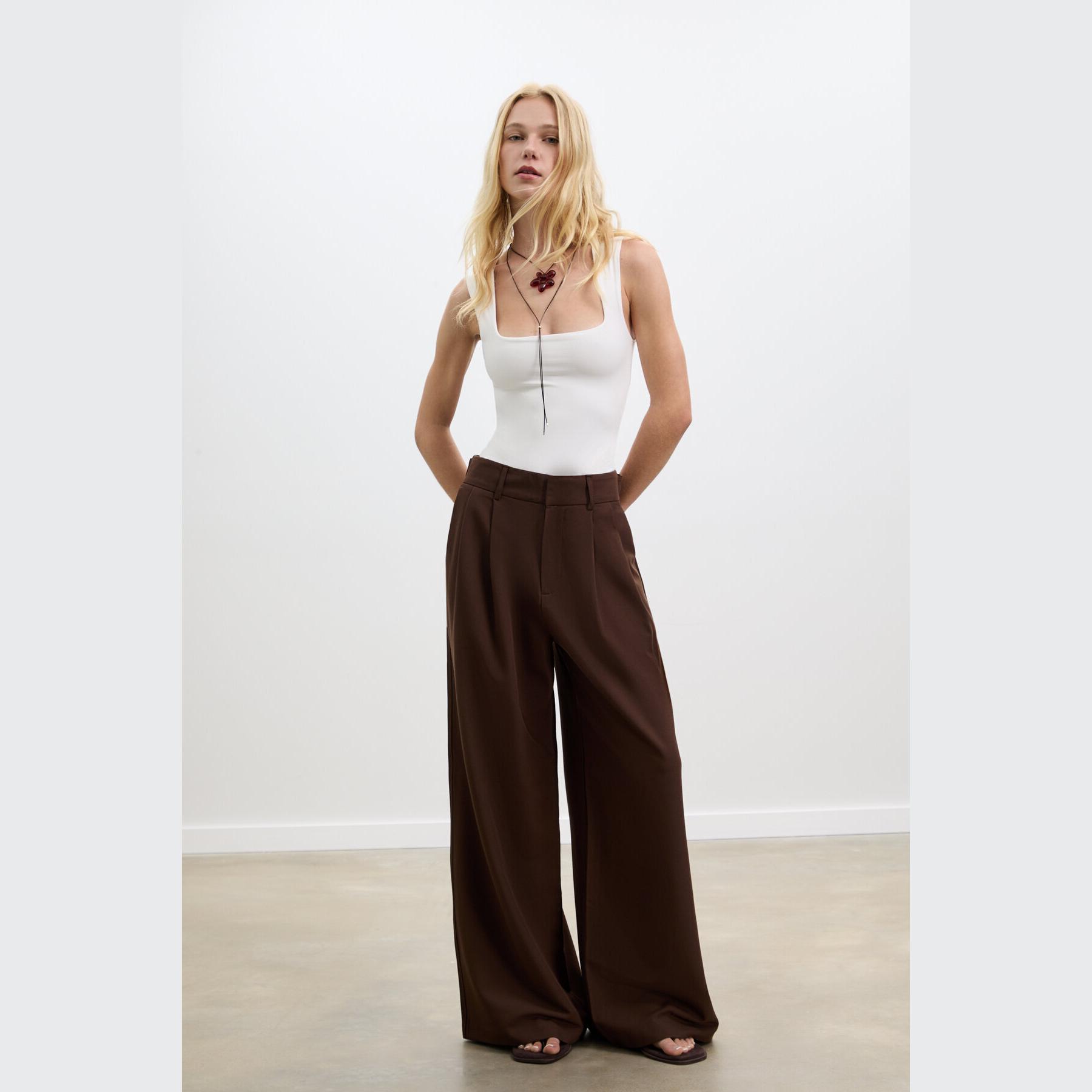 بنطال أنيق من Stradivarius بلون بني، مصنوع من خامة مرنة بتركيبة 78% بوليستر، 16% فيسكوز، 6% إيلاستان، يتميز بقصة Culotte واسعة جدًا، خصر مرتفع مزود بحلقات للحزام وتفاصيل أزرار قابلة للتعديل، إغلاق أمامي بسحاب، زر، دبوس داخلي وكبسة معدنية، مزود بجيبين جانبيين وجيوب خلفية بفتحة بيّلية، تصميم سادة مع بنس أمامية، بدون بطانة، ملمس داخلي ناعم، مثالي للتنسيق مع قميص أو بلوزة لإطلالة مكتبية أو كاجوال أنيقة.