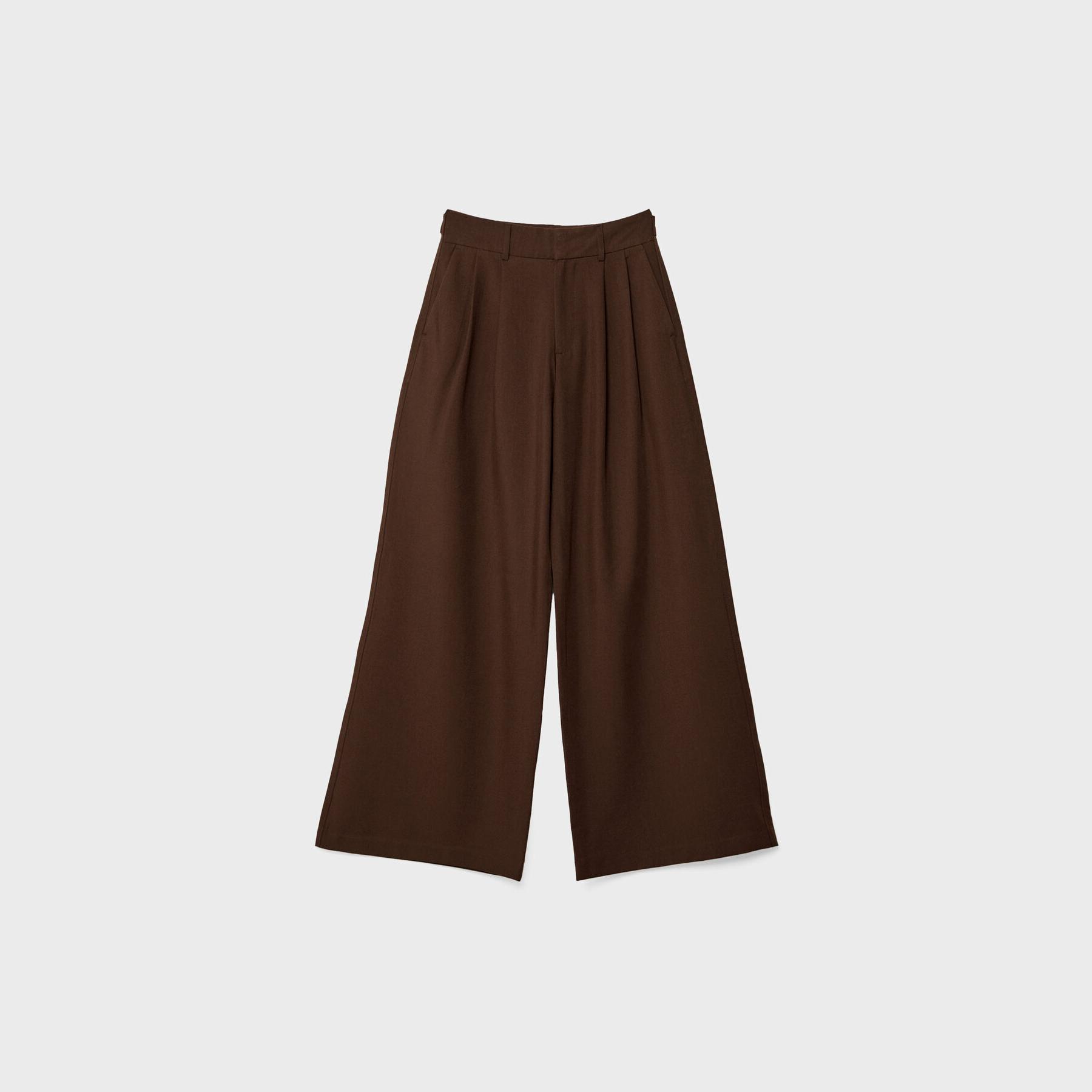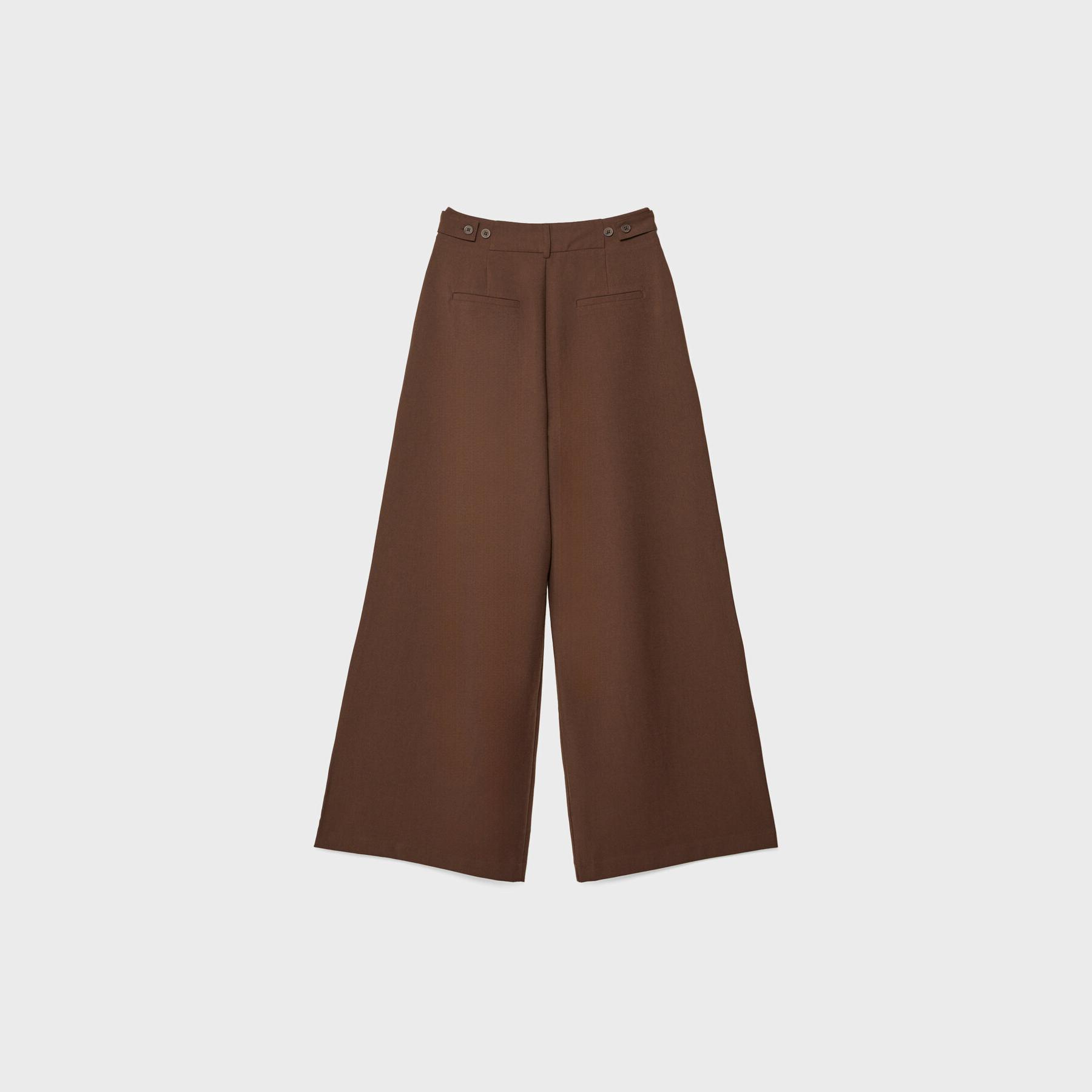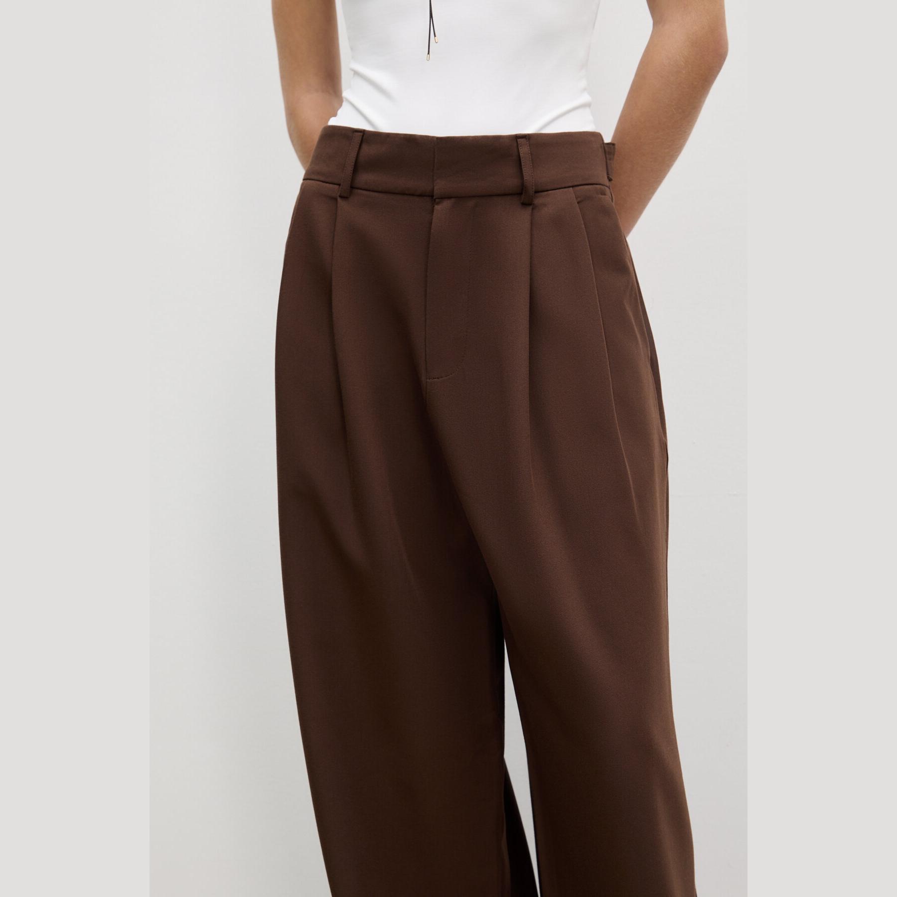بنطال أنيق من Stradivarius بلون بني، مصنوع من خامة مرنة بتركيبة 78% بوليستر، 16% فيسكوز، 6% إيلاستان، يتميز بقصة Culotte واسعة جدًا، خصر مرتفع مزود بحلقات للحزام وتفاصيل أزرار قابلة للتعديل، إغلاق أمامي بسحاب، زر، دبوس داخلي وكبسة معدنية، مزود بجيبين جانبيين وجيوب خلفية بفتحة بيّلية، تصميم سادة مع بنس أمامية، بدون بطانة، ملمس داخلي ناعم، مثالي للتنسيق مع قميص أو بلوزة لإطلالة مكتبية أو كاجوال أنيقة.