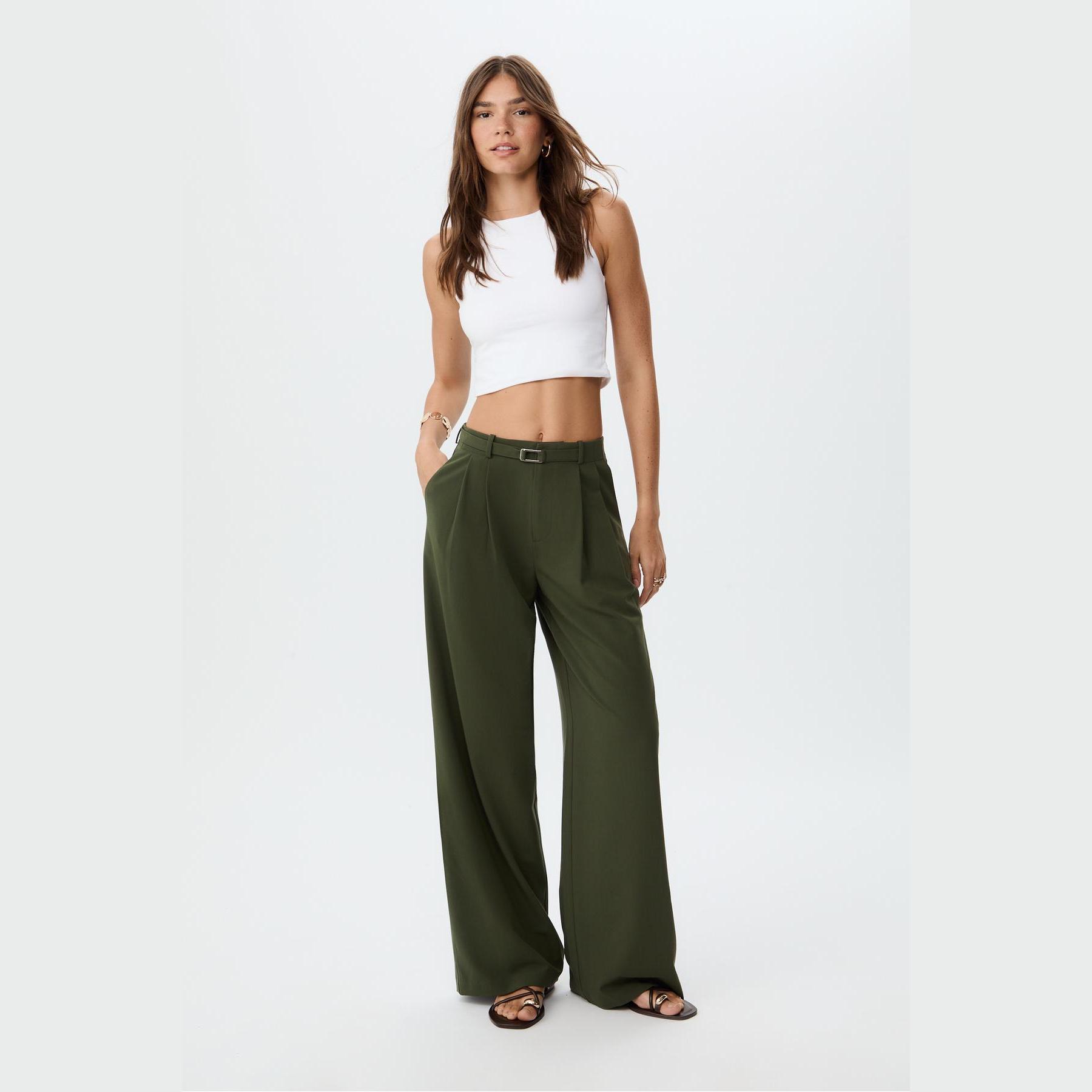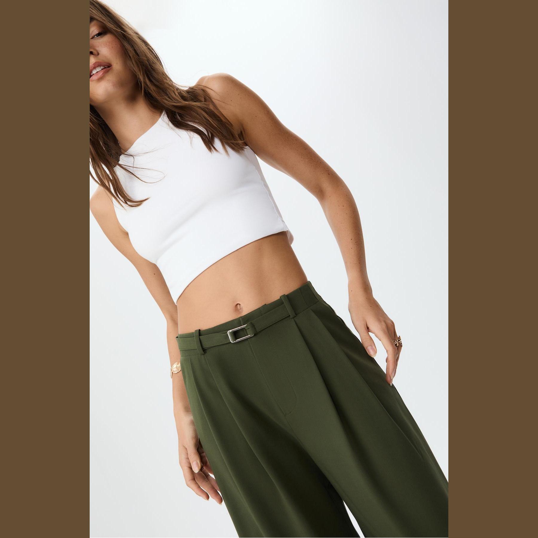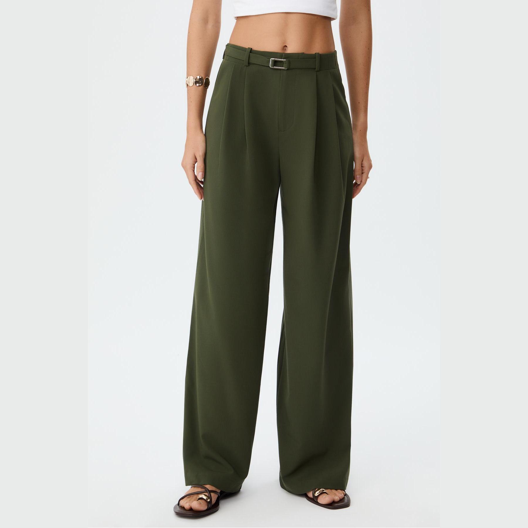 بنطال أنيق من Stradivarius بلون أخضر داكن، مصنوع من خامة مرنة بتركيبة 72% بوليستر، 22% فيسكوز، 6% إيلاستان، يتميز بقصة واسعة، خصر مرتفع مع خصر خلفي مطاطي وتفاصيل إبزيم معدني أمامي قابل للتعديل، إغلاق أمامي بسحاب، زر، دبوس داخلي وكبسة معدنية، مزود بجيبين جانبيين، تصميم سادة مع بنس أمامية، بدون بطانة، ملمس داخلي ناعم، مثالي للتنسيق مع قميص أو بلوزة لإطلالة مكتبية أو كاجوال أنيقة.