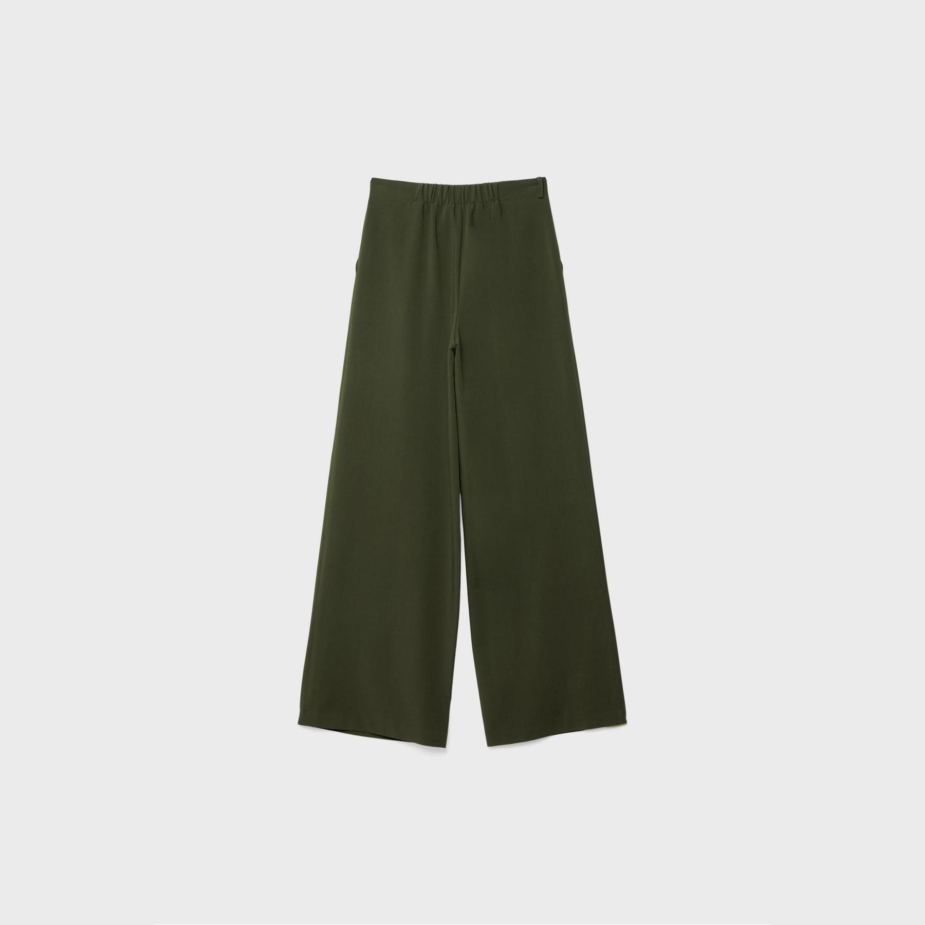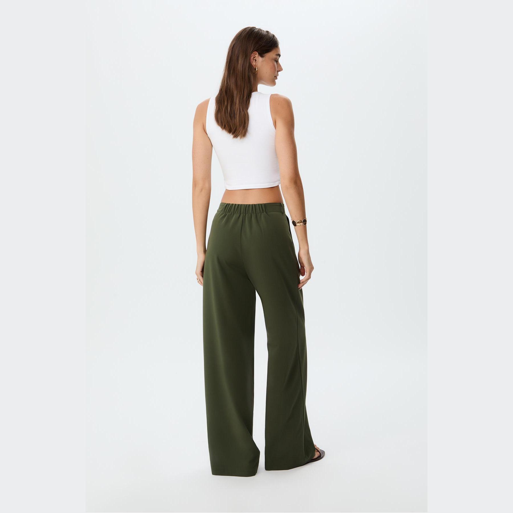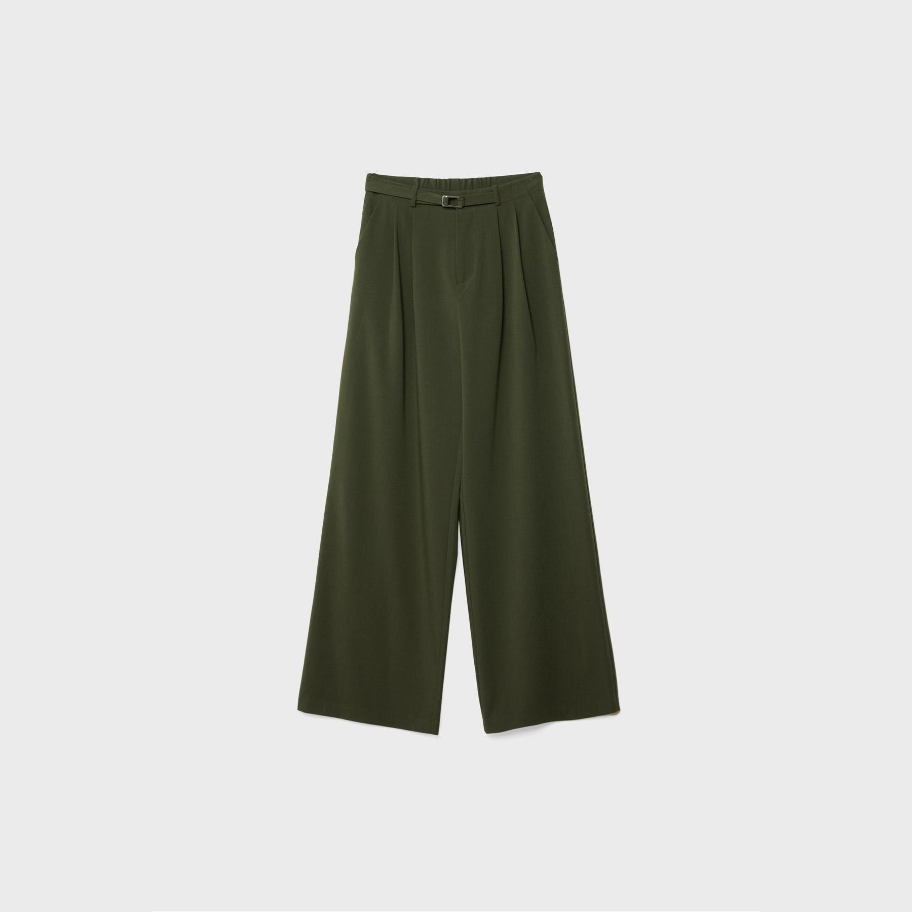 بنطال أنيق من Stradivarius بلون أخضر داكن، مصنوع من خامة مرنة بتركيبة 72% بوليستر، 22% فيسكوز، 6% إيلاستان، يتميز بقصة واسعة، خصر مرتفع مع خصر خلفي مطاطي وتفاصيل إبزيم معدني أمامي قابل للتعديل، إغلاق أمامي بسحاب، زر، دبوس داخلي وكبسة معدنية، مزود بجيبين جانبيين، تصميم سادة مع بنس أمامية، بدون بطانة، ملمس داخلي ناعم، مثالي للتنسيق مع قميص أو بلوزة لإطلالة مكتبية أو كاجوال أنيقة.