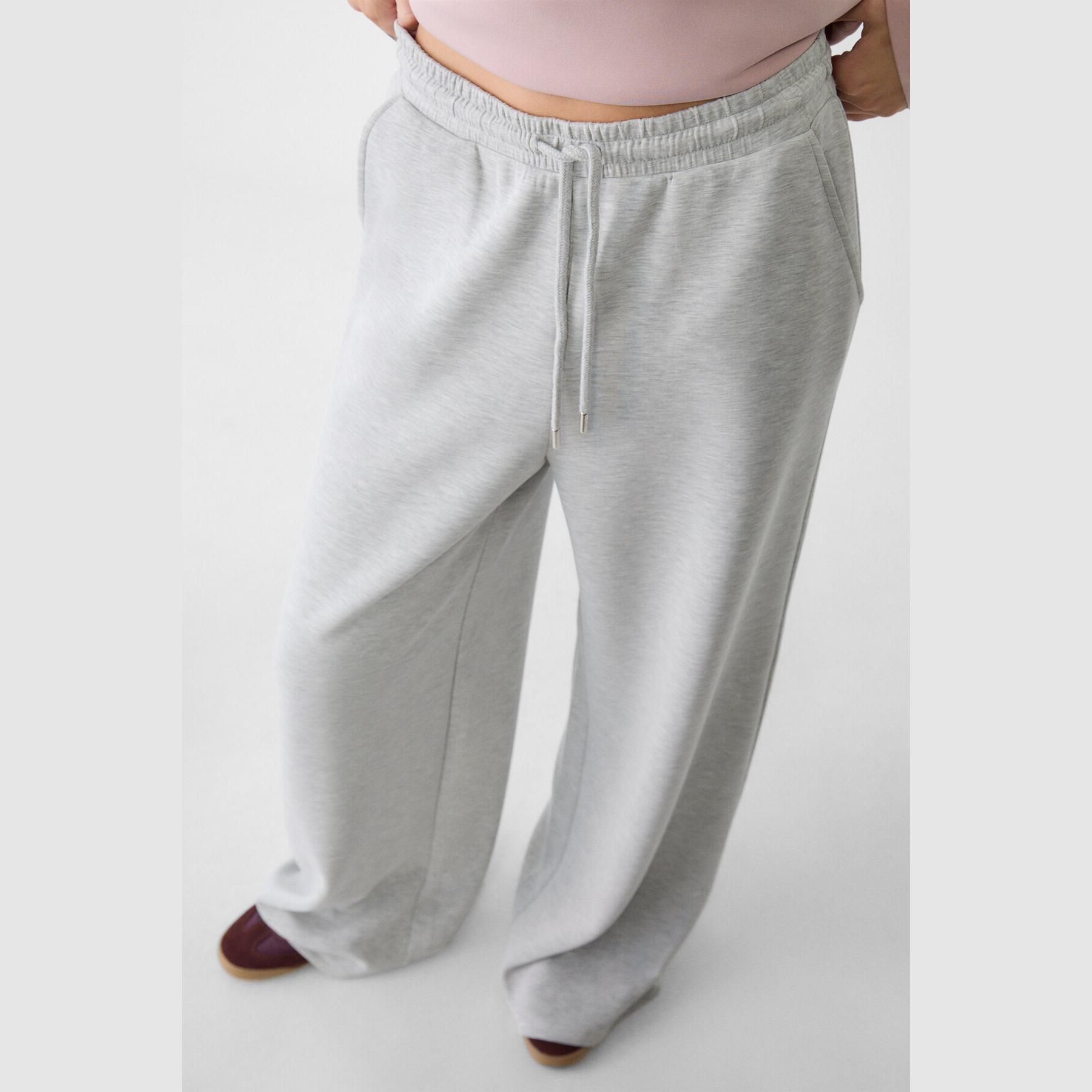 بنطال عملي من Stradivarius بلون رمادي فاتح، مصنوع من خامة ناعمة بتركيبة 49% مودال، 41% بوليستر، 10% إيلاستان، يتميز بقصة Palazzo واسعة، خصر متوسط بخصر مطاطي ورباط داخلي قابل للتعديل، أرجل طويلة وفضفاضة، تصميم سادة بدون طبعات، مزود بجيبين جانبيين، ملمس داخلي ناعم، بدون بطانة، مثالي للتنسيق مع كنزة محبوكة أو تيشيرت لإطلالة كاجوال ناعمة.