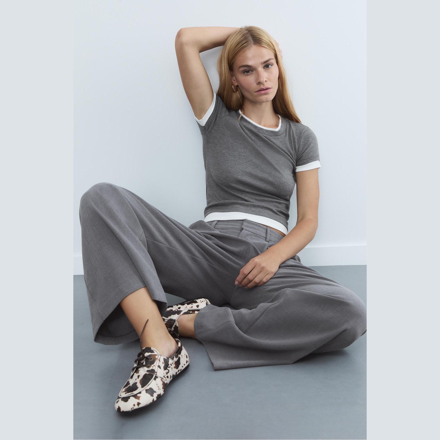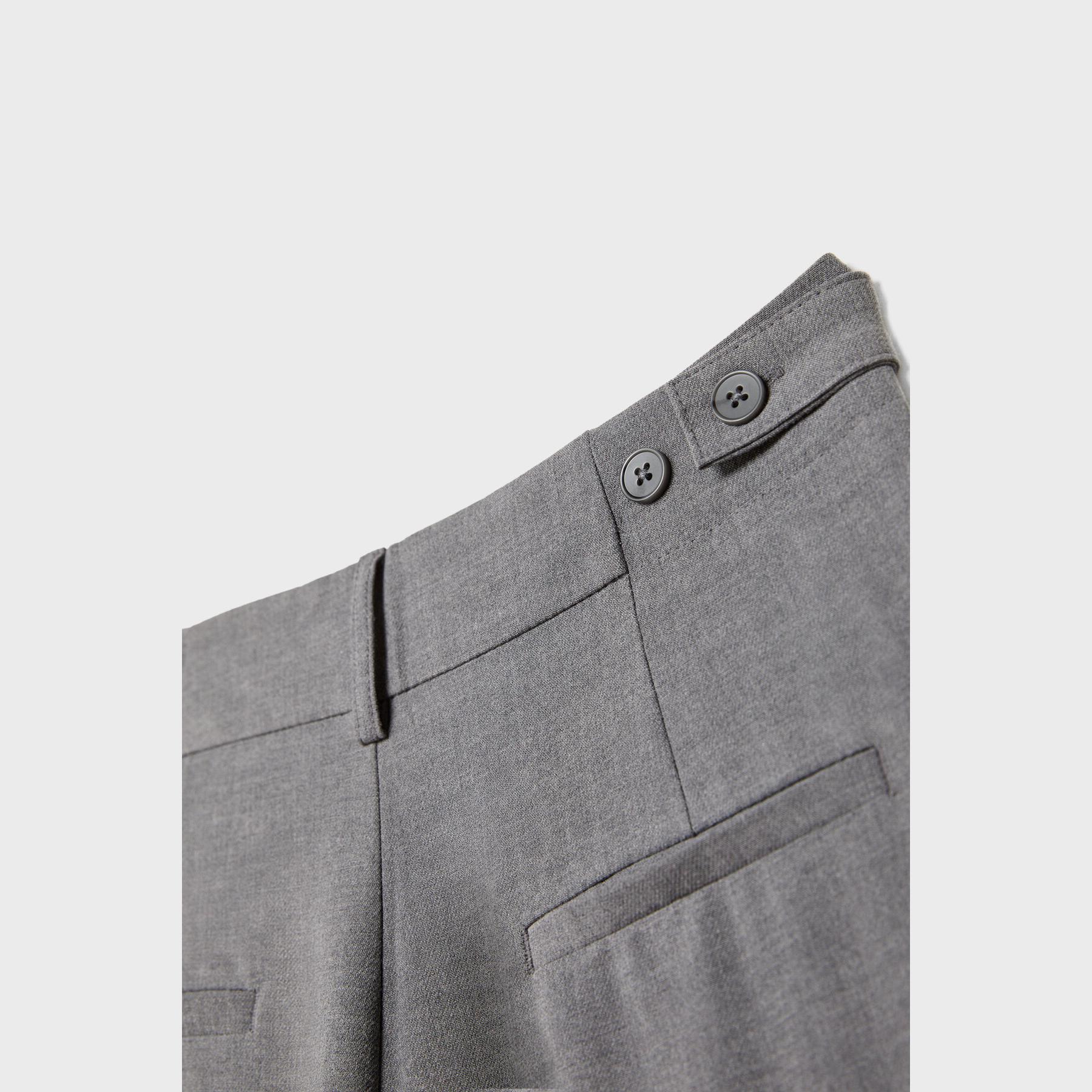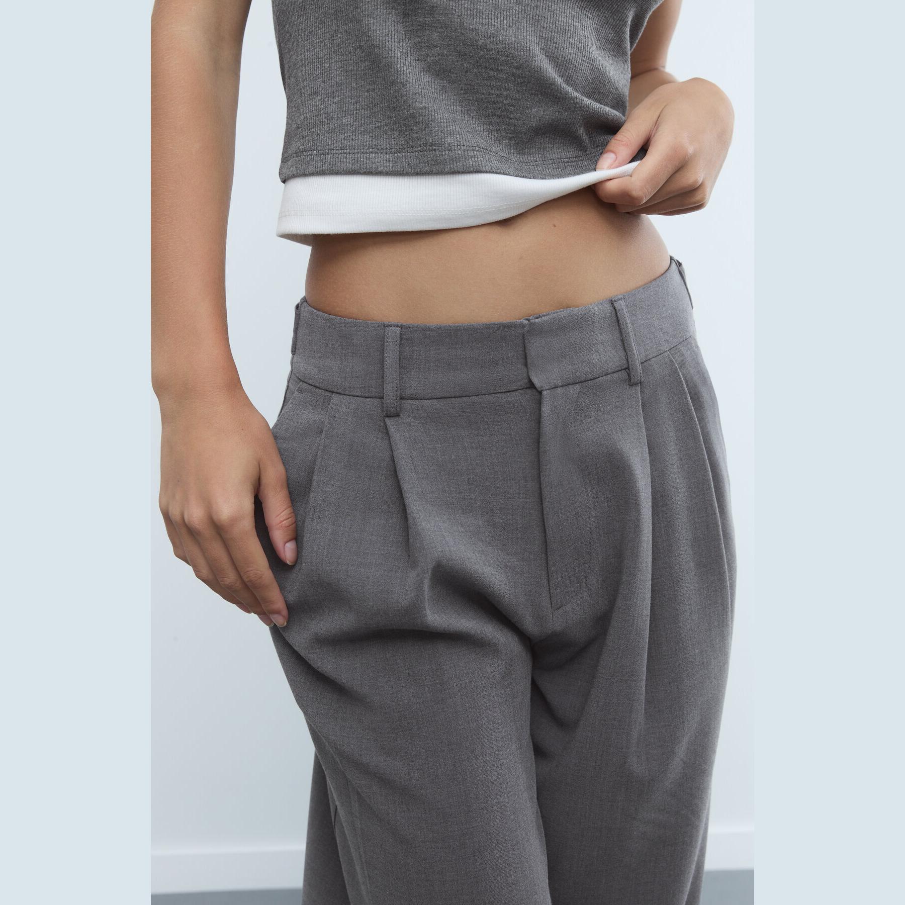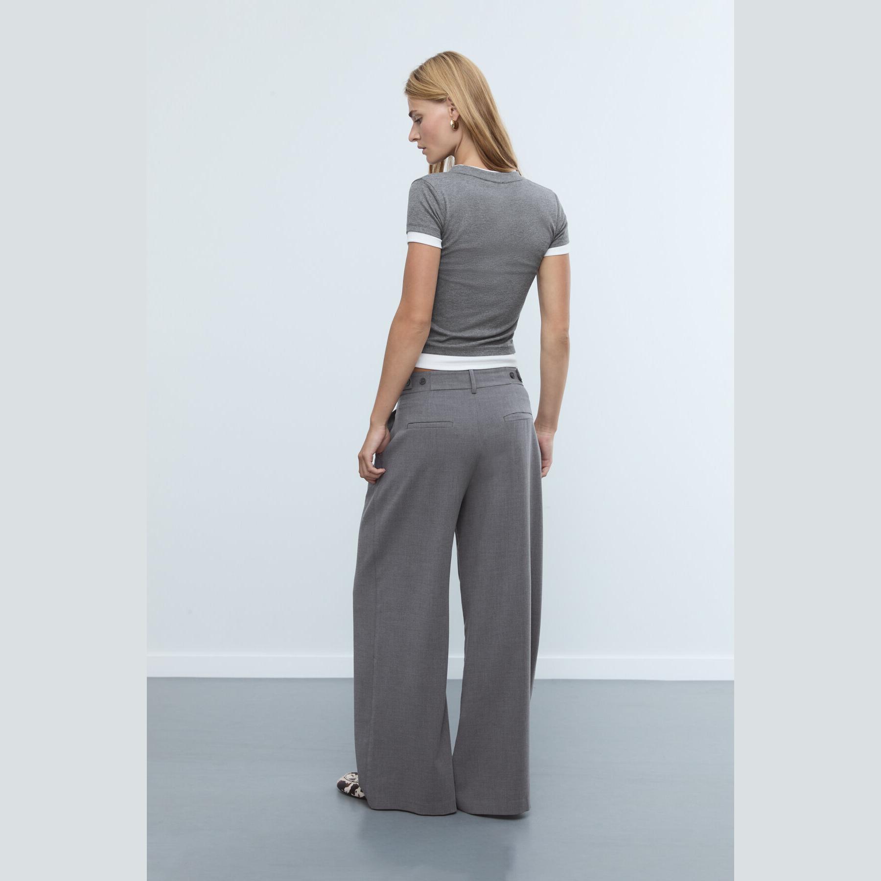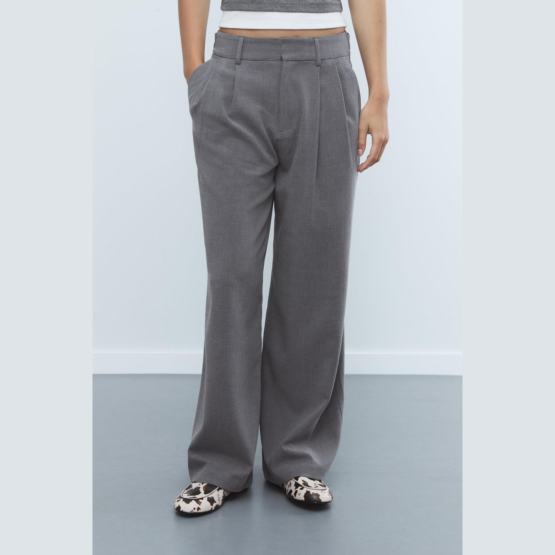 بنطال أنيق من Stradivarius بلون رمادي، مصنوع من خامة مرنة بتركيبة 63% بوليستر، 29% فيسكوز، 8% إيلاستان، يتميز بقصة واسعة جدًا، خصر مرتفع مزود بحلقات للحزام وتفاصيل أزرار قابلة للتعديل، إغلاق أمامي بسحاب، زر، دبوس داخلي وكبسة معدنية، مزود بجيبين جانبيين وجيوب خلفية بفتحة بيّلية، تصميم سادة مع بنس أمامية، بدون بطانة، ملمس داخلي ناعم، مثالي للتنسيق مع قميص أو بلوزة لإطلالة مكتبية أو كاجوال أنيقة.