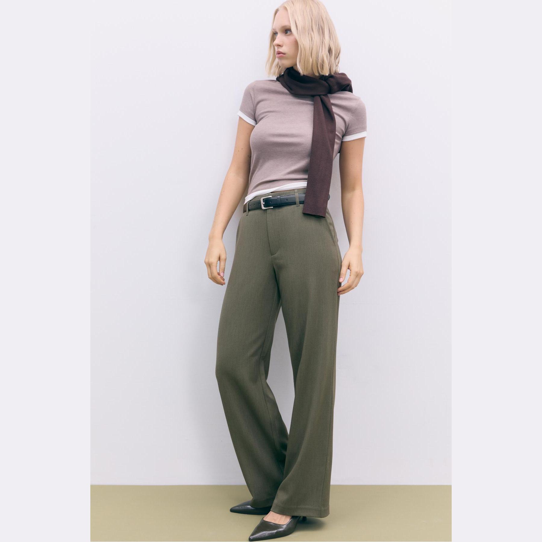 بنطال أنيق من Stradivarius بلون زيتي، مصنوع من خامة مرنة بتركيبة 87% بوليستر، 9% فيسكوز، 4% إيلاستان، يتميز بقصة مستقيمة، خصر مرتفع مزود بحلقات للحزام وحزام معدني قابل للإزالة، إغلاق أمامي بسحاب، زر، دبوس داخلي وكبسة معدنية، مزود بجيبين جانبيين وجيوب خلفية بفتحة بيّلية، تصميم سادة مع بنس أمامية، بدون بطانة، ملمس داخلي ناعم، مثالي للتنسيق مع قميص أو بلوزة لإطلالة مكتبية أو كاجوال أنيقة.