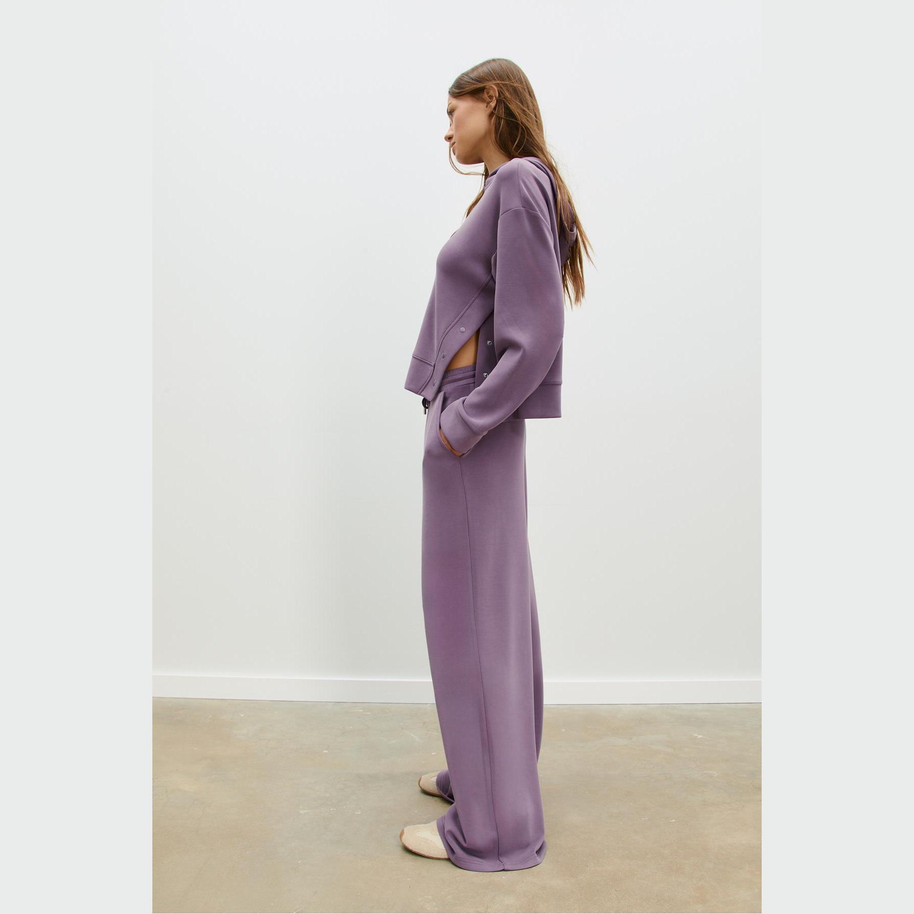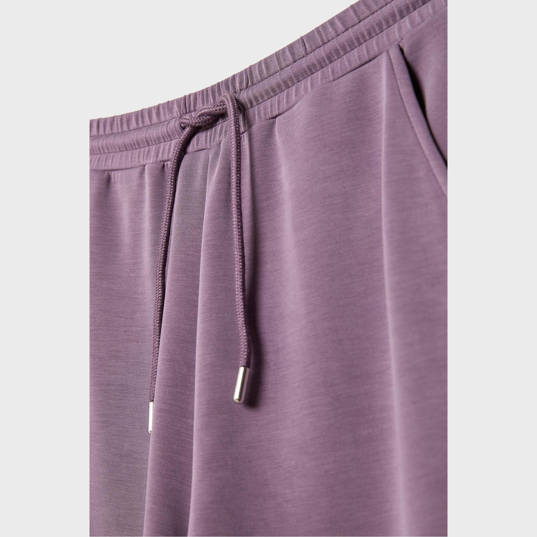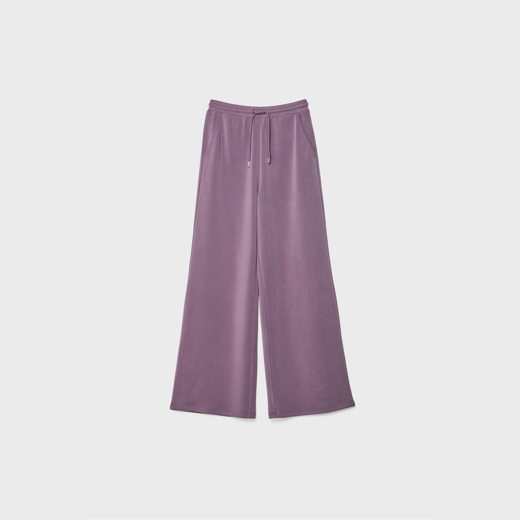 بنطال عملي من Stradivarius بلون بنفسجي، مصنوع من خامة ناعمة بتركيبة 49% مودال، 41% بوليستر، 10% إيلاستان، يتميز بقصة Palazzo واسعة، خصر عادي بخصر مطاطي ورباط داخلي قابل للتعديل، أرجل طويلة وفضفاضة، تصميم سادة بدون طبعات، مزود بجيبين جانبيين، ملمس داخلي ناعم، بدون بطانة، مثالي للتنسيق مع كنزة محبوكة أو تيشيرت لإطلالة كاجوال ناعمة.