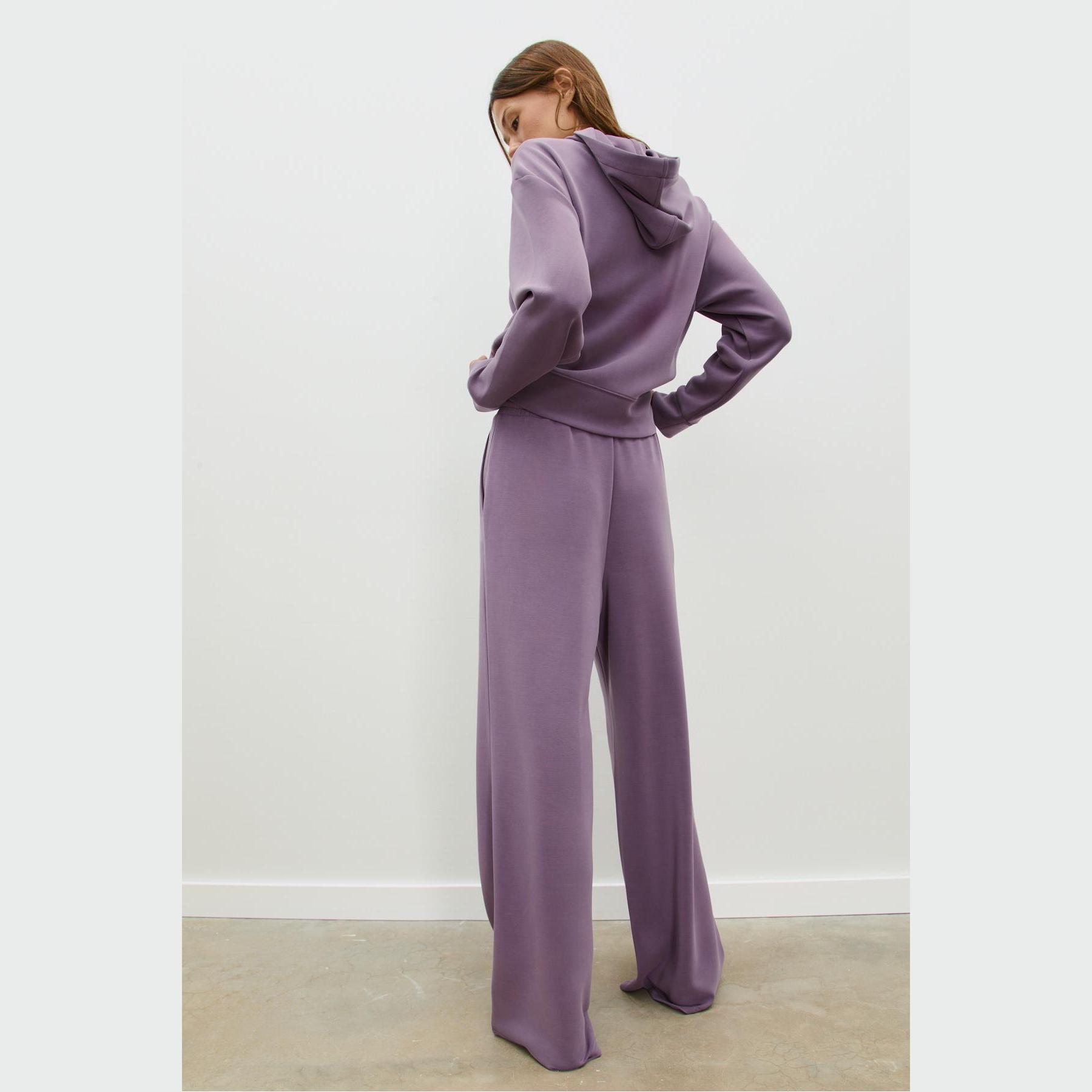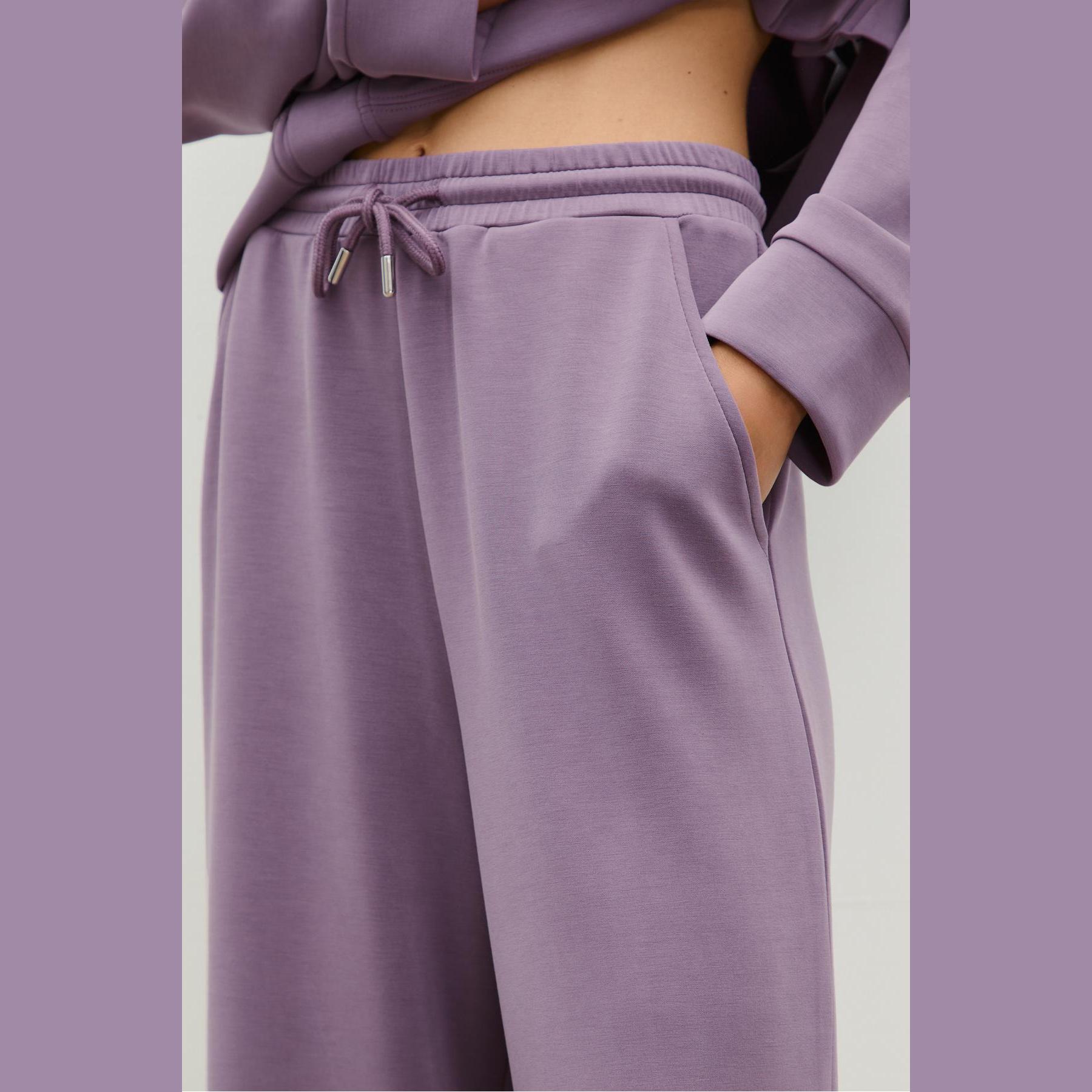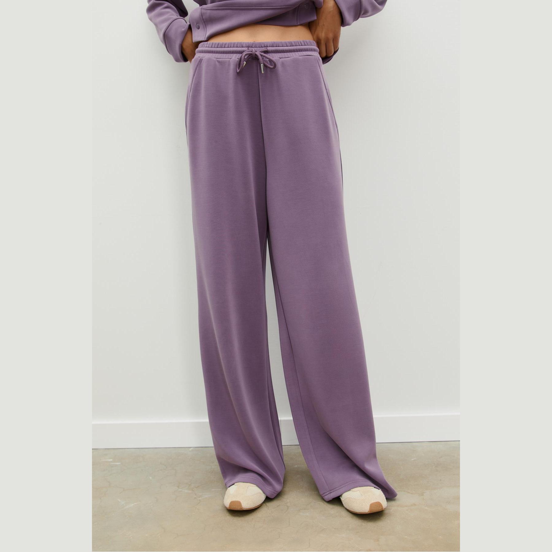 بنطال عملي من Stradivarius بلون بنفسجي، مصنوع من خامة ناعمة بتركيبة 49% مودال، 41% بوليستر، 10% إيلاستان، يتميز بقصة Palazzo واسعة، خصر عادي بخصر مطاطي ورباط داخلي قابل للتعديل، أرجل طويلة وفضفاضة، تصميم سادة بدون طبعات، مزود بجيبين جانبيين، ملمس داخلي ناعم، بدون بطانة، مثالي للتنسيق مع كنزة محبوكة أو تيشيرت لإطلالة كاجوال ناعمة.