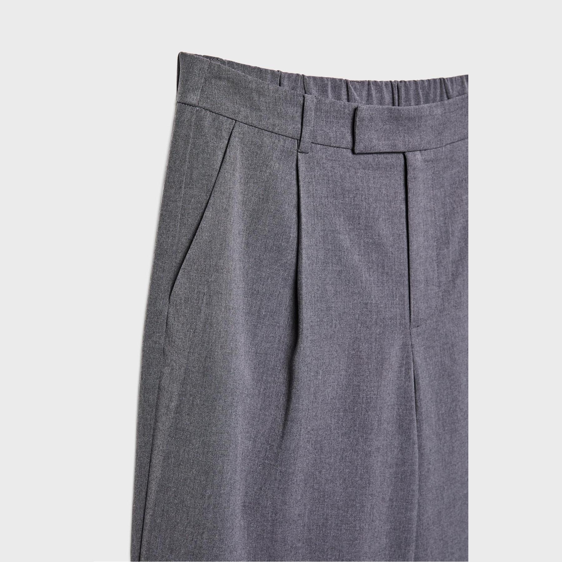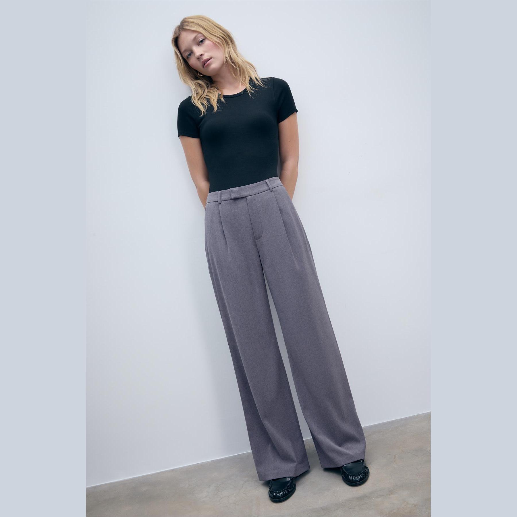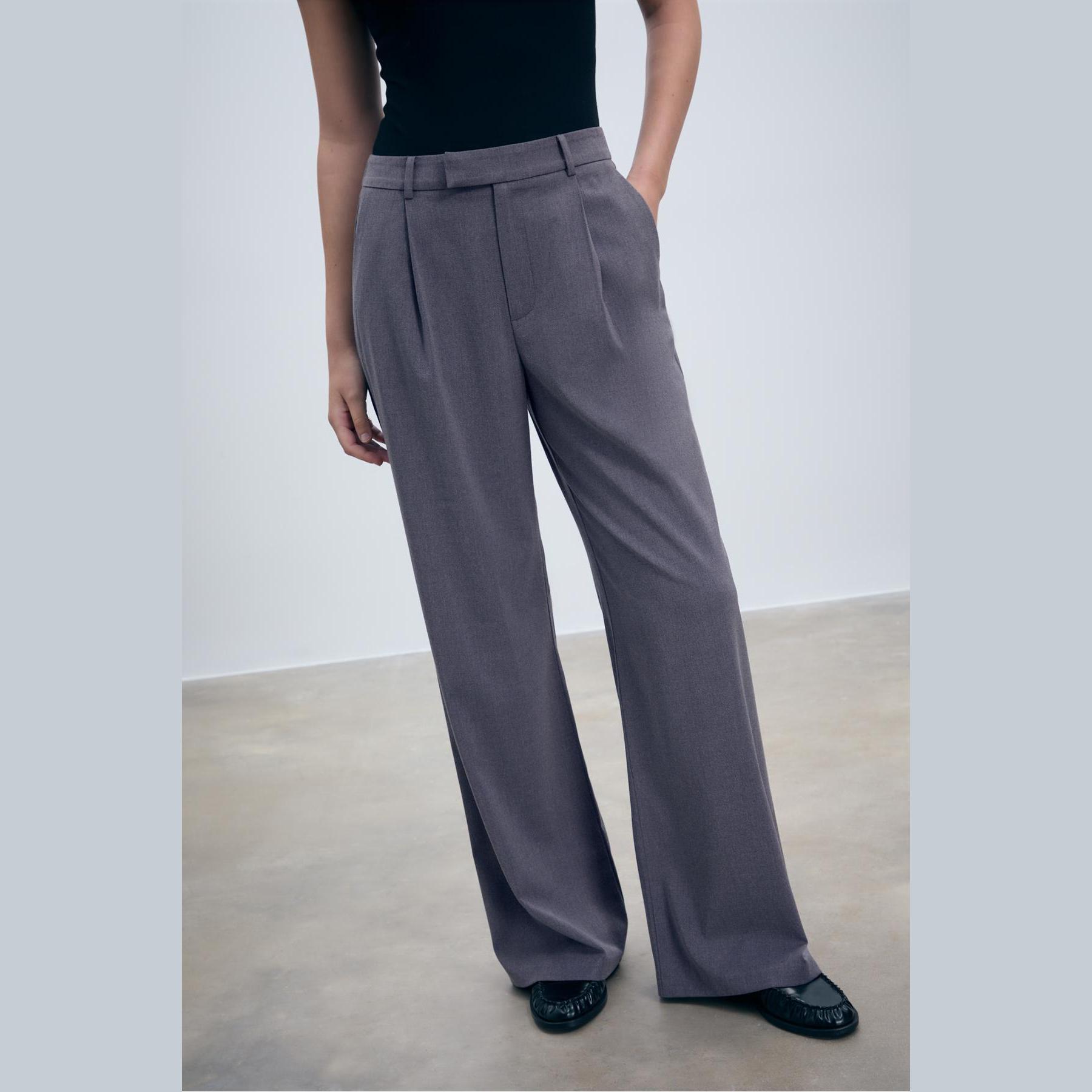 بنطال أنيق من Stradivarius بلون رمادي، مصنوع من خامة ناعمة بتركيبة 65% بوليستر، 33% فيسكوز، 2% إيلاستان، يتميز بقصة واسعة مستقيمة، خصر عادي مع خصر خلفي مطاطي وحلقات للحزام، إغلاق أمامي بسحاب كامل، زر، دبوس داخلي وكبسة معدنية، مزود بجيبين جانبيين، تصميم سادة مع بنس أمامية، بدون بطانة، ملمس داخلي ناعم، مثالي للتنسيق مع قميص أو بلوزة لإطلالة مكتبية أو كاجوال أنيقة.