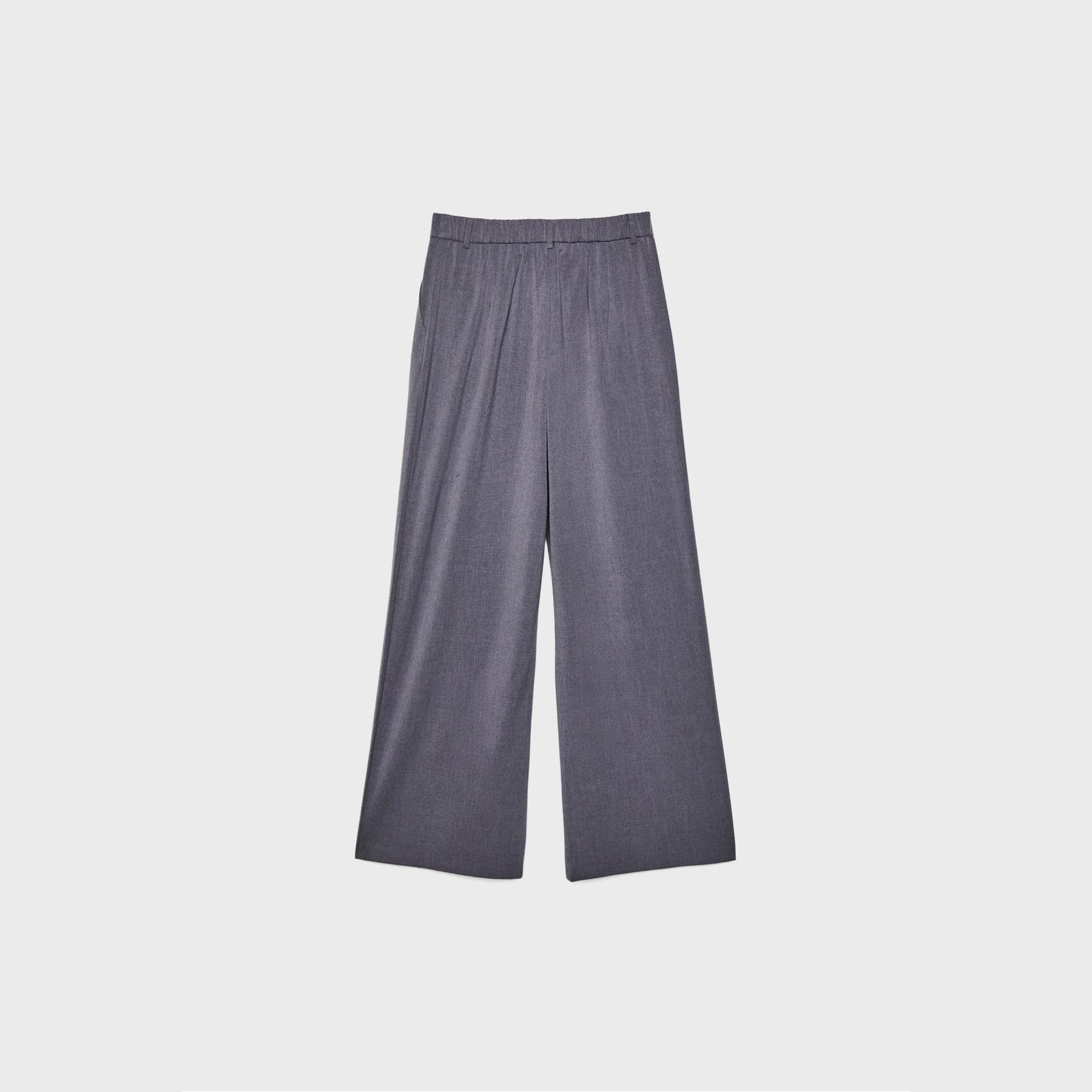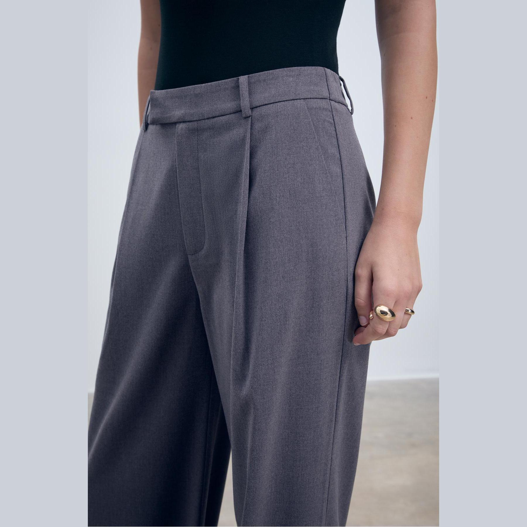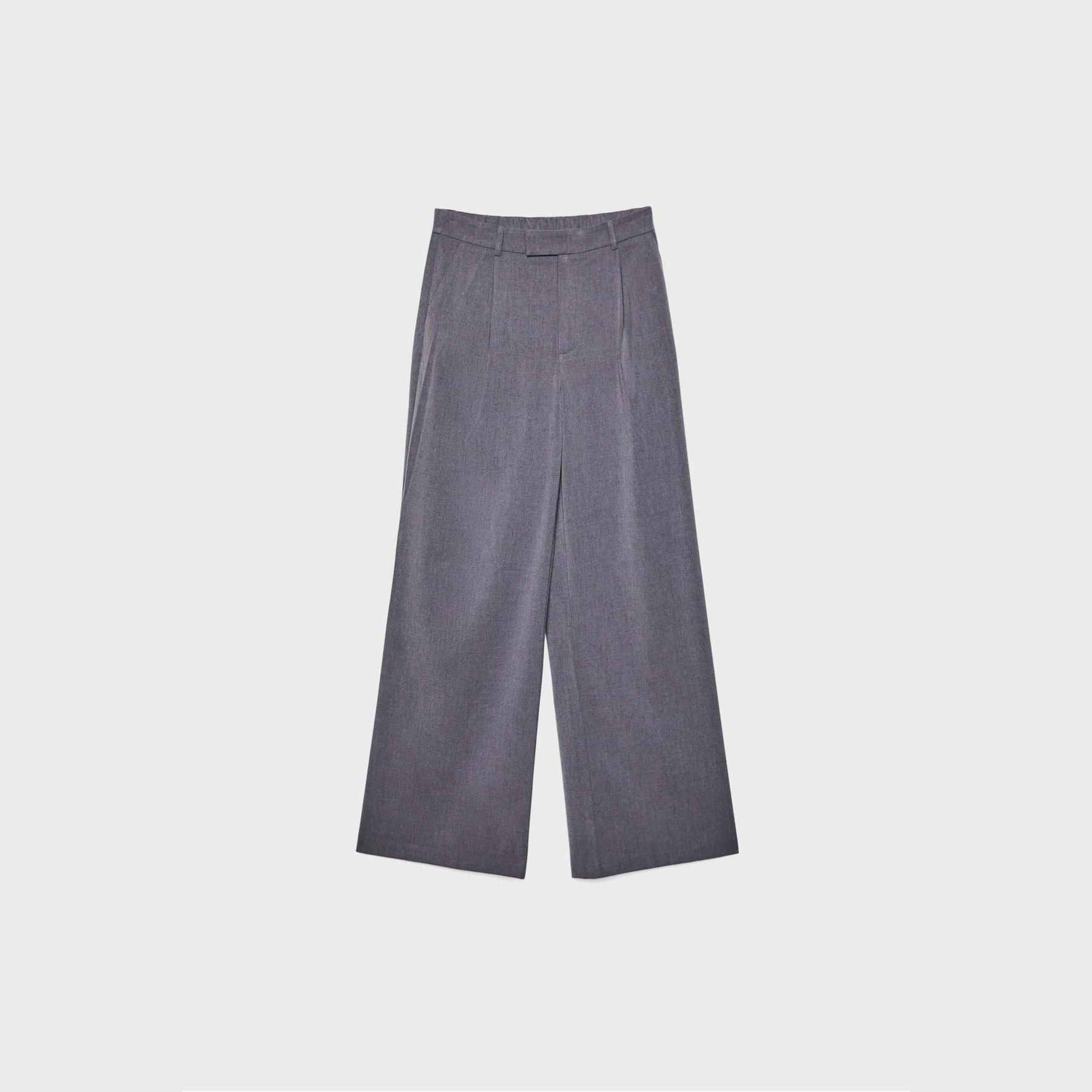 بنطال أنيق من Stradivarius بلون رمادي، مصنوع من خامة ناعمة بتركيبة 65% بوليستر، 33% فيسكوز، 2% إيلاستان، يتميز بقصة واسعة مستقيمة، خصر عادي مع خصر خلفي مطاطي وحلقات للحزام، إغلاق أمامي بسحاب كامل، زر، دبوس داخلي وكبسة معدنية، مزود بجيبين جانبيين، تصميم سادة مع بنس أمامية، بدون بطانة، ملمس داخلي ناعم، مثالي للتنسيق مع قميص أو بلوزة لإطلالة مكتبية أو كاجوال أنيقة.