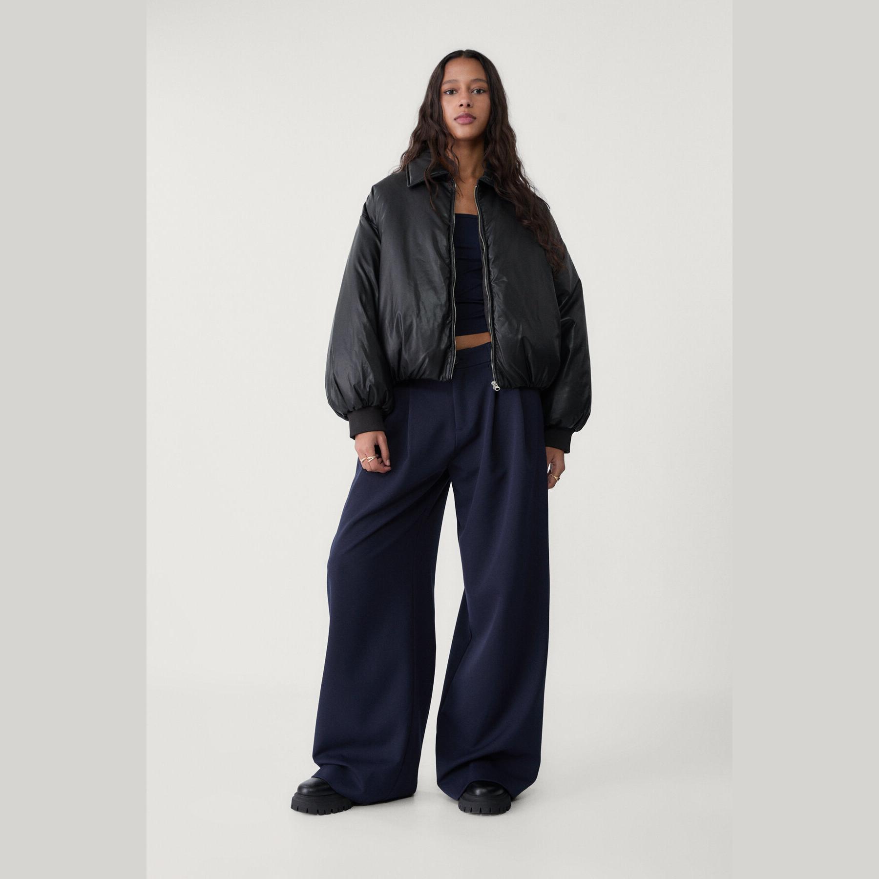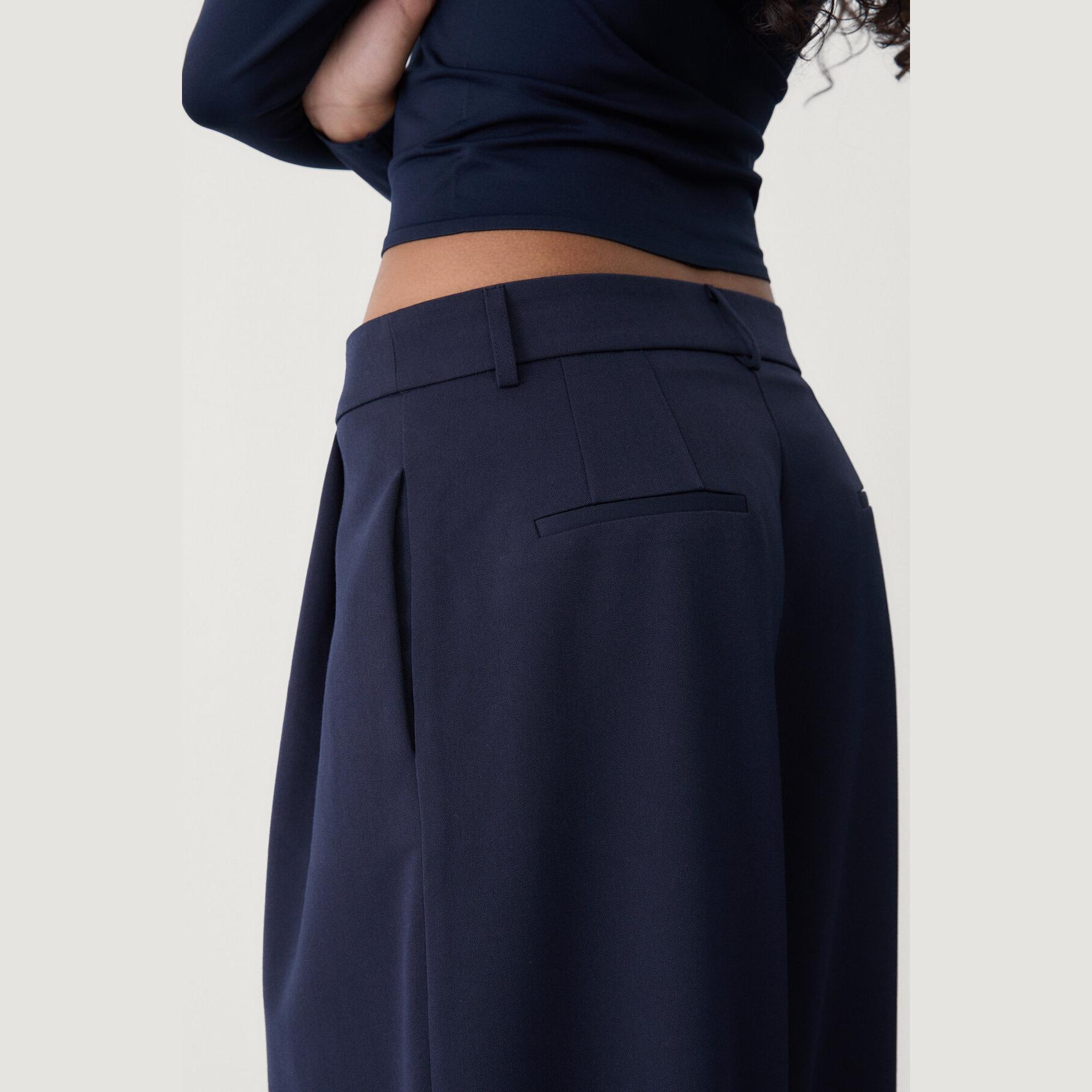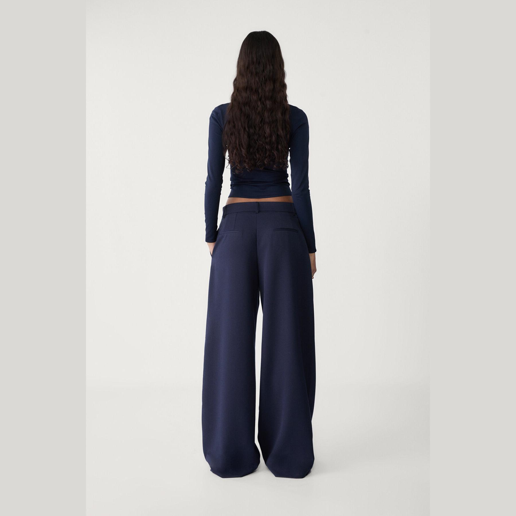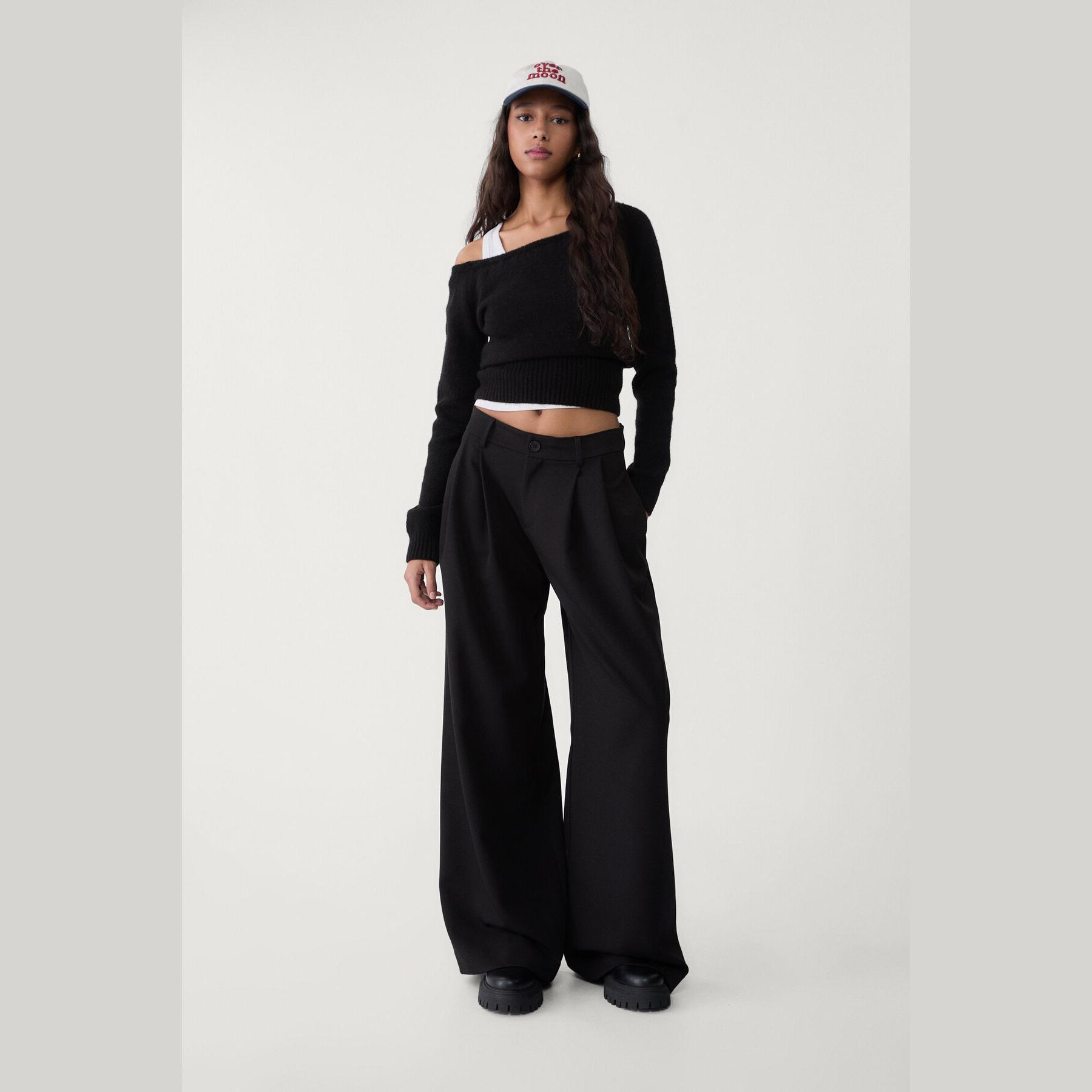 بنطال أنيق من Stradivarius بلون كحلي، مصنوع من خامة مرنة بتركيبة 79% بوليستر، 17% فيسكوز، 4% إيلاستان، يتميز بقصة مستقيمة واسعة، خصر متوسط مزود بحلقات للحزام، إغلاق أمامي بسحاب وزر، دبوس داخلي وكبسة معدنية، مزود بجيبين جانبيين وجيوب خلفية بفتحة بيّلية، تصميم سادة مع بنس أمامية تضيف طابعًا كلاسيكيًا، بدون بطانة، ملمس داخلي ناعم، مثالي للتنسيق مع قميص أو بلوزة لإطلالة مكتبية أو كاجوال أنيقة.
